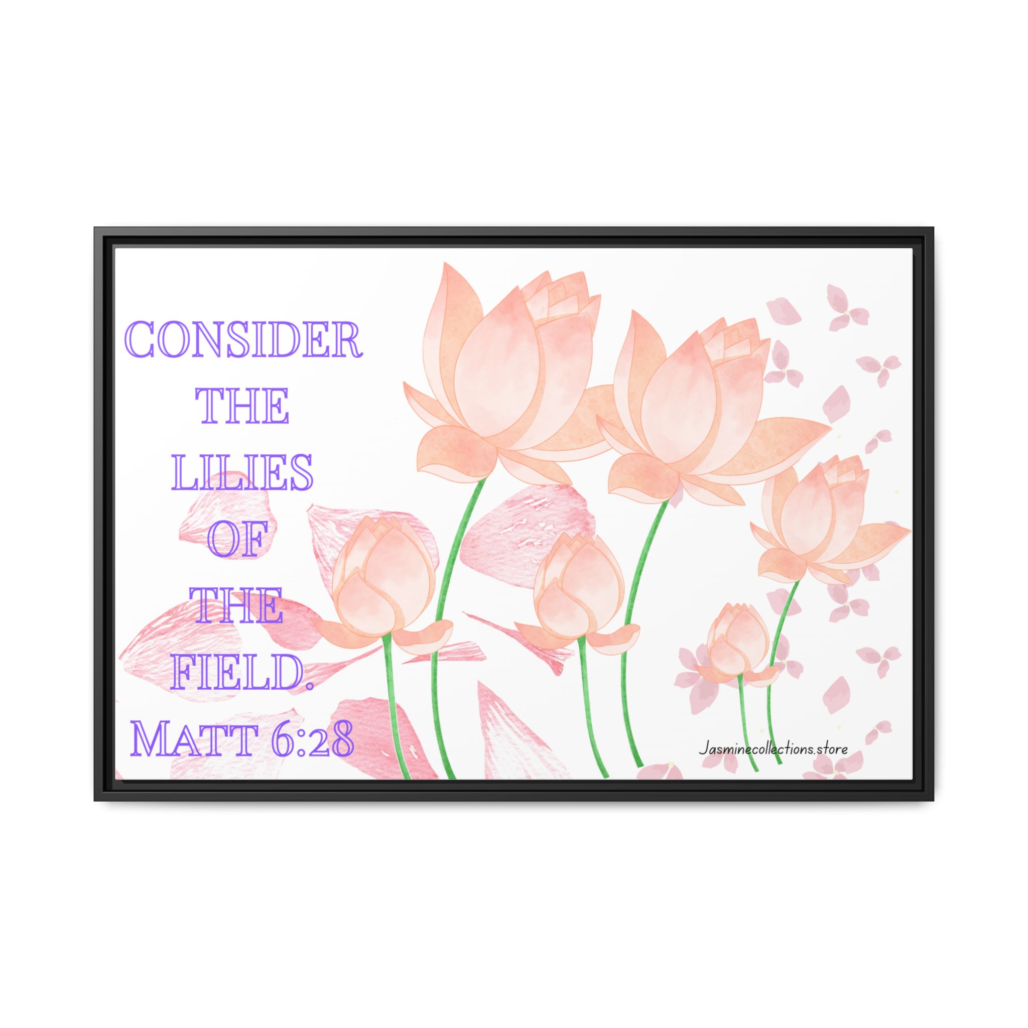 Canvas Wall Art – “Consider the Lilies of the Field” Floral Bible Verse (Matthew 6:28)