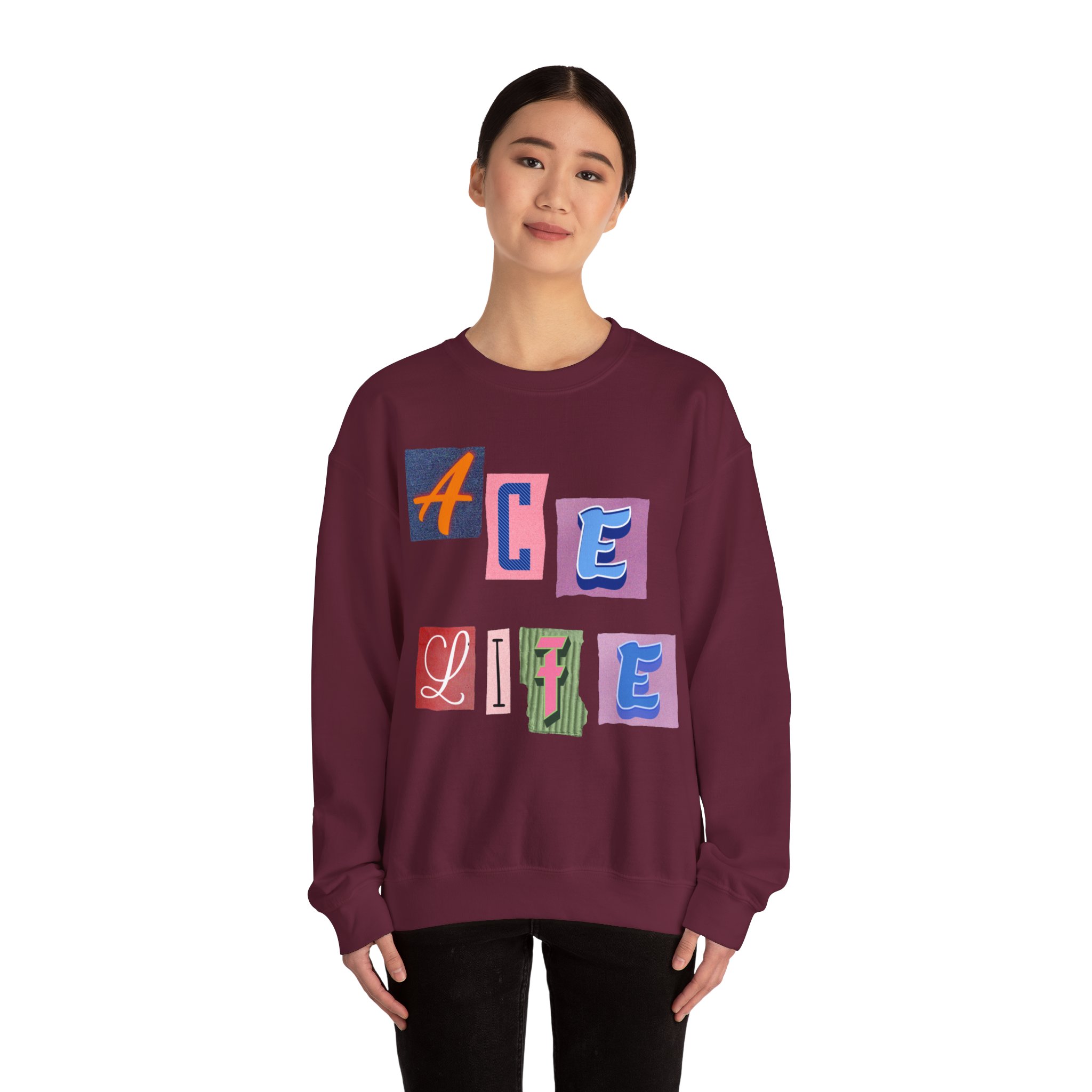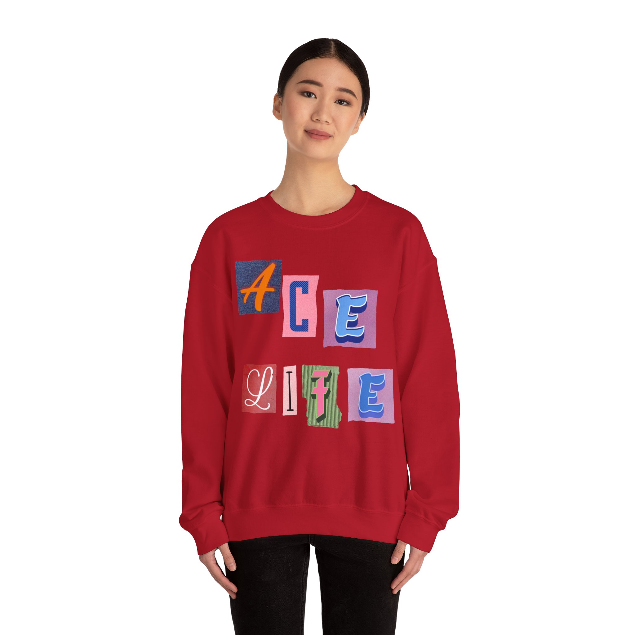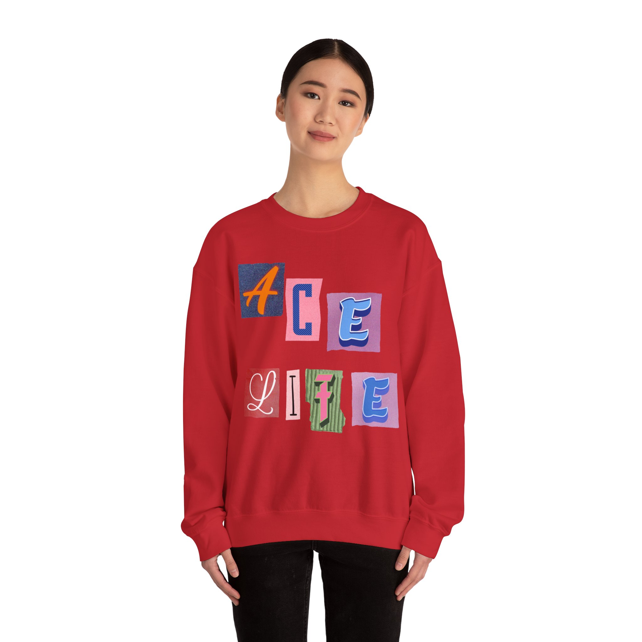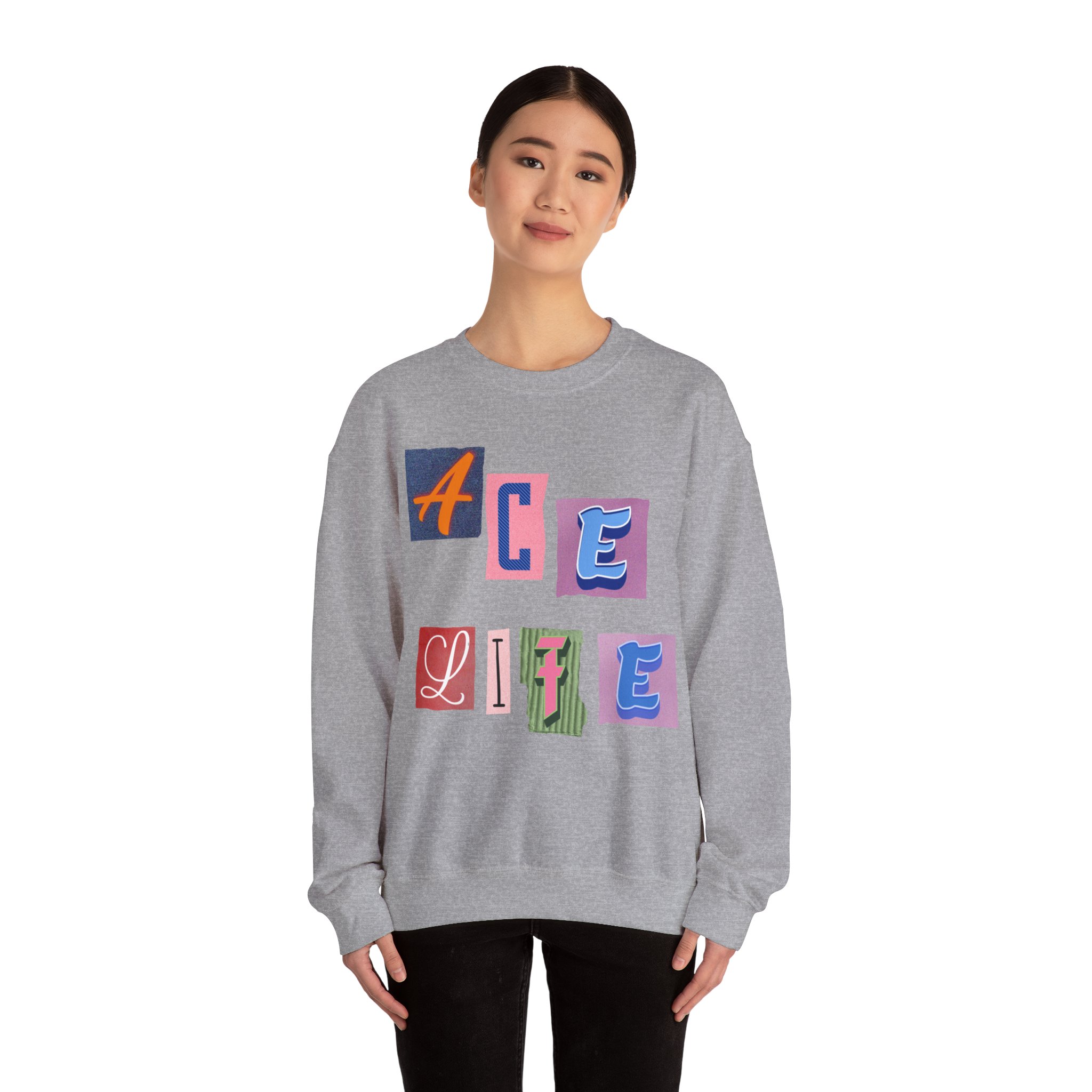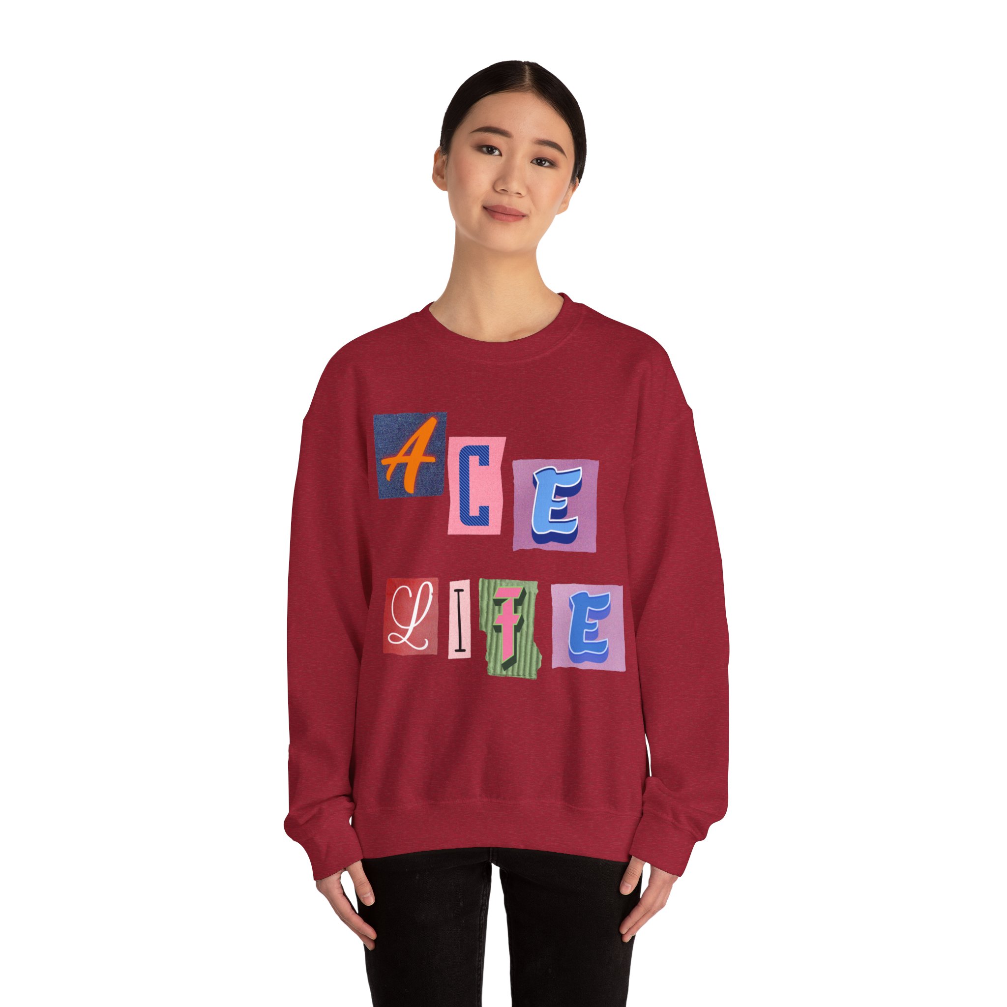 This cozy crewneck sweatshirt carries a playful, collage-style graphic that reads “ACE LIFE” in colorful, mismatched letter blocks. The medium-heavy cotton-poly blend feels warm and substantial without weighing you down. Classic crewneck lines, ribbed collar and cuffs, and tubular knit construction keep the silhouette clean and comfortable. It drapes easily for laid-back days at campus, meetups with friends, or chill evenings at home. The artful, slightly retro letterforms give the piece a nostalgic, creative vibe — an effortless way to show off personal flair while staying snug.