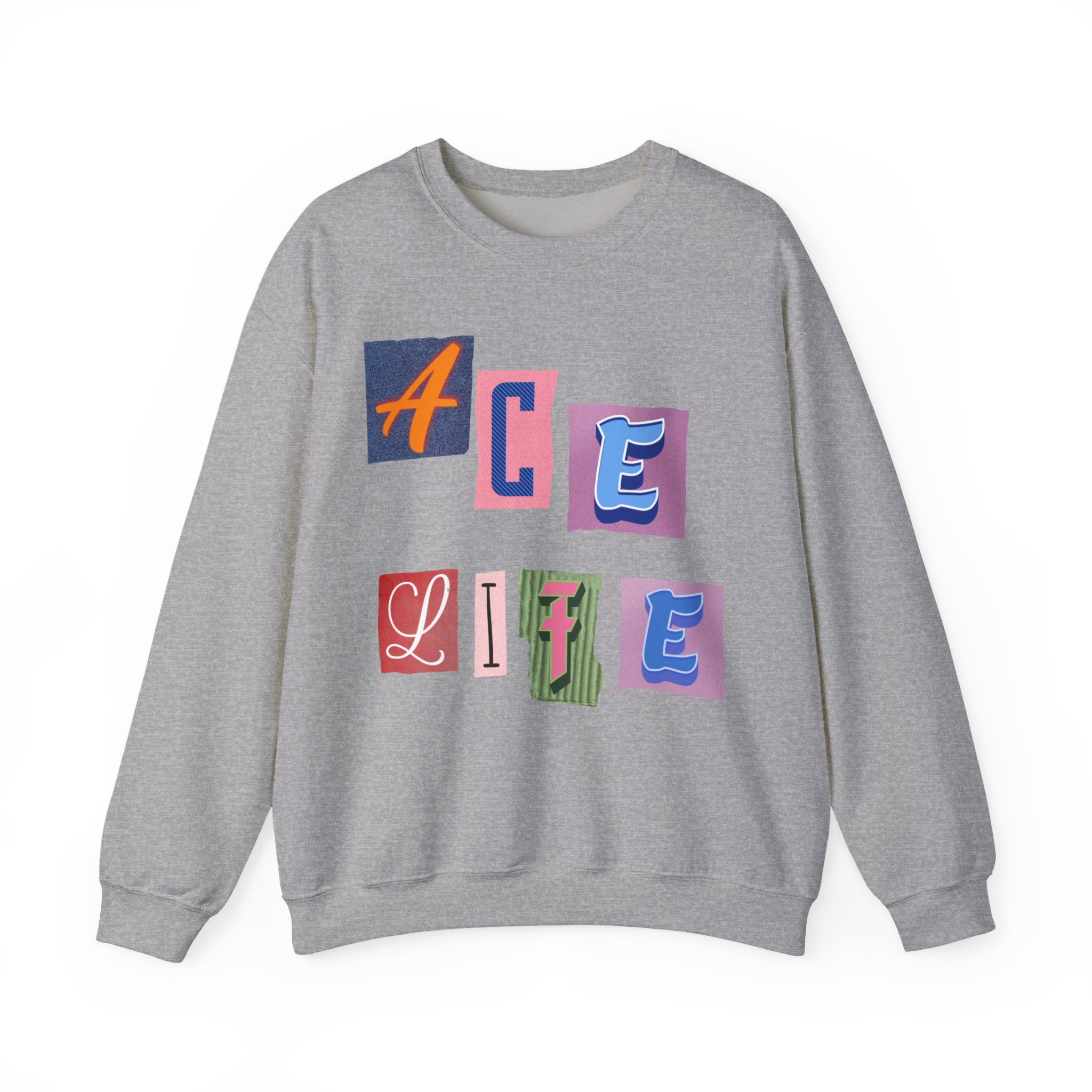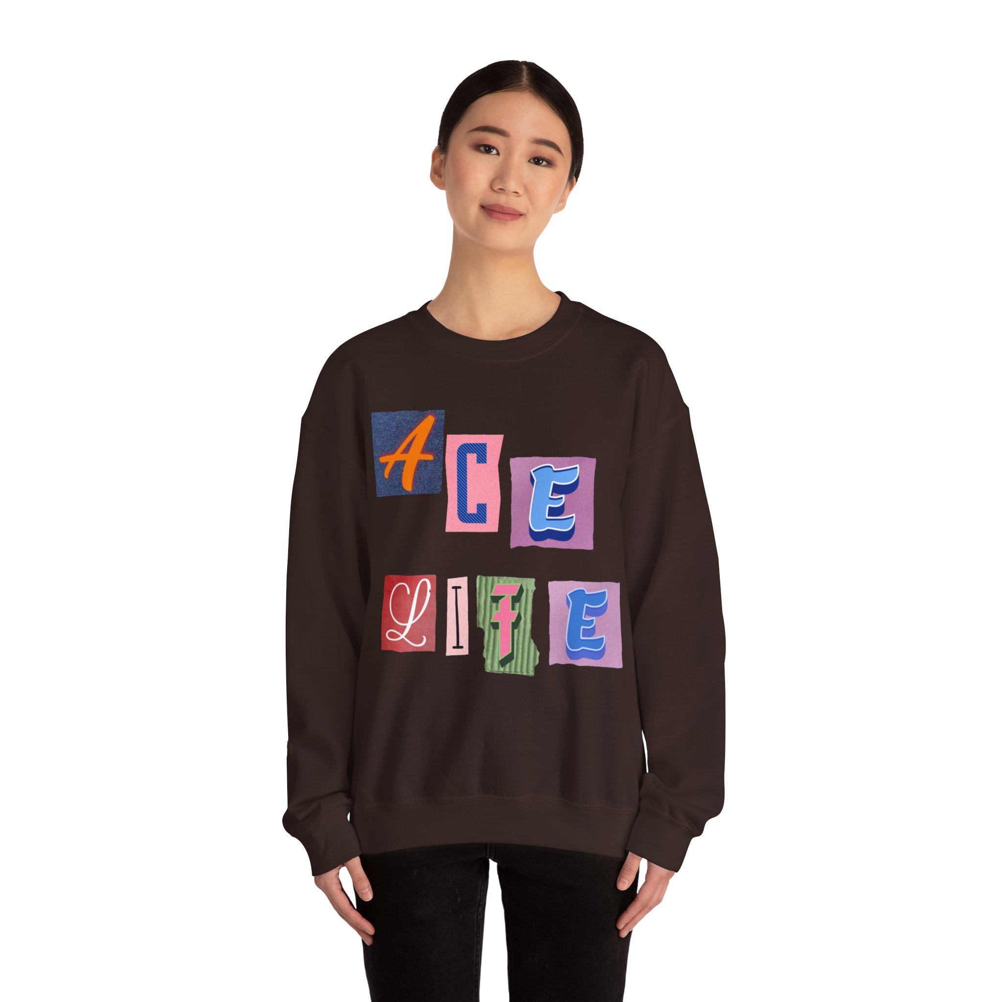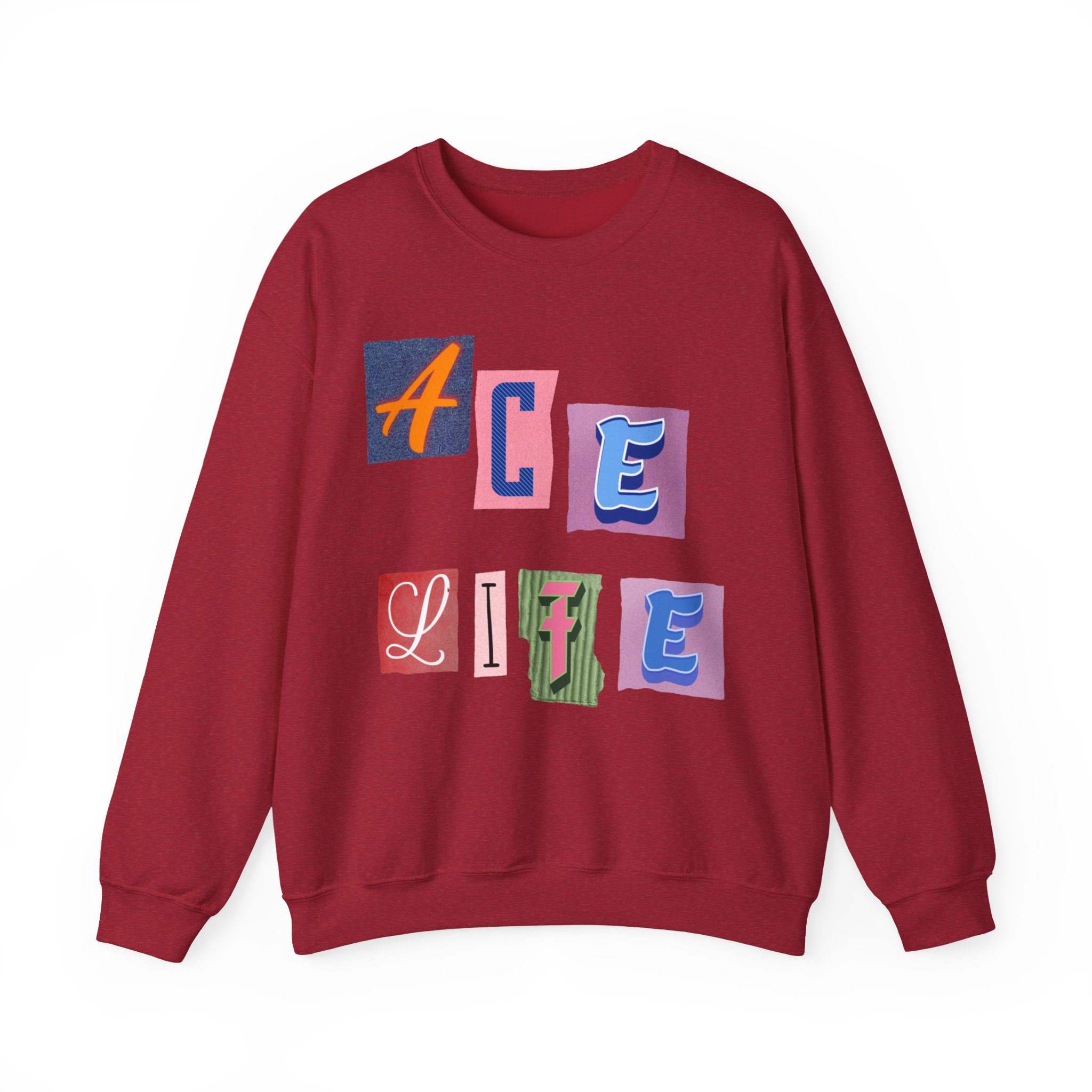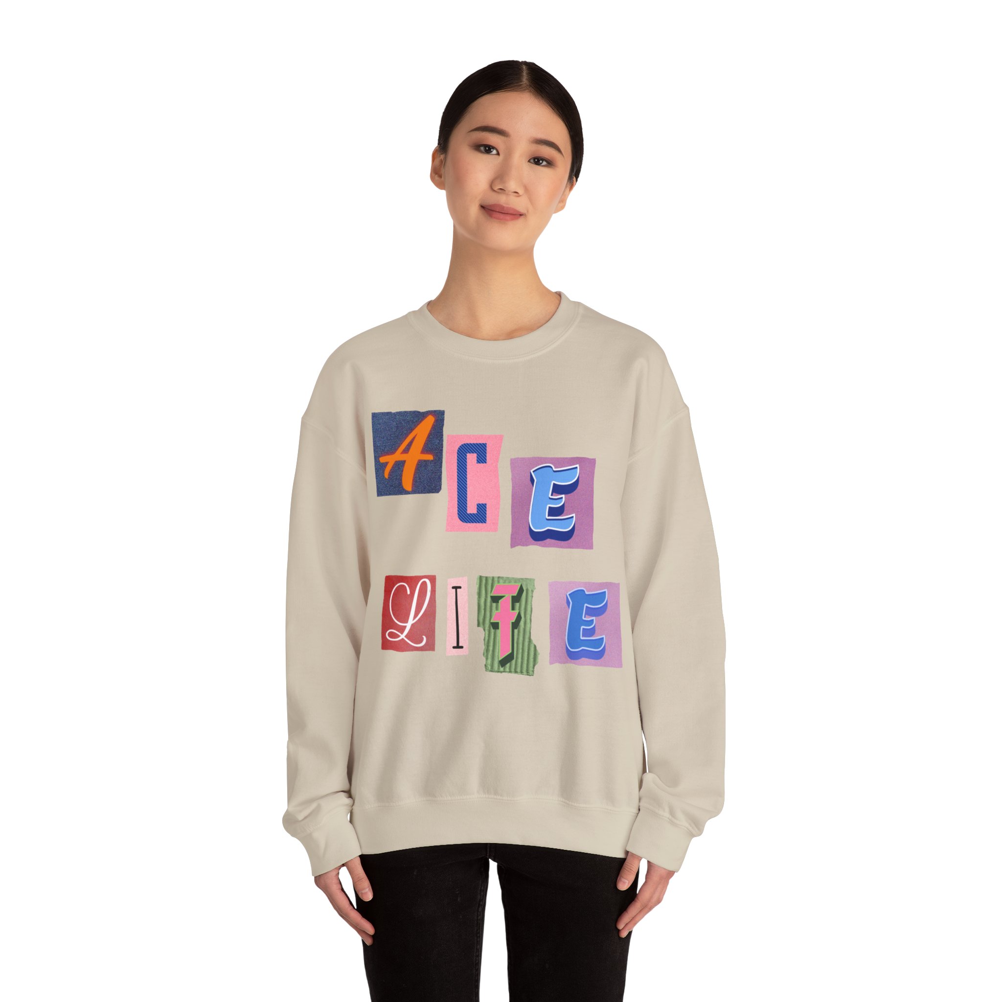 This cozy crewneck sweatshirt carries a playful, collage-style graphic that reads “ACE LIFE” in colorful, mismatched letter blocks. The medium-heavy cotton-poly blend feels warm and substantial without weighing you down. Classic crewneck lines, ribbed collar and cuffs, and tubular knit construction keep the silhouette clean and comfortable. It drapes easily for laid-back days at campus, meetups with friends, or chill evenings at home. The artful, slightly retro letterforms give the piece a nostalgic, creative vibe — an effortless way to show off personal flair while staying snug.