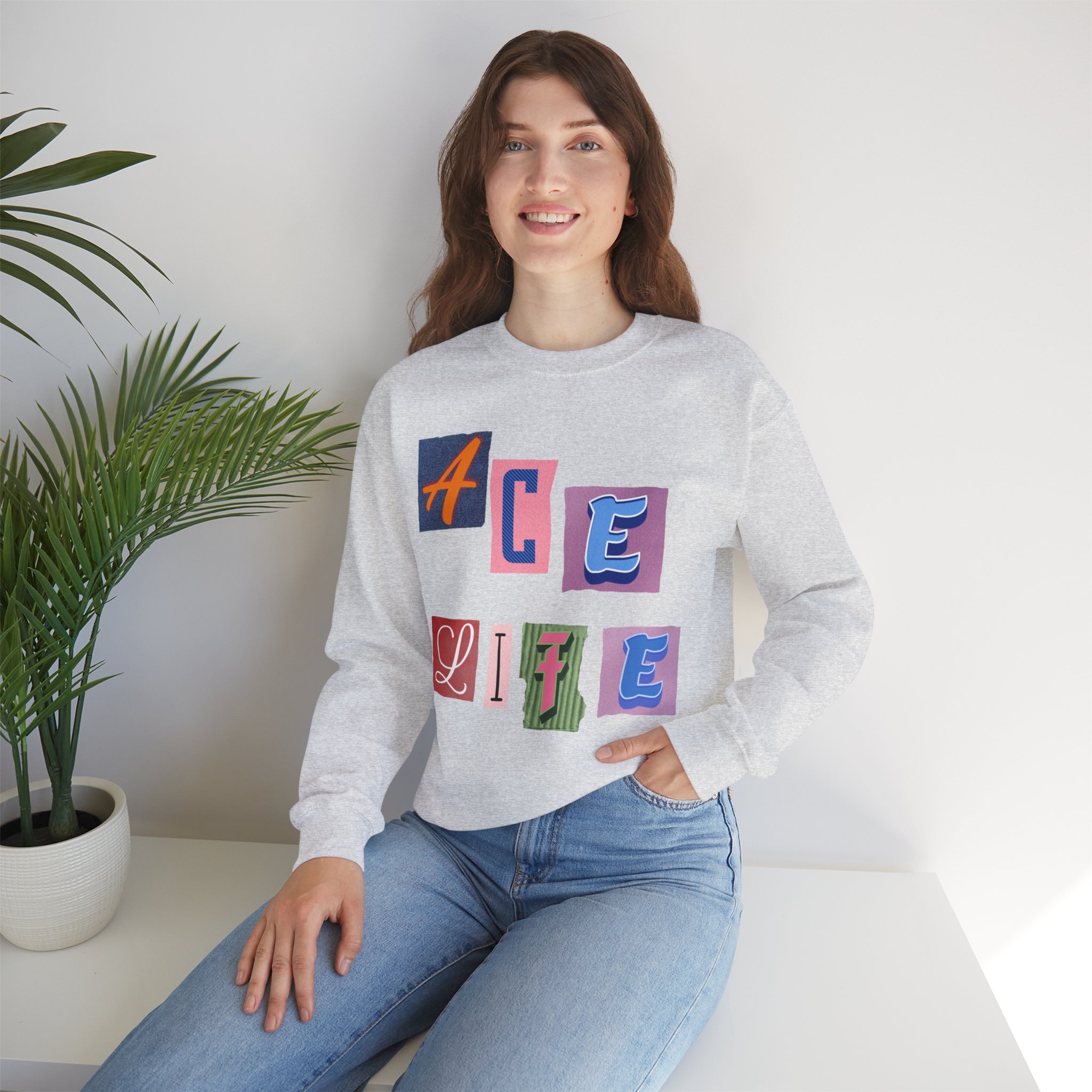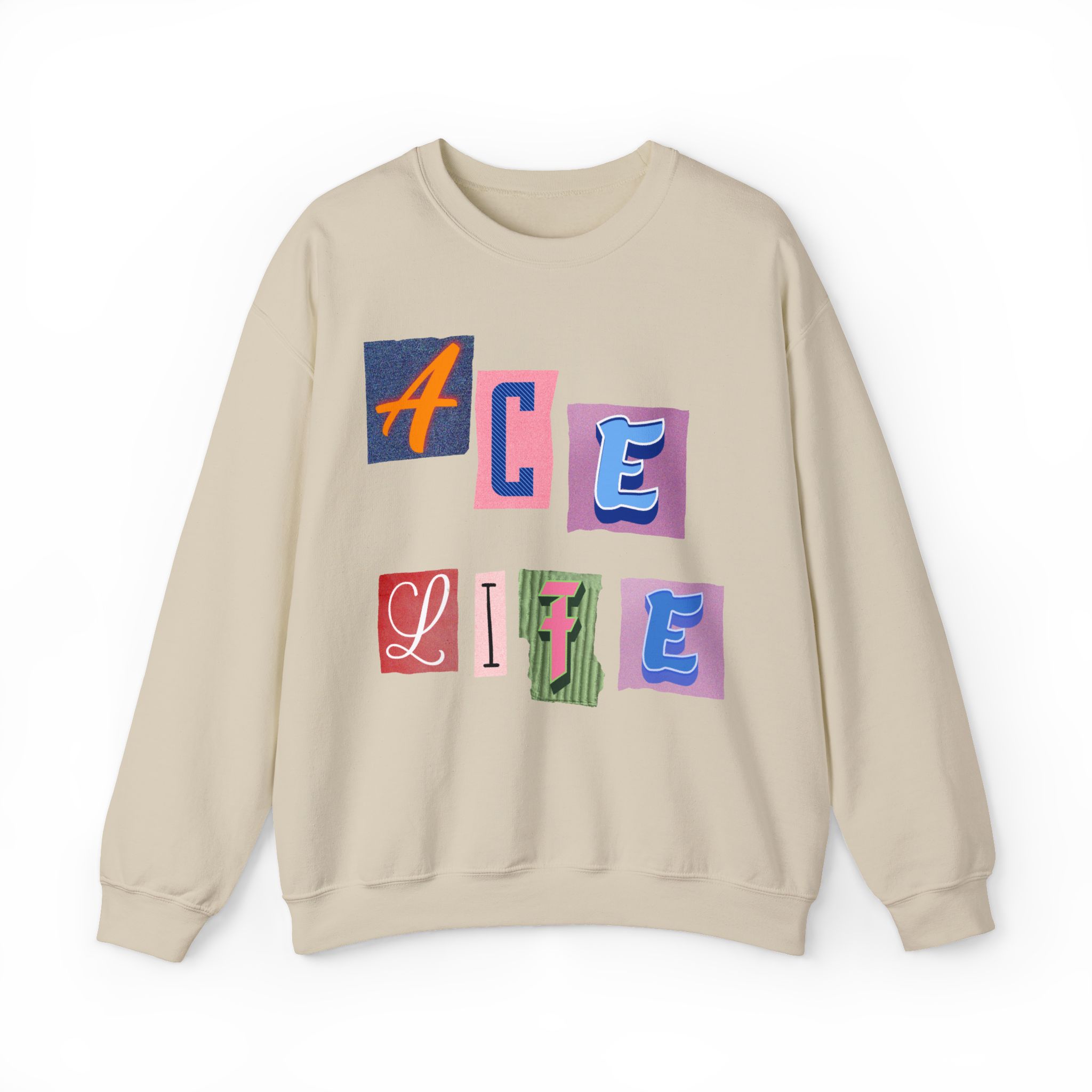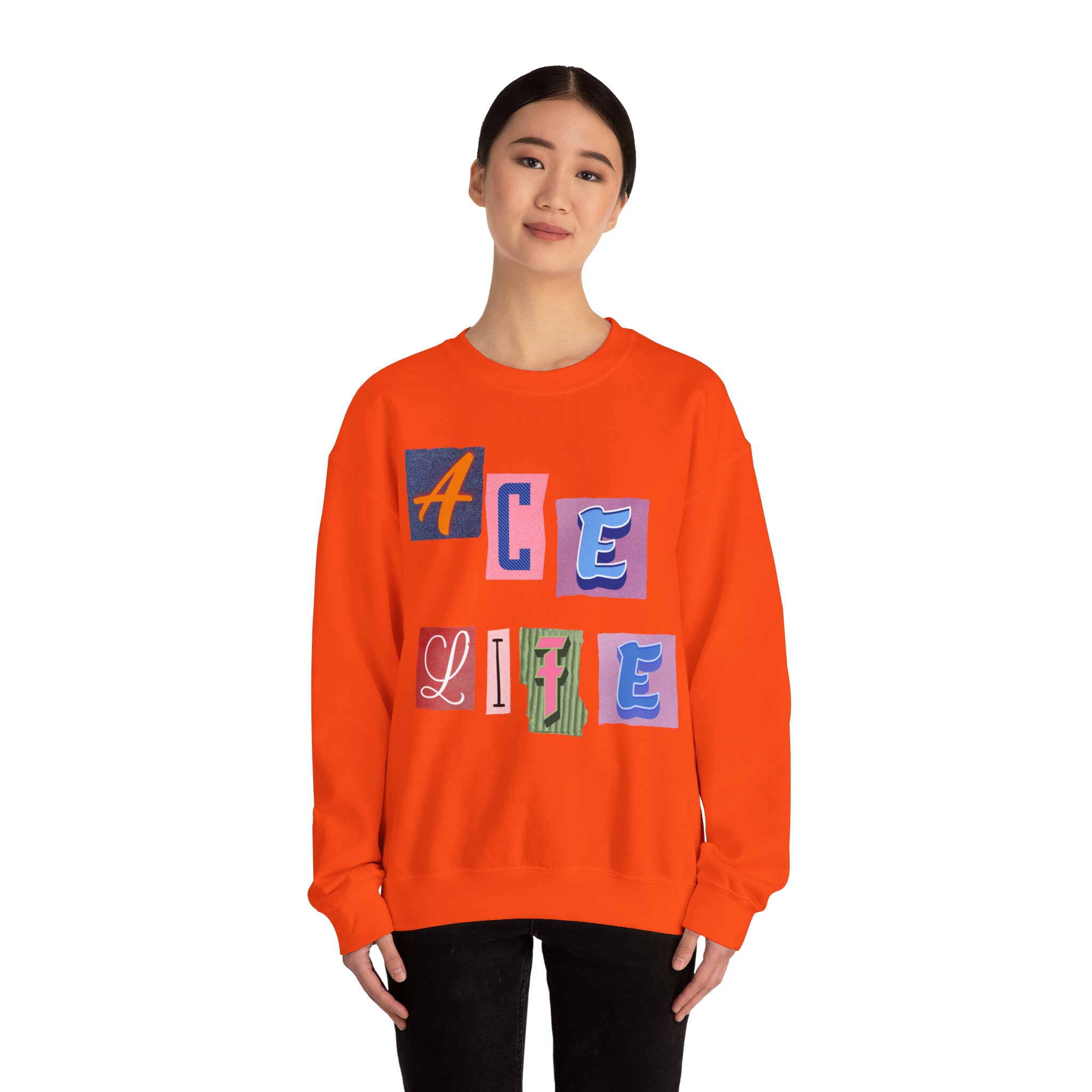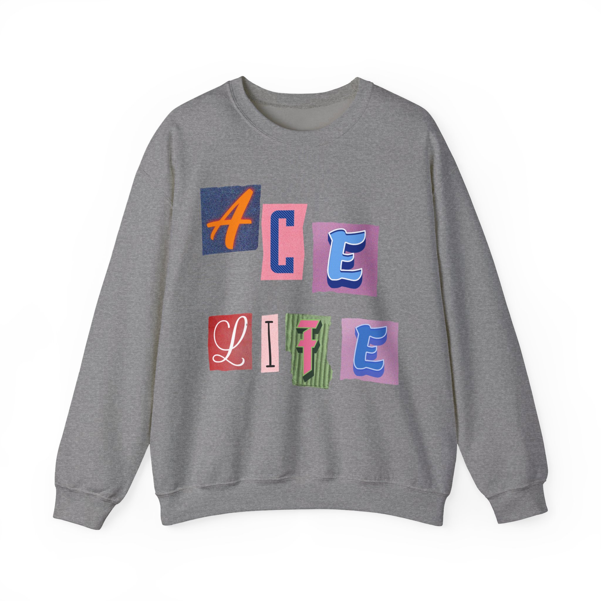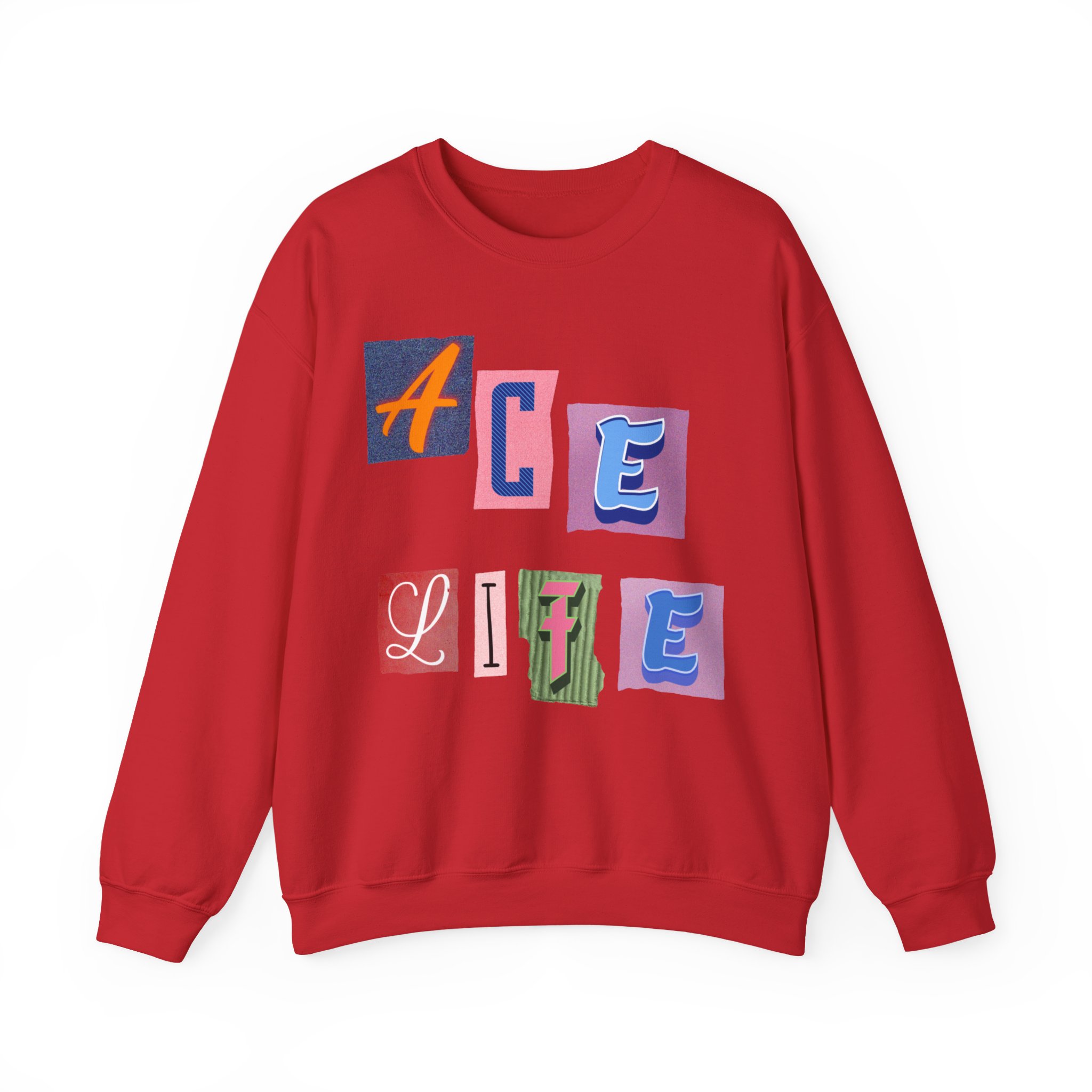 This cozy crewneck sweatshirt carries a playful, collage-style graphic that reads “ACE LIFE” in colorful, mismatched letter blocks. The medium-heavy cotton-poly blend feels warm and substantial without weighing you down. Classic crewneck lines, ribbed collar and cuffs, and tubular knit construction keep the silhouette clean and comfortable. It drapes easily for laid-back days at campus, meetups with friends, or chill evenings at home. The artful, slightly retro letterforms give the piece a nostalgic, creative vibe — an effortless way to show off personal flair while staying snug.