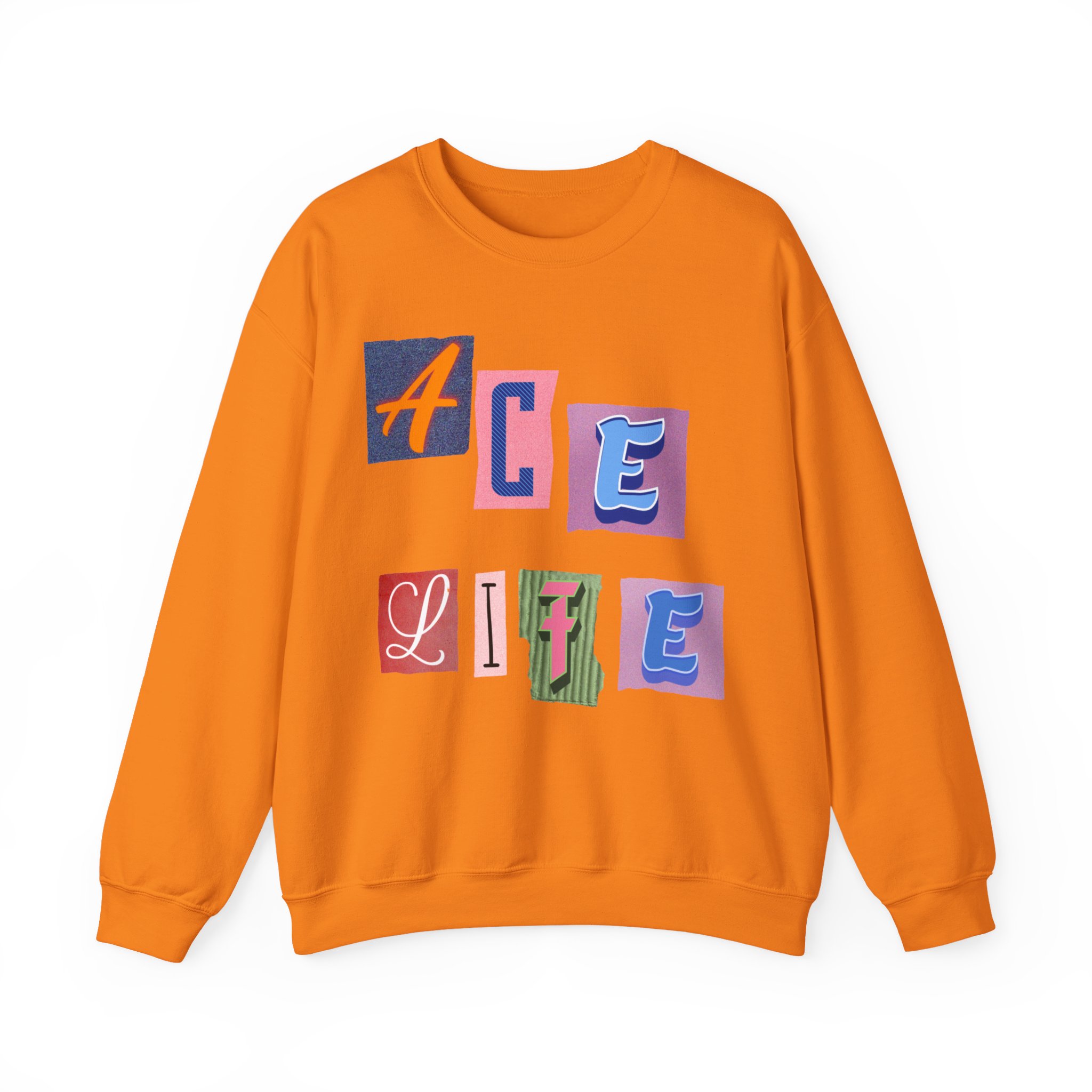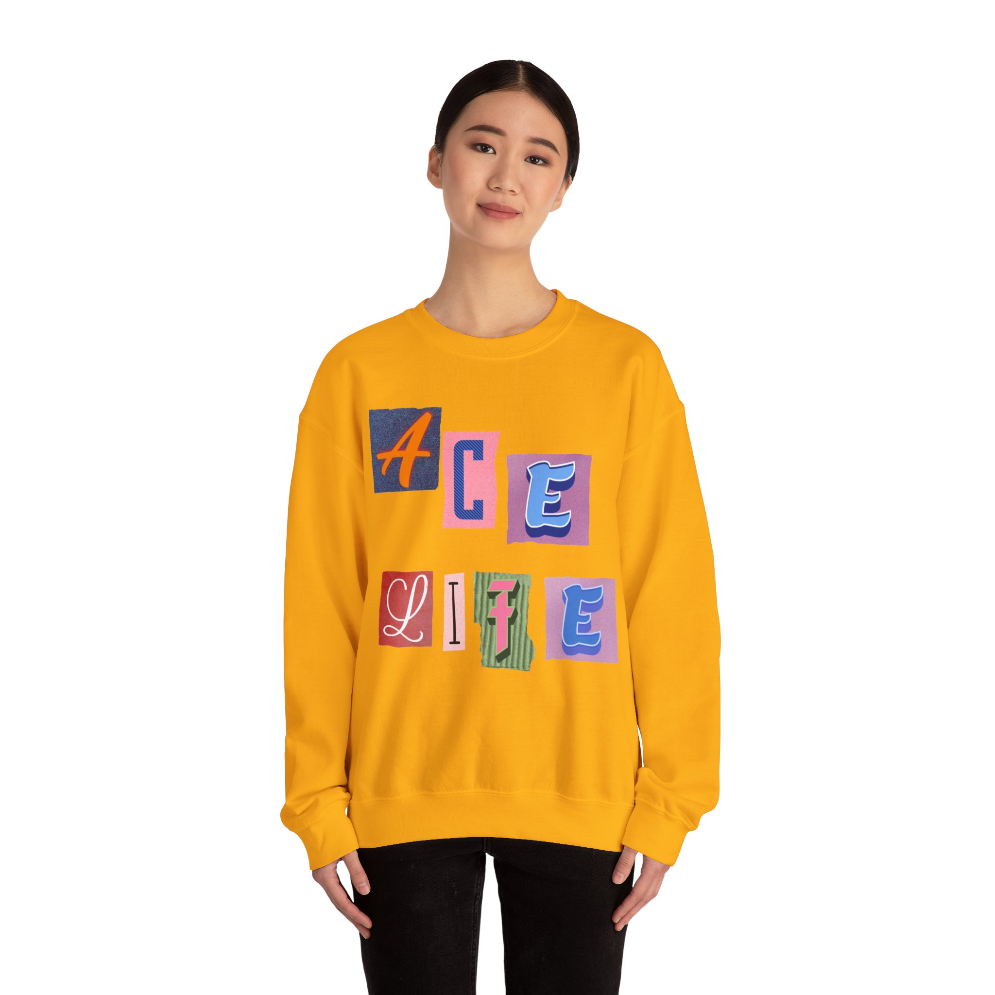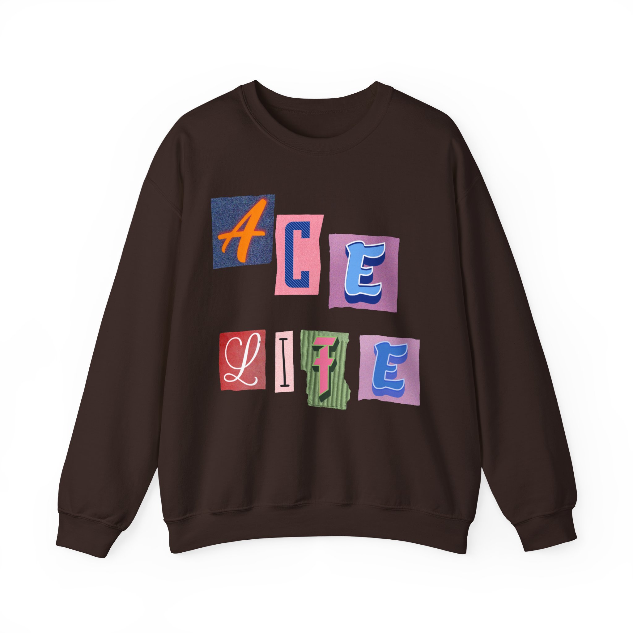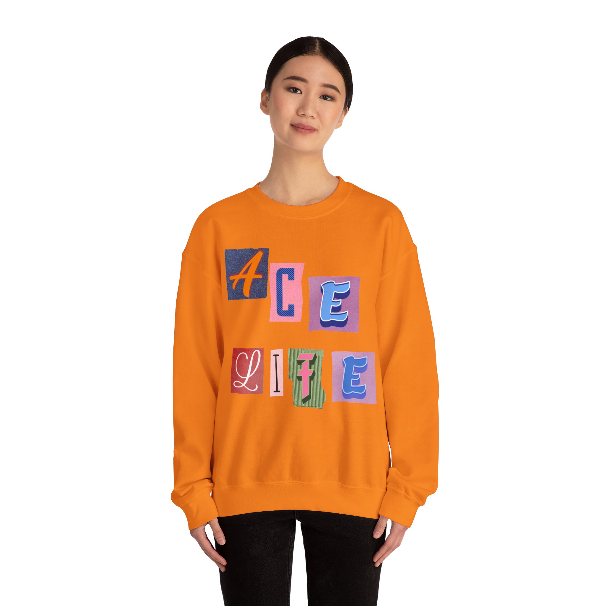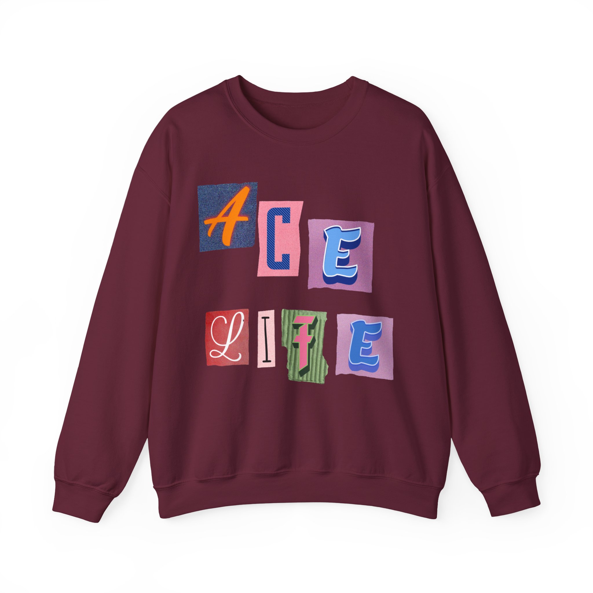 This cozy crewneck sweatshirt carries a playful, collage-style graphic that reads “ACE LIFE” in colorful, mismatched letter blocks. The medium-heavy cotton-poly blend feels warm and substantial without weighing you down. Classic crewneck lines, ribbed collar and cuffs, and tubular knit construction keep the silhouette clean and comfortable. It drapes easily for laid-back days at campus, meetups with friends, or chill evenings at home. The artful, slightly retro letterforms give the piece a nostalgic, creative vibe — an effortless way to show off personal flair while staying snug.