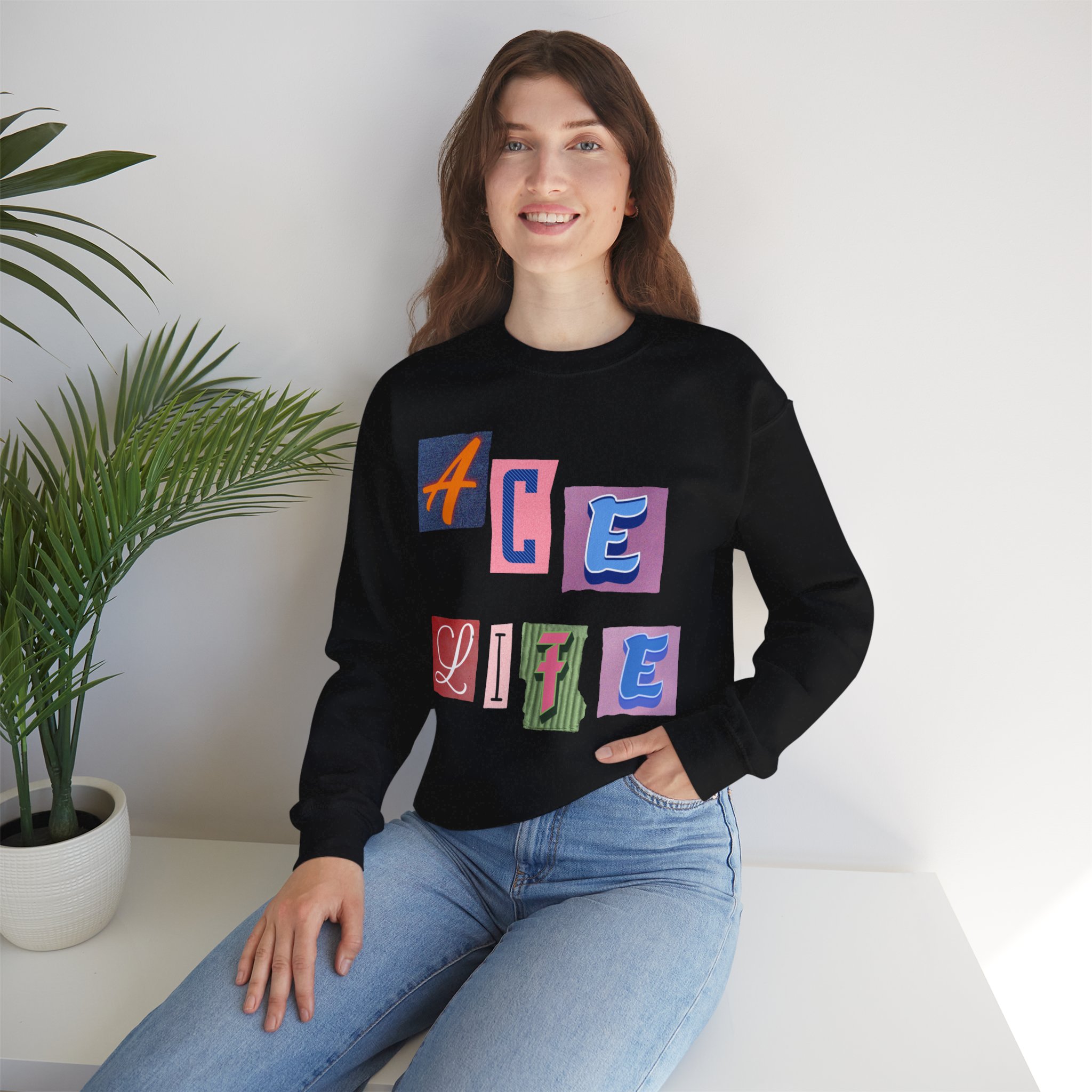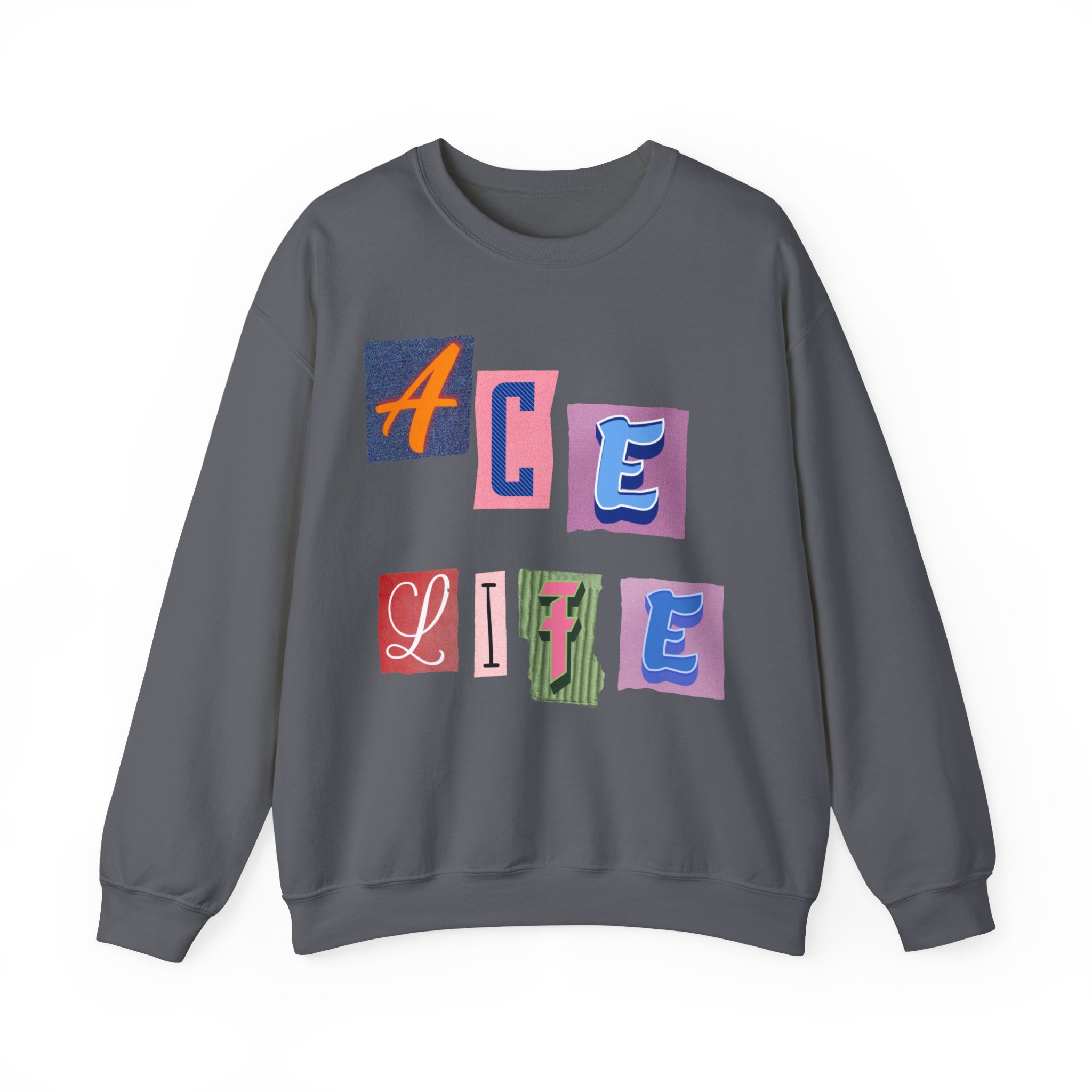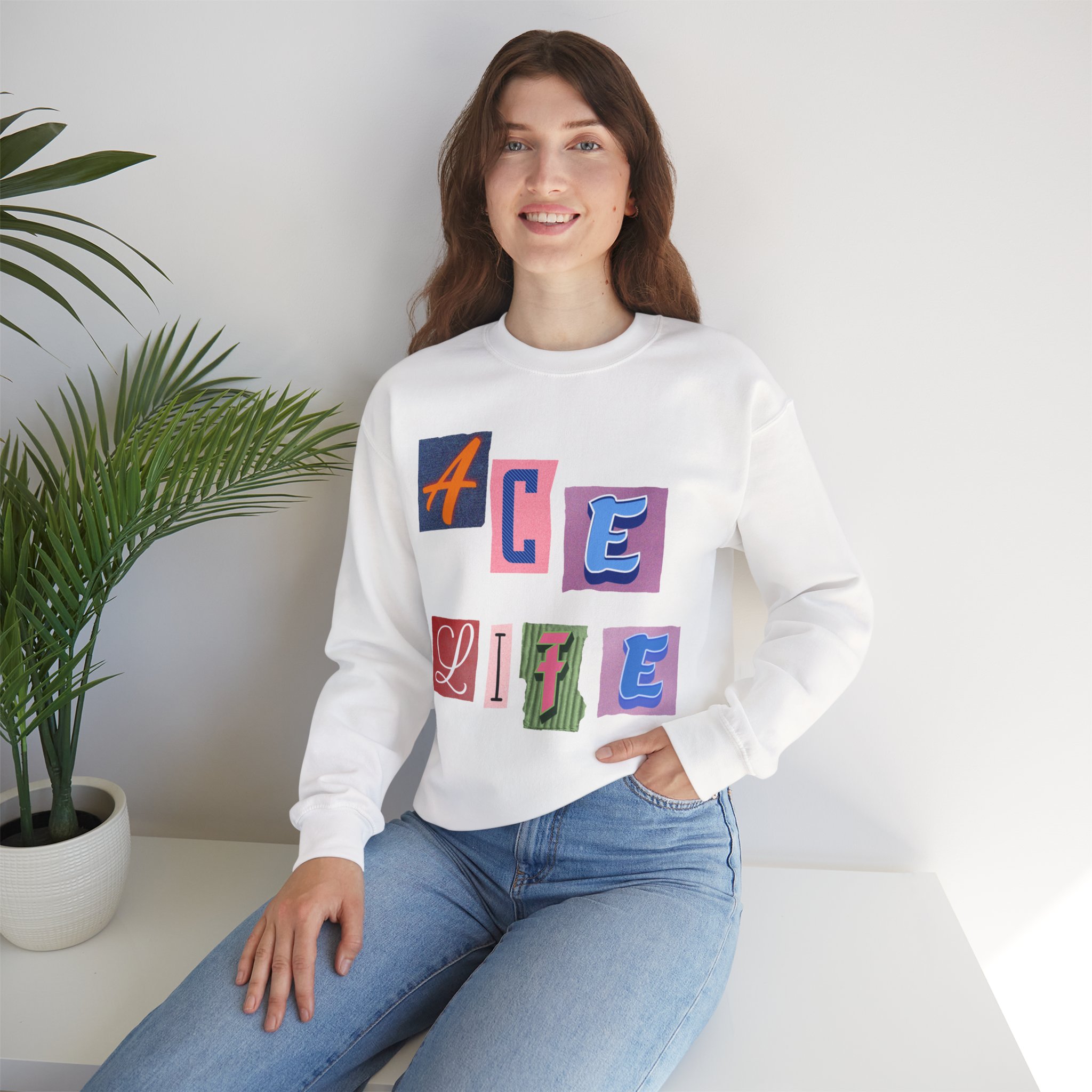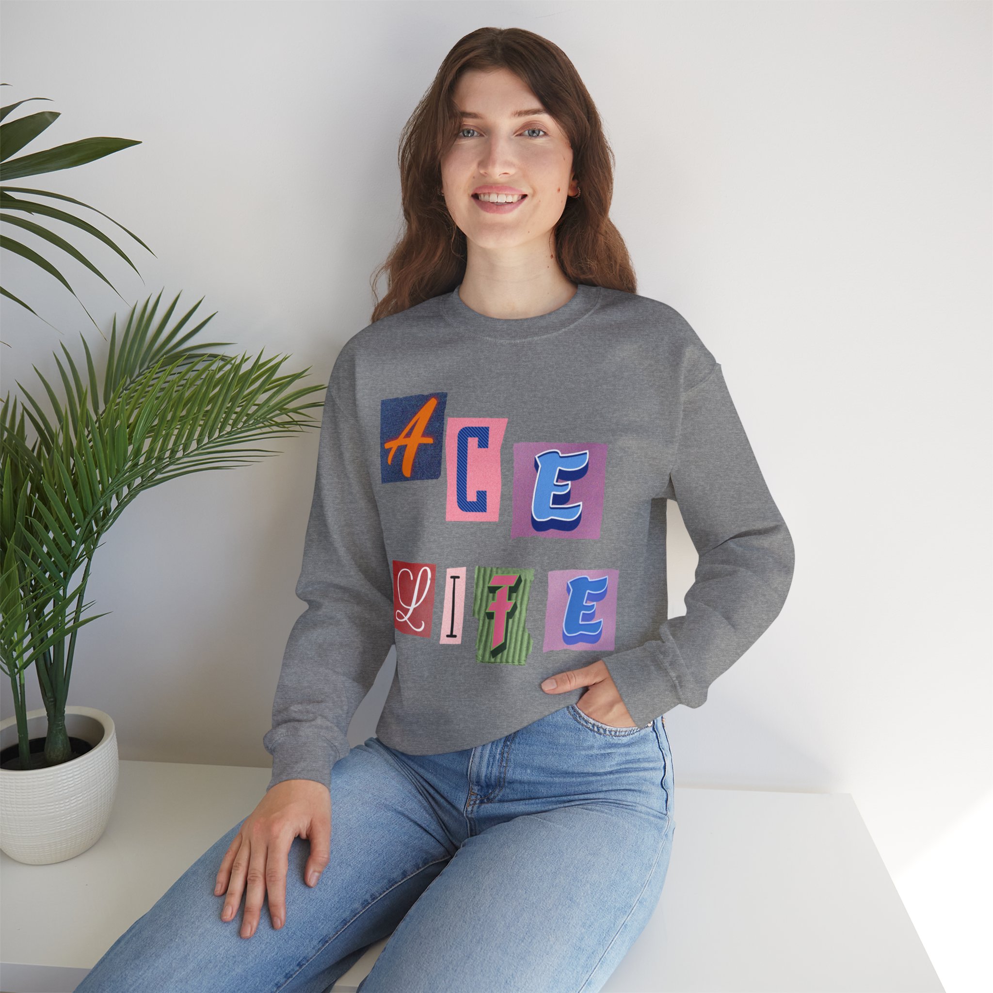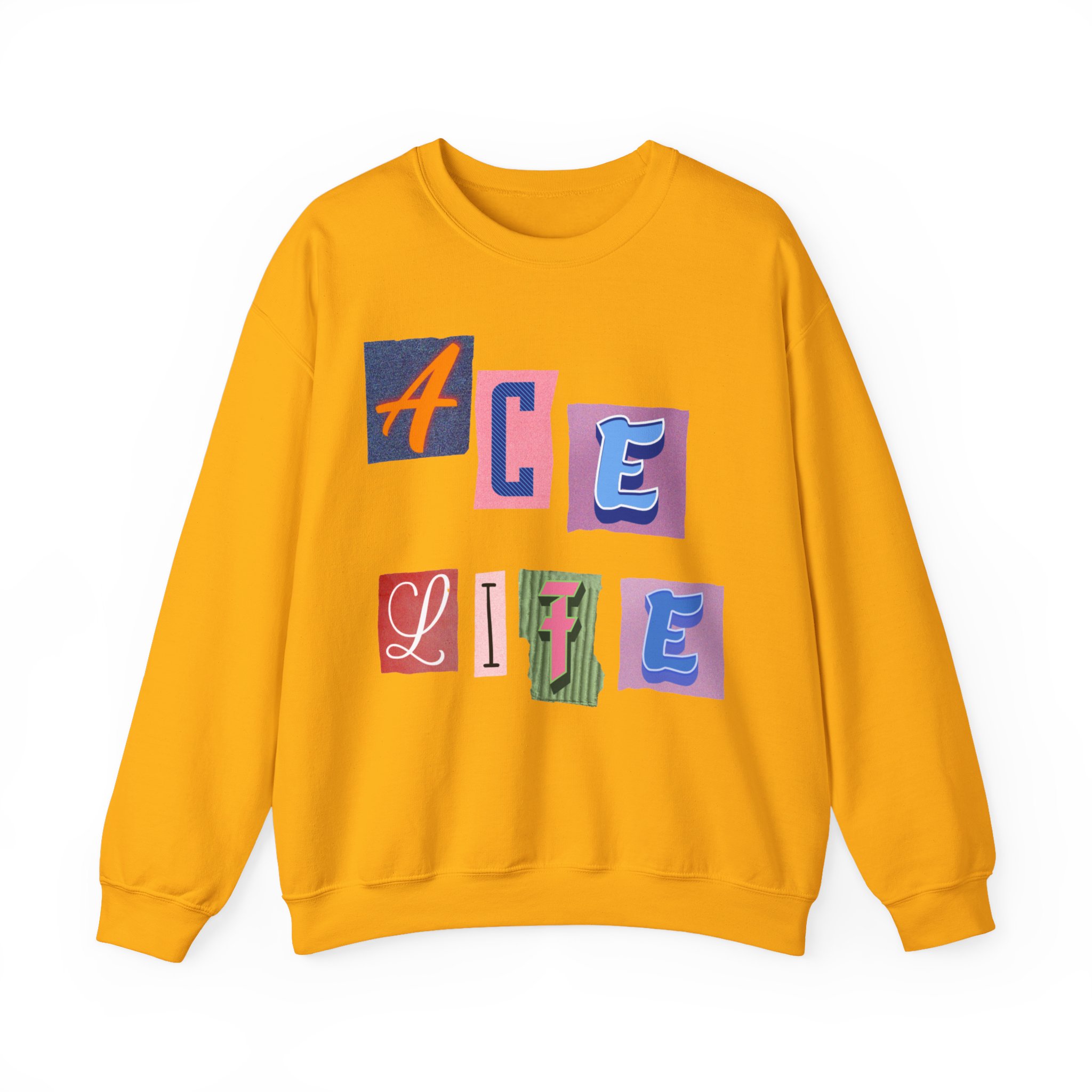 This cozy crewneck sweatshirt carries a playful, collage-style graphic that reads “ACE LIFE” in colorful, mismatched letter blocks. The medium-heavy cotton-poly blend feels warm and substantial without weighing you down. Classic crewneck lines, ribbed collar and cuffs, and tubular knit construction keep the silhouette clean and comfortable. It drapes easily for laid-back days at campus, meetups with friends, or chill evenings at home. The artful, slightly retro letterforms give the piece a nostalgic, creative vibe — an effortless way to show off personal flair while staying snug.