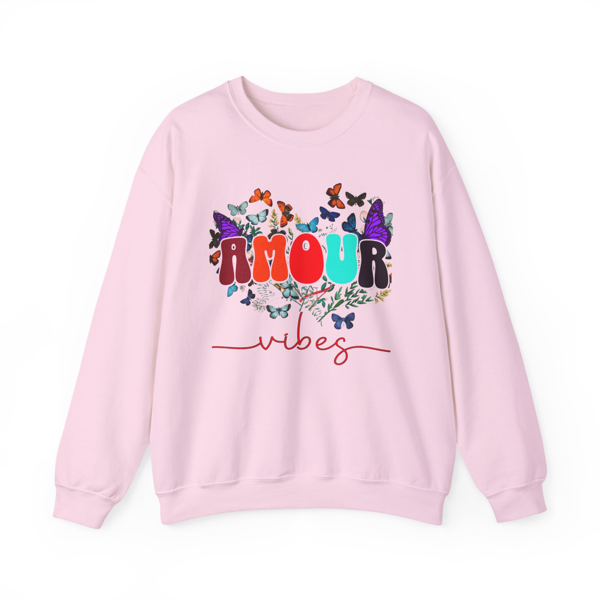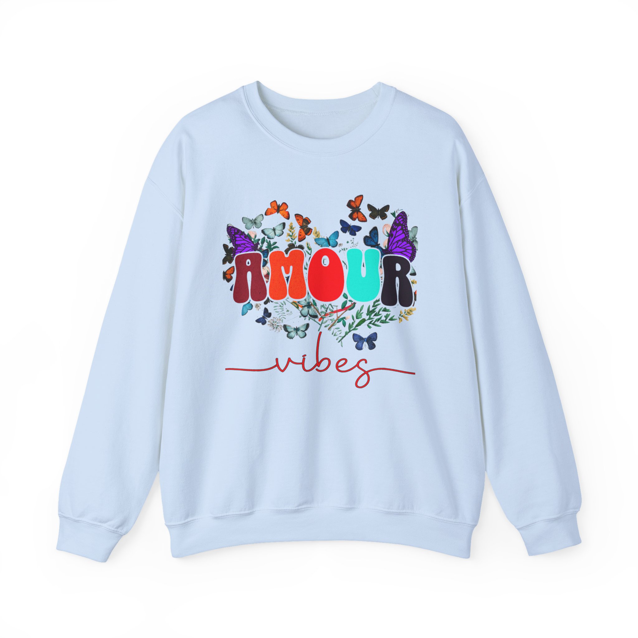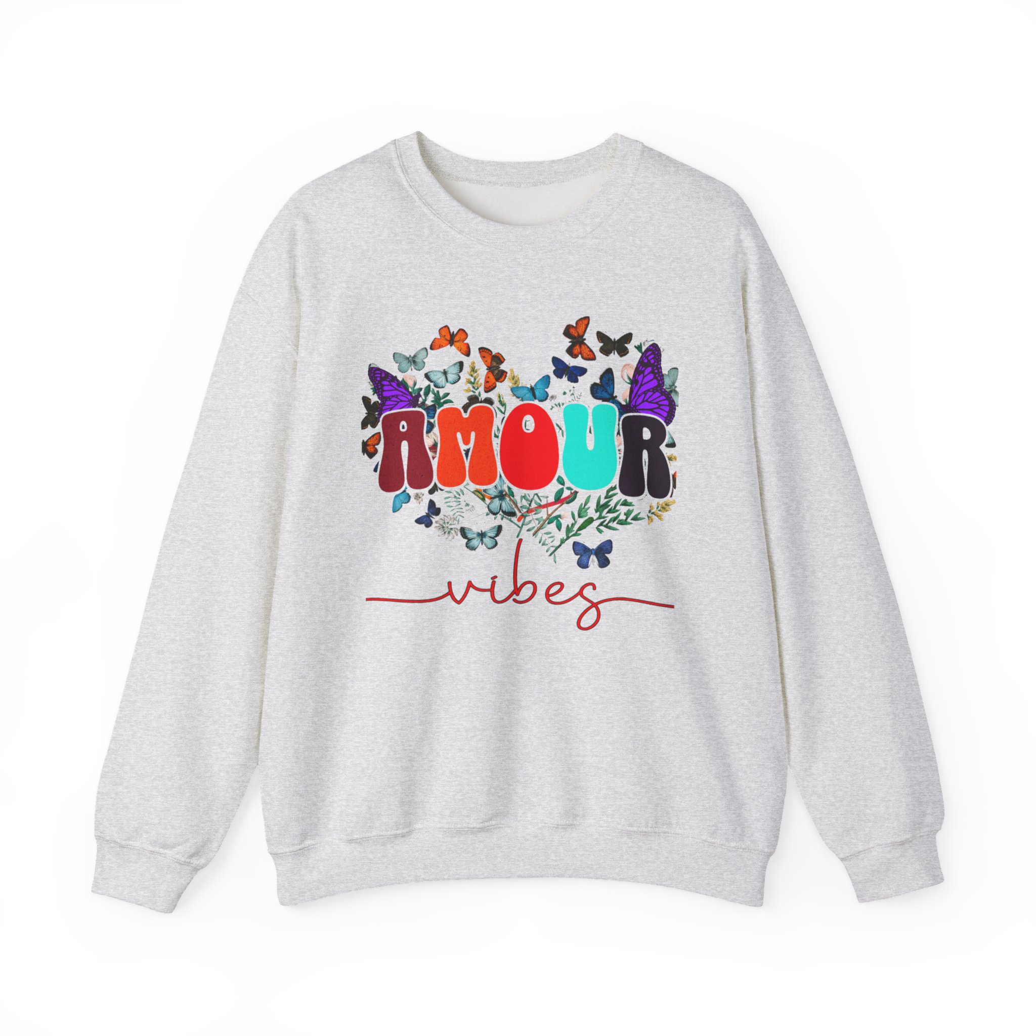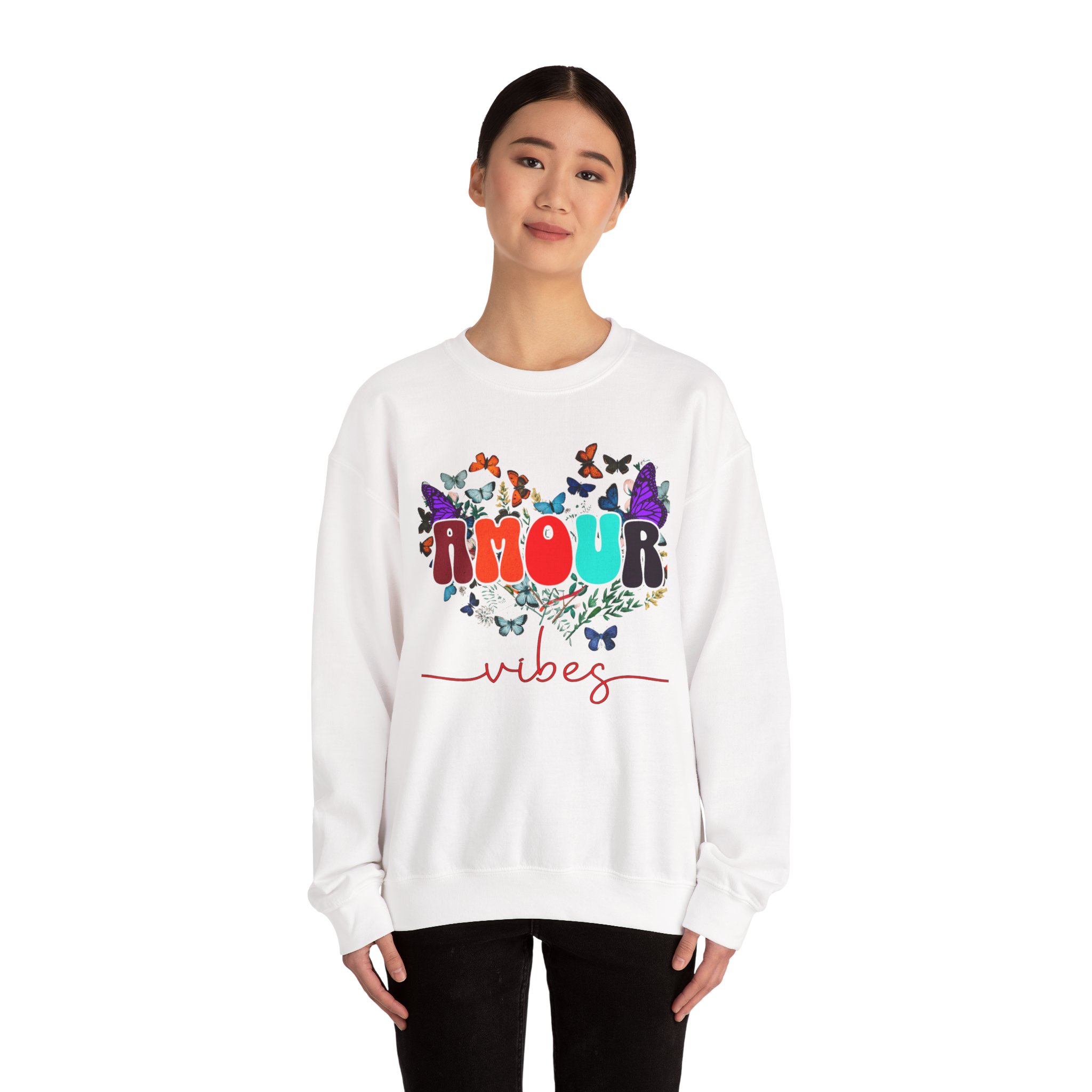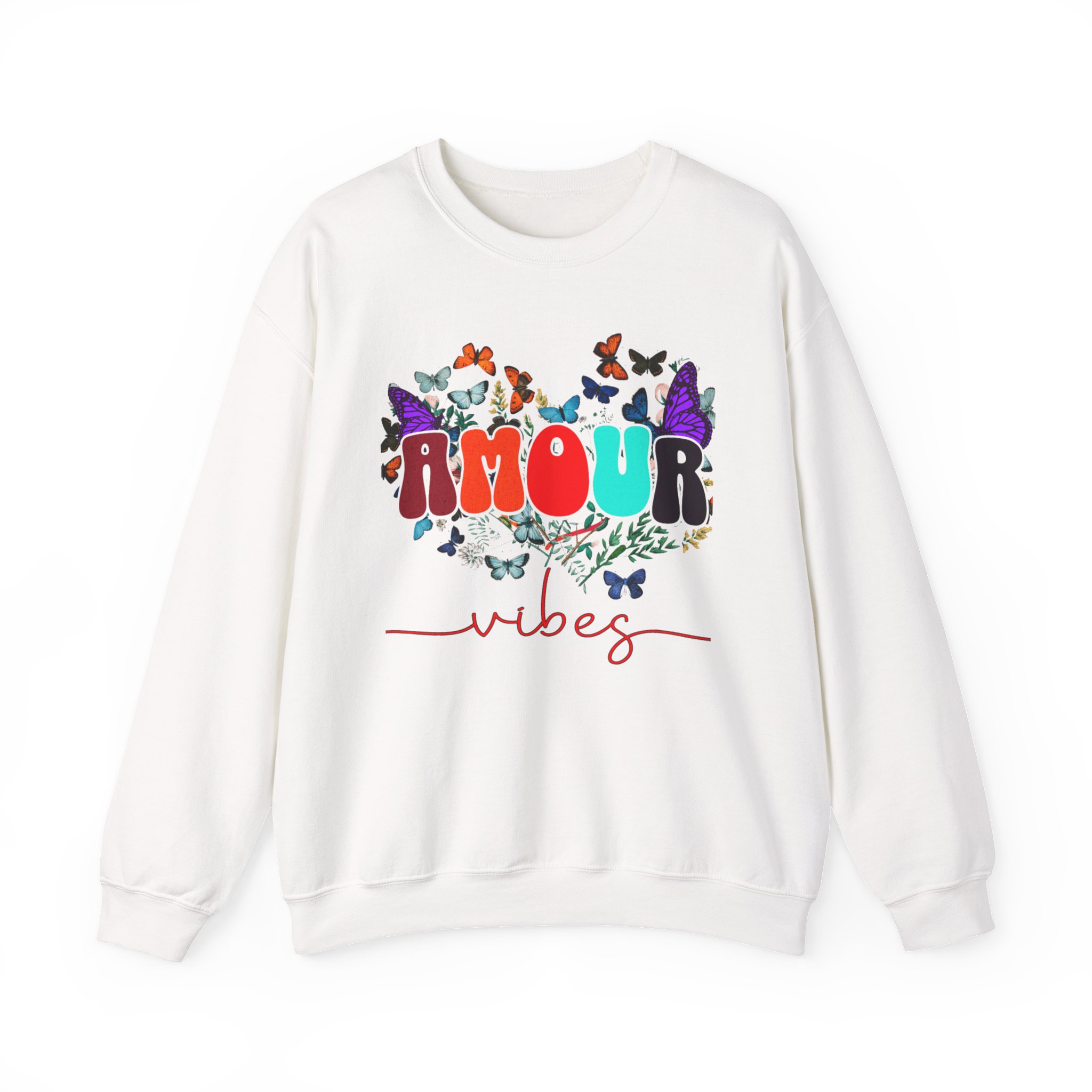 Soft, cozy, and sprinkled with joy — this crewneck sweatshirt carries a playful, vintage-inspired design that reads “AMOUR vibes” surrounded by colorful butterflies and delicate foliage. The clean white backdrop makes the artwork pop while the roomy classic fit and crew neckline keep it easy to wear all day. Imagine slipping this on for a slow morning coffee, a weekend walk with friends, or a relaxed date night; it brings a gentle, romantic energy without trying too hard. The embroidered-ready layout and high-quality print methods give the piece a handcrafted feel, so it sits naturally in wardrobes that favor comfort, color, and a touch of whimsy.