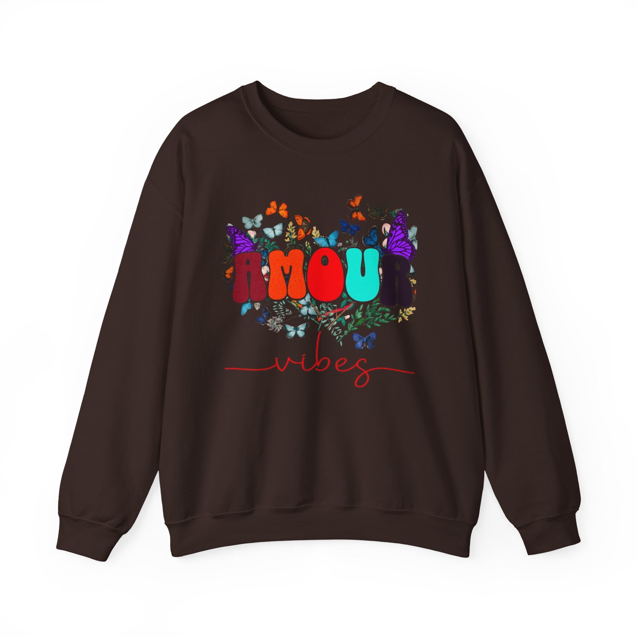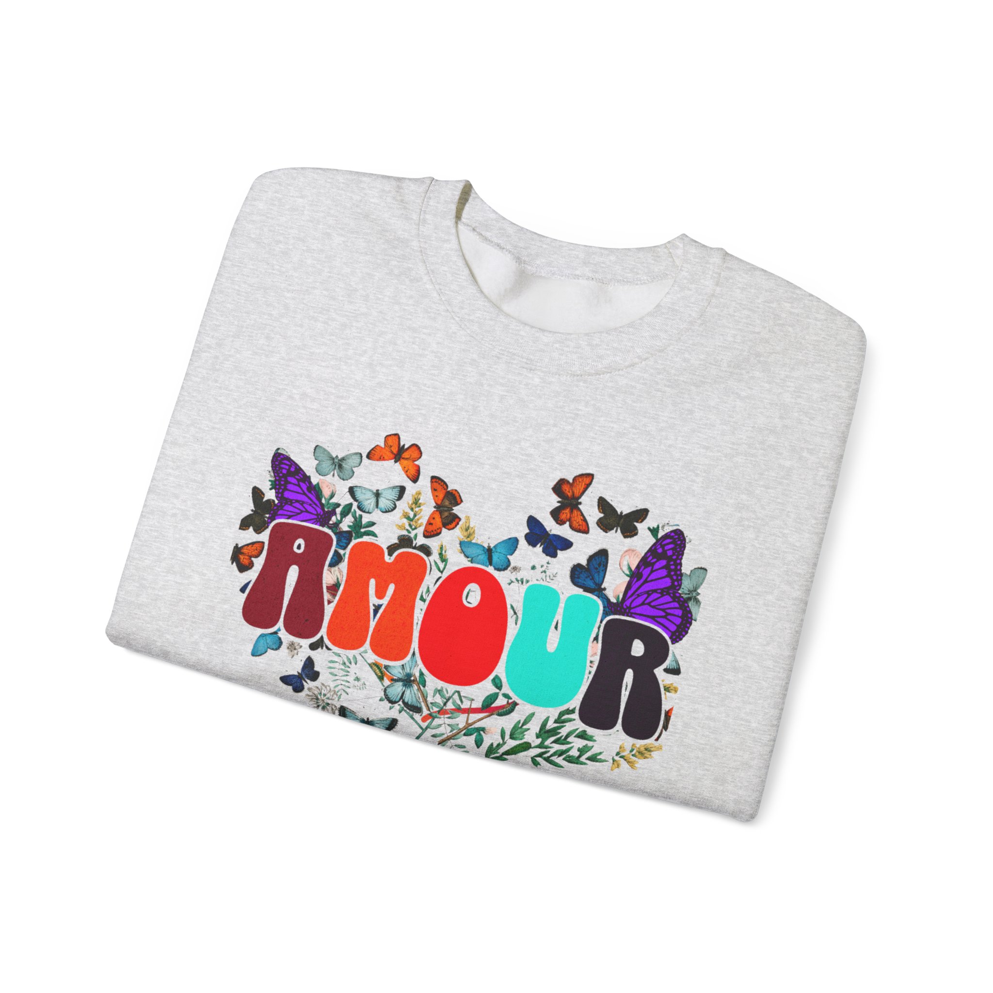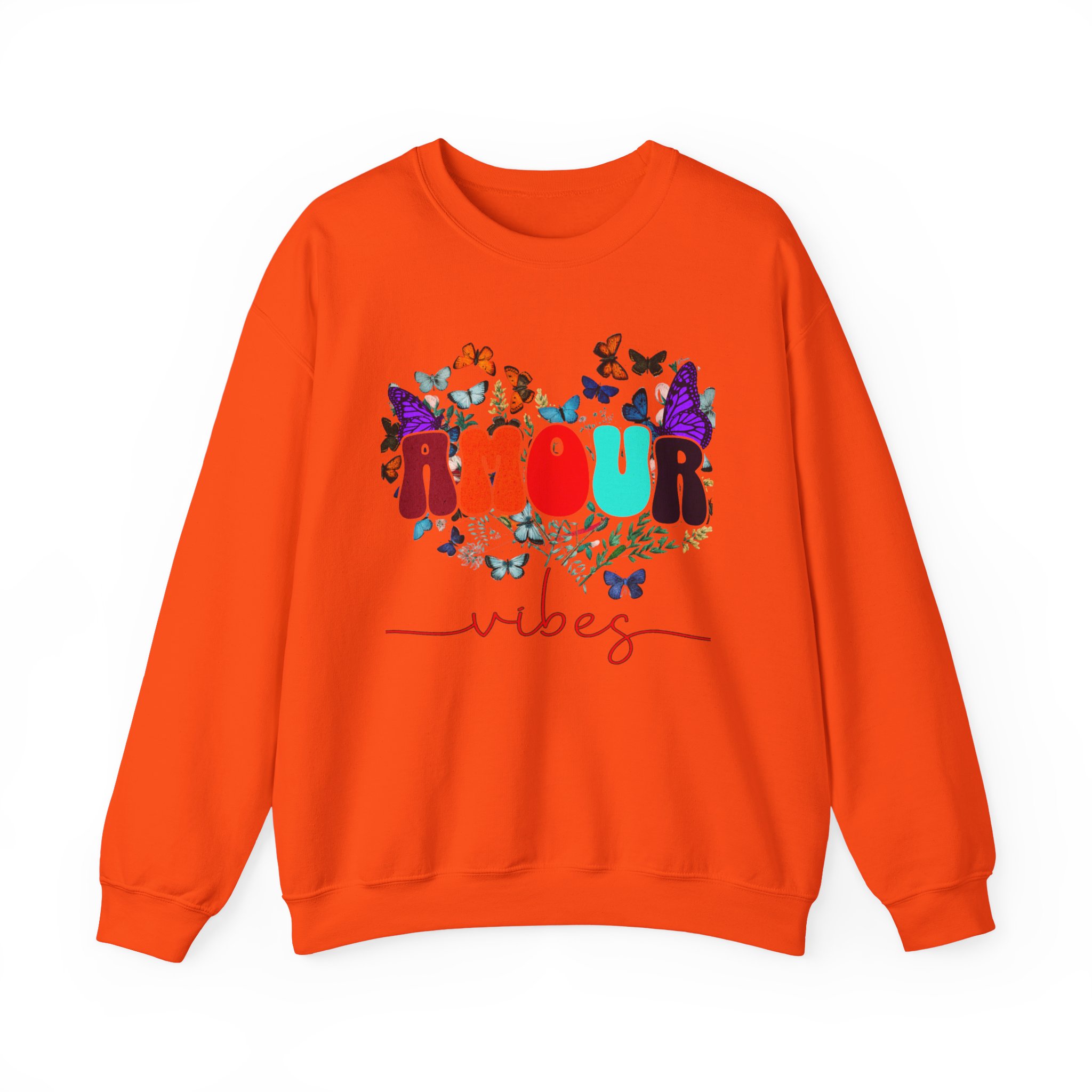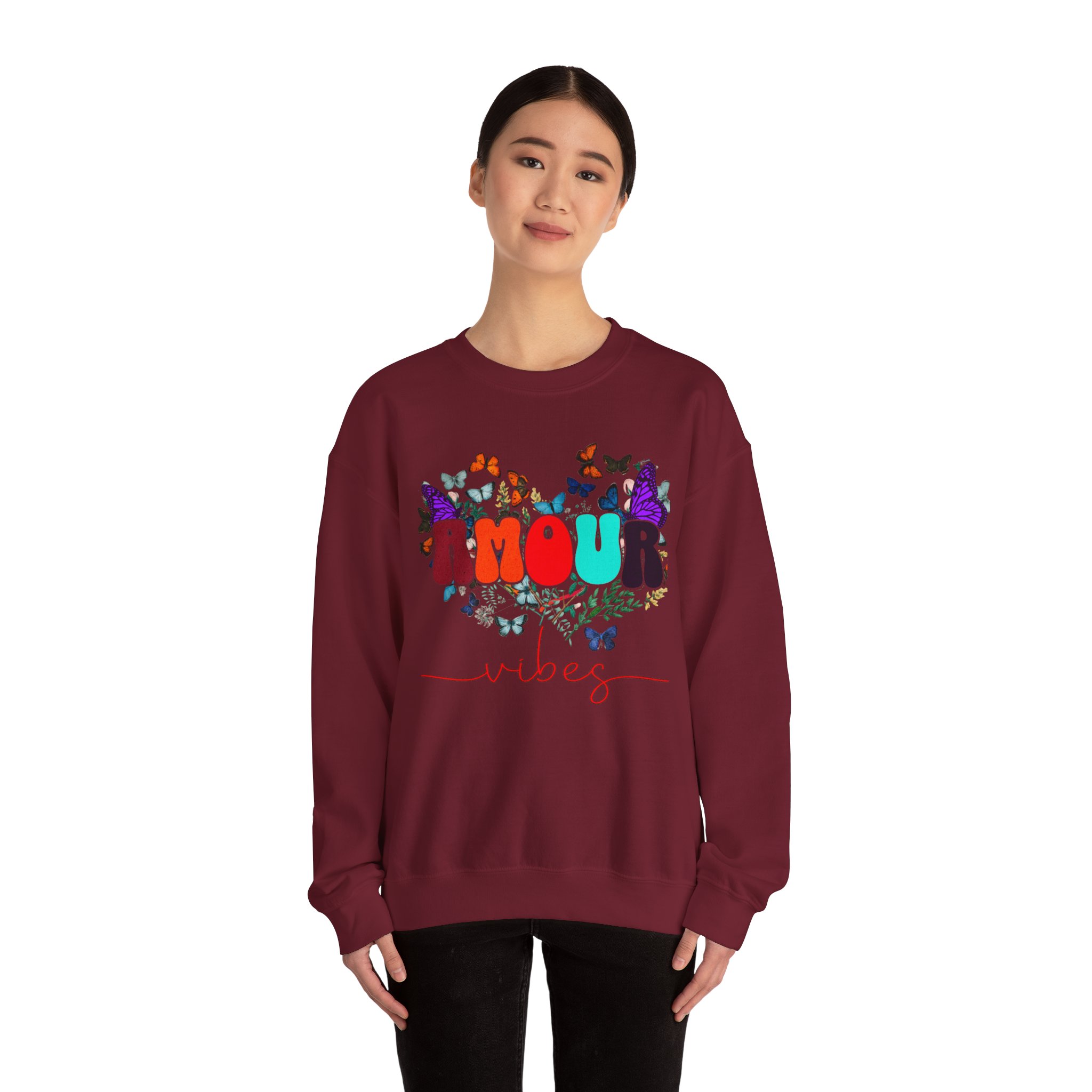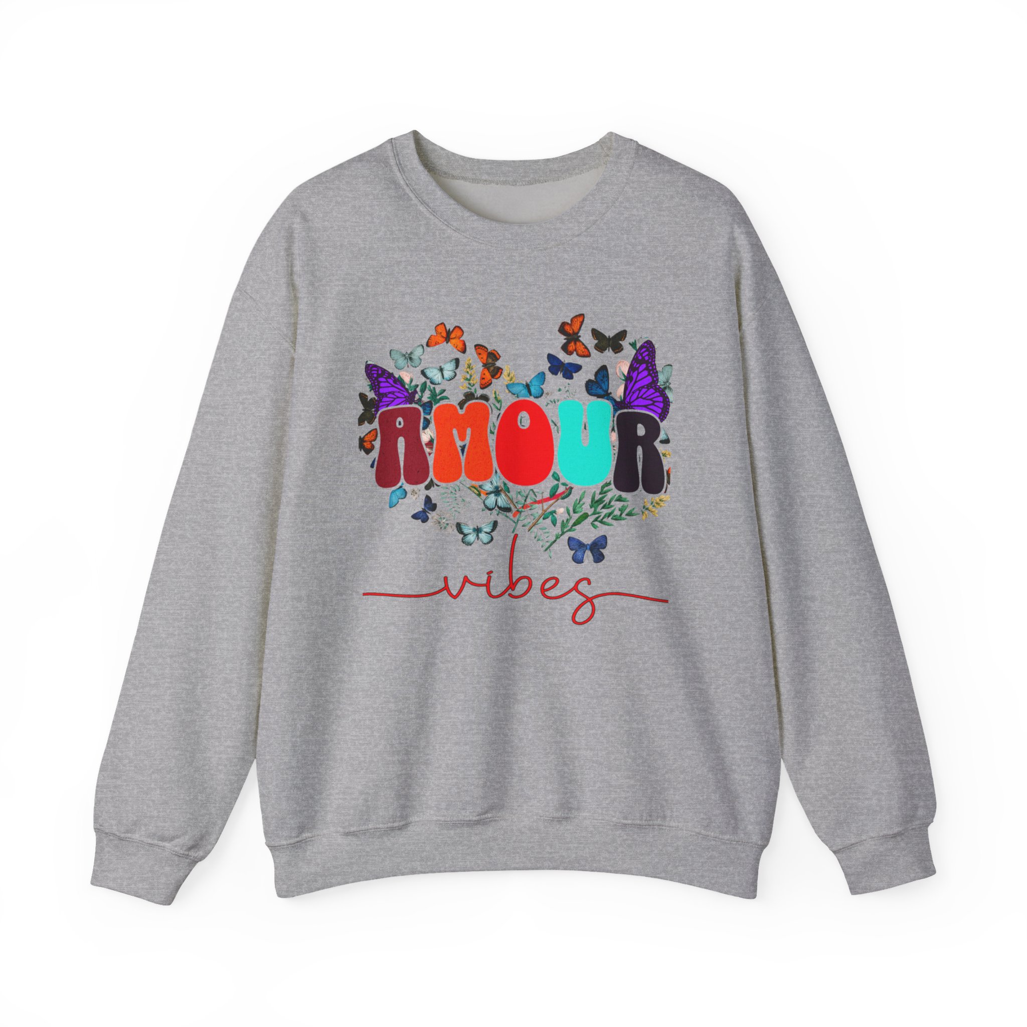 Soft, cozy, and sprinkled with joy — this crewneck sweatshirt carries a playful, vintage-inspired design that reads “AMOUR vibes” surrounded by colorful butterflies and delicate foliage. The clean white backdrop makes the artwork pop while the roomy classic fit and crew neckline keep it easy to wear all day. Imagine slipping this on for a slow morning coffee, a weekend walk with friends, or a relaxed date night; it brings a gentle, romantic energy without trying too hard. The embroidered-ready layout and high-quality print methods give the piece a handcrafted feel, so it sits naturally in wardrobes that favor comfort, color, and a touch of whimsy.