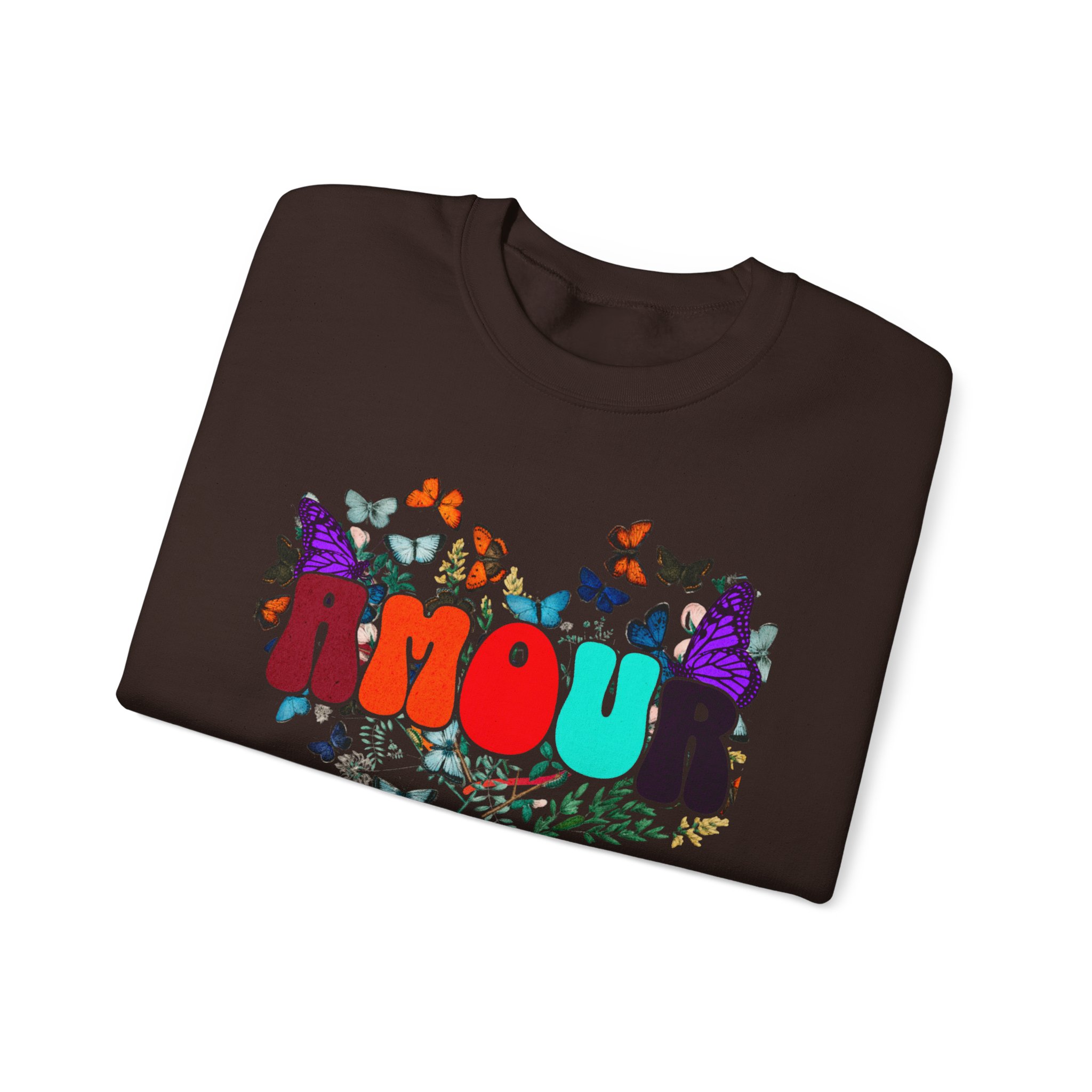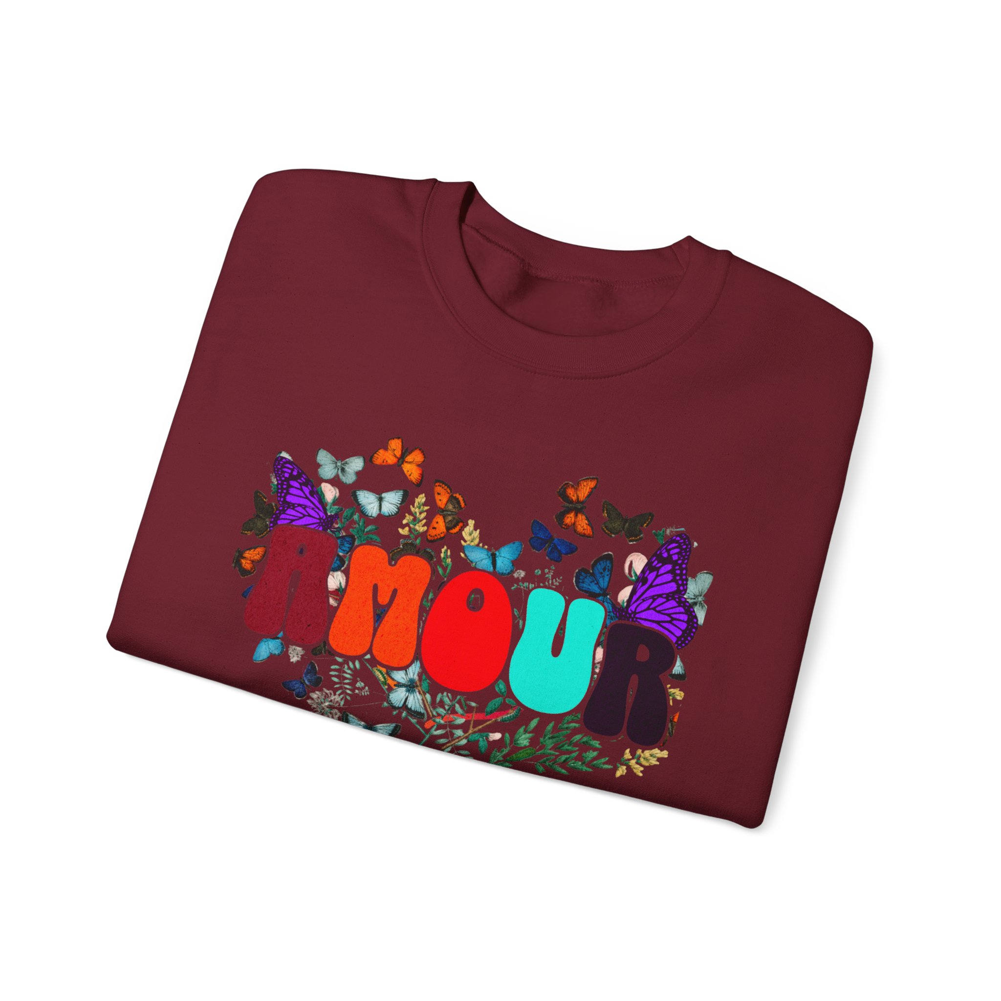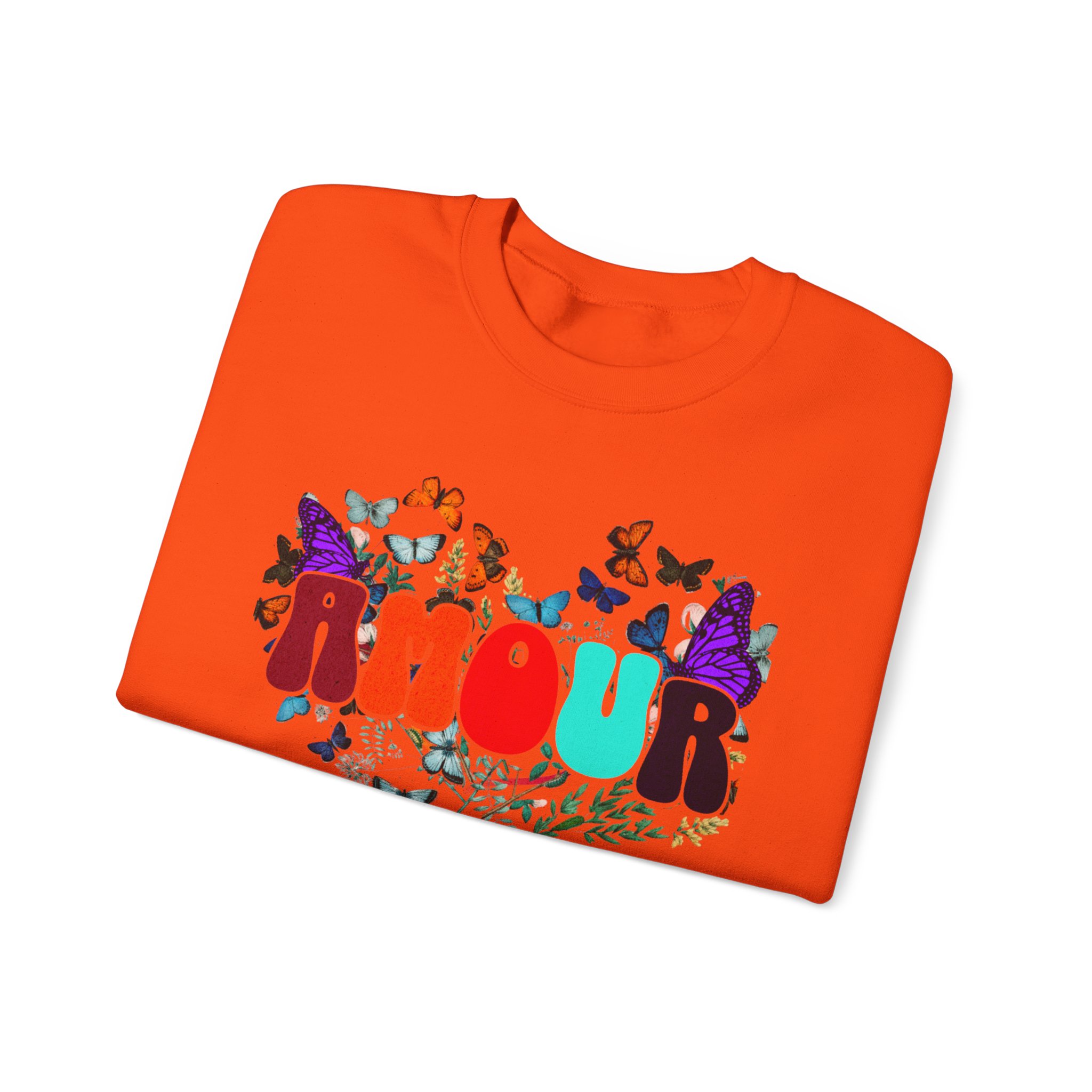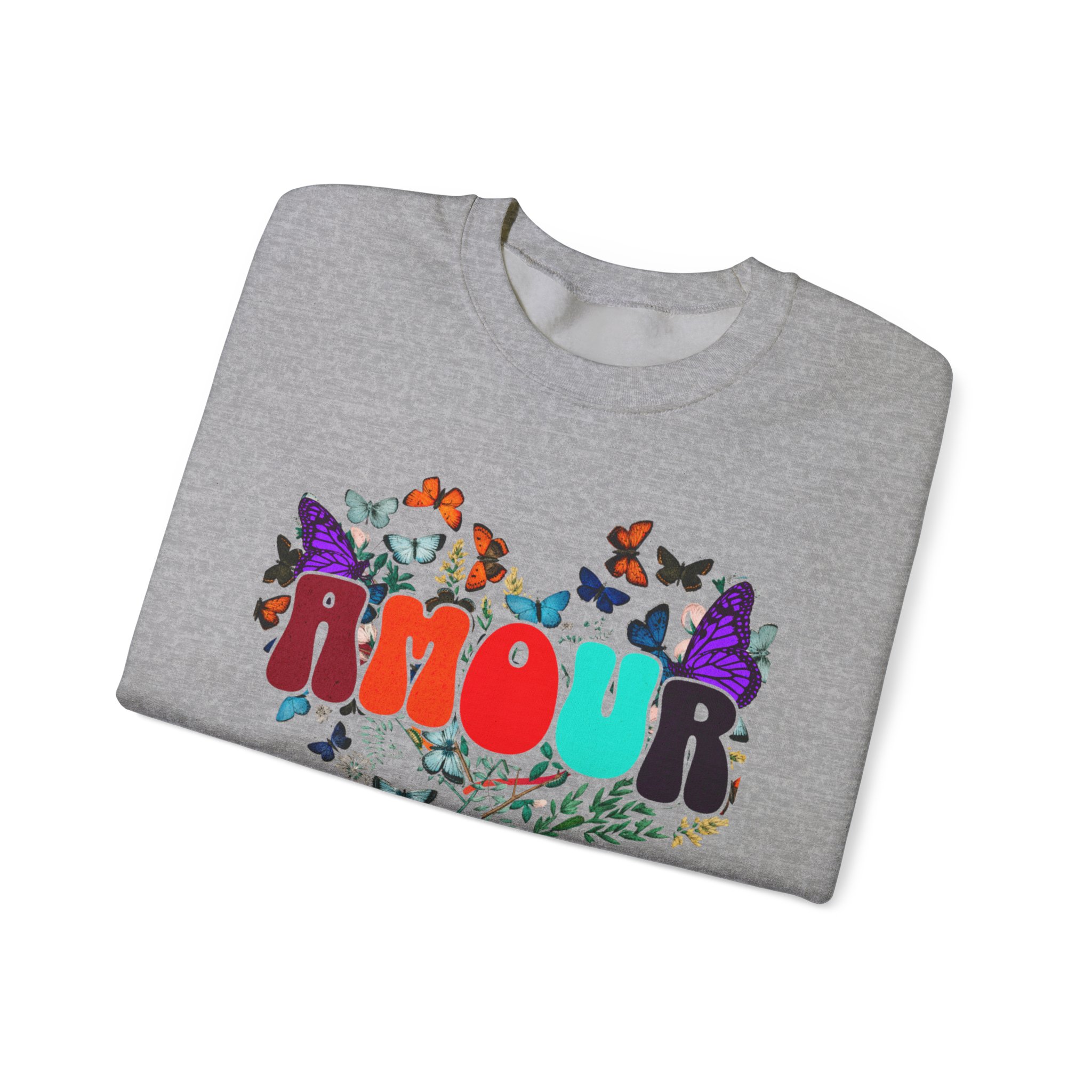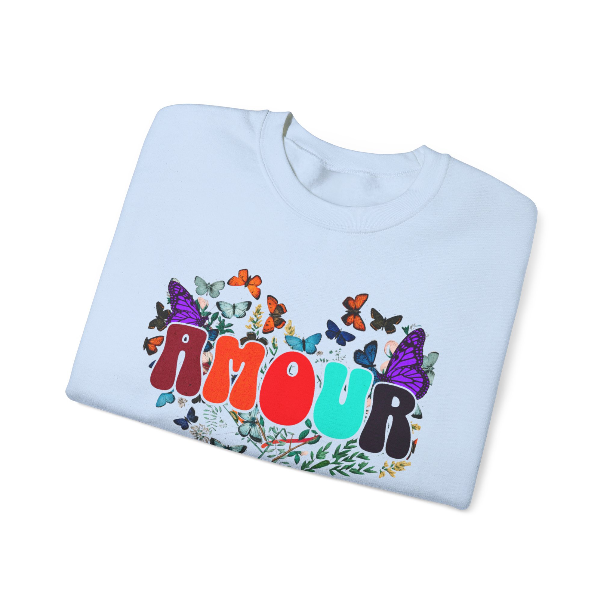 Soft, cozy, and sprinkled with joy — this crewneck sweatshirt carries a playful, vintage-inspired design that reads “AMOUR vibes” surrounded by colorful butterflies and delicate foliage. The clean white backdrop makes the artwork pop while the roomy classic fit and crew neckline keep it easy to wear all day. Imagine slipping this on for a slow morning coffee, a weekend walk with friends, or a relaxed date night; it brings a gentle, romantic energy without trying too hard. The embroidered-ready layout and high-quality print methods give the piece a handcrafted feel, so it sits naturally in wardrobes that favor comfort, color, and a touch of whimsy.