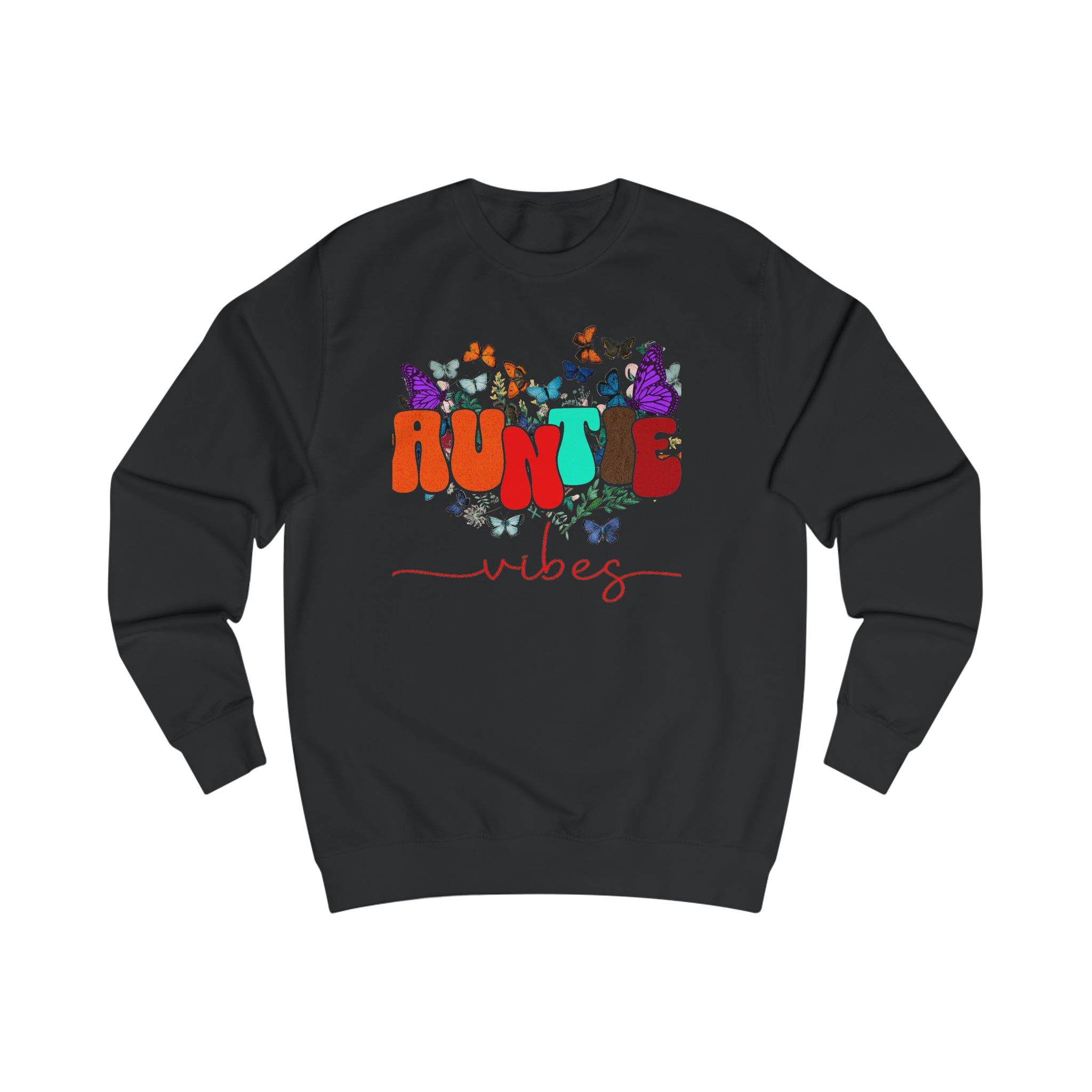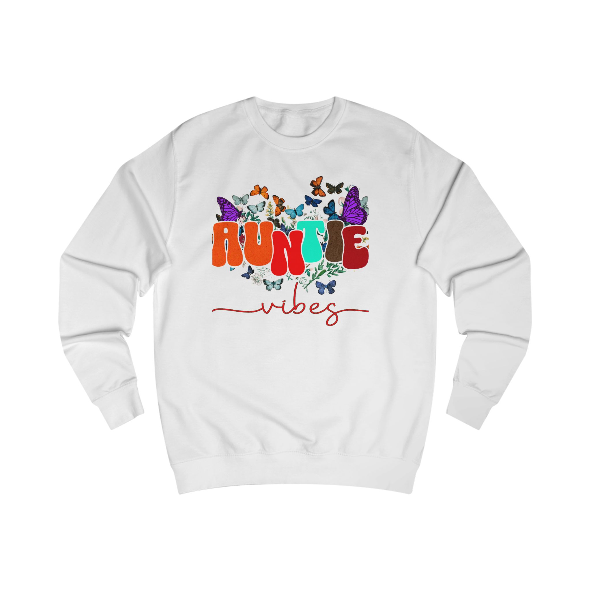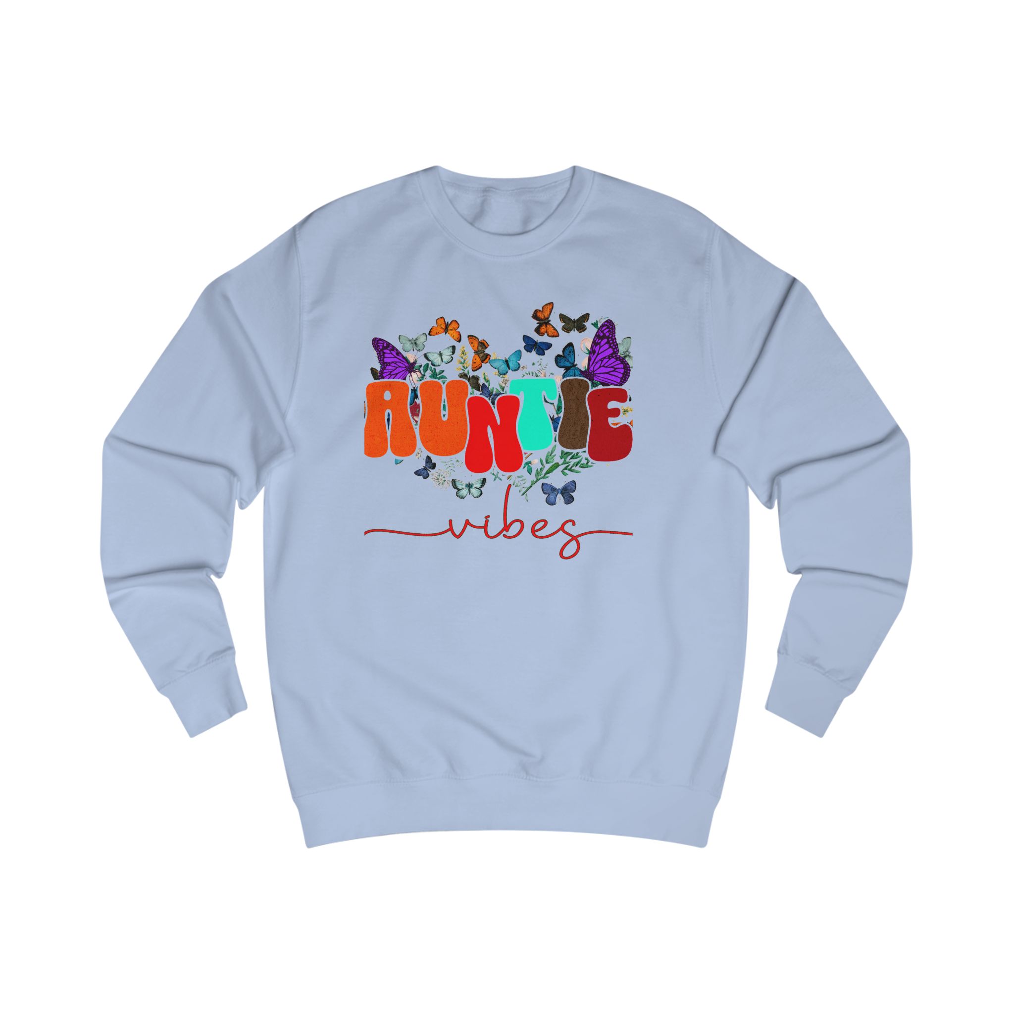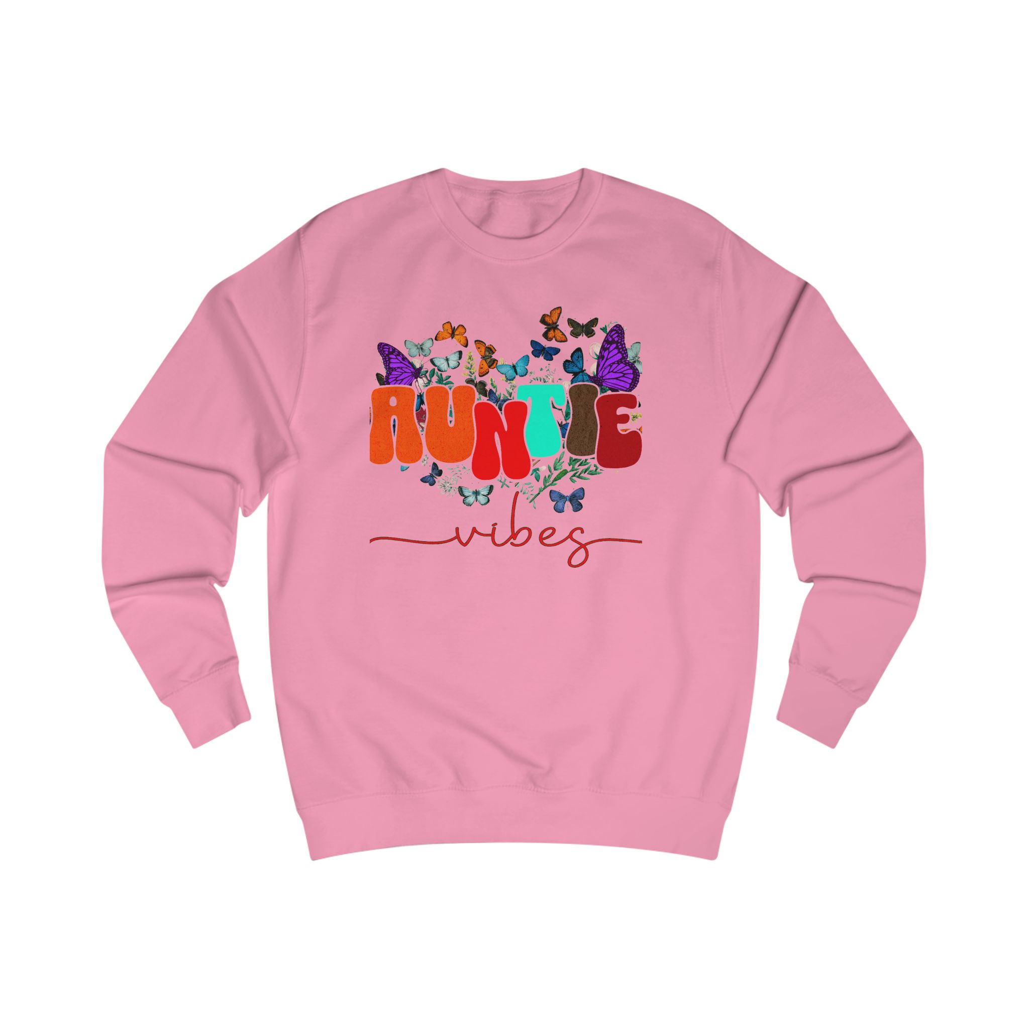 Soft, cozy, and a little playful — this sweatshirt carries that warm ‘auntie’ energy with colorful typography and fluttering butterflies. Lightweight enough for layered spring days, but substantial in fabric weight so it keeps its shape and feels substantial on cooler evenings. Wear it to weekend coffee runs, storytime with the little ones, or tucked into a casual dinner with family. The design settles into the chest area like a friendly hello, and the comfortable neckline and ribbed cuffs keep everything feeling familiar and lived-in. It’s for those who show up with snacks, hugs, and a touch of sparkle.