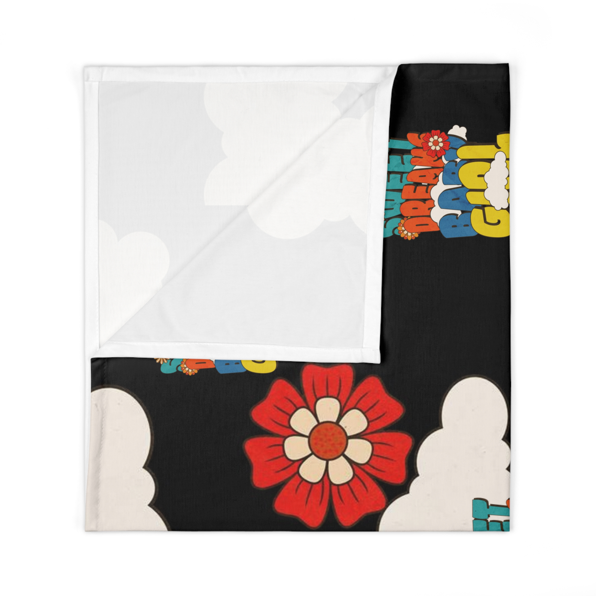 Soft, playful swaddle blanket woven from smooth jersey polyester and printed with a retro cloud-and-flower pattern on a deep black field. Lightly stretchy and one-size (30″ x 40″), it wraps newborns in gentle color and bold, cheerful graphics — vintage-inspired blooms and puffy clouds that pair with upbeat, rainbow-lettered text. The one-sided print keeps the pattern bright where baby rests while the reverse stays clean and soft. It’s an easy, wearable layer for quiet naptimes, stroller rides, or cuddles on the couch, bringing a warm, nostalgic vibe to everyday baby moments.