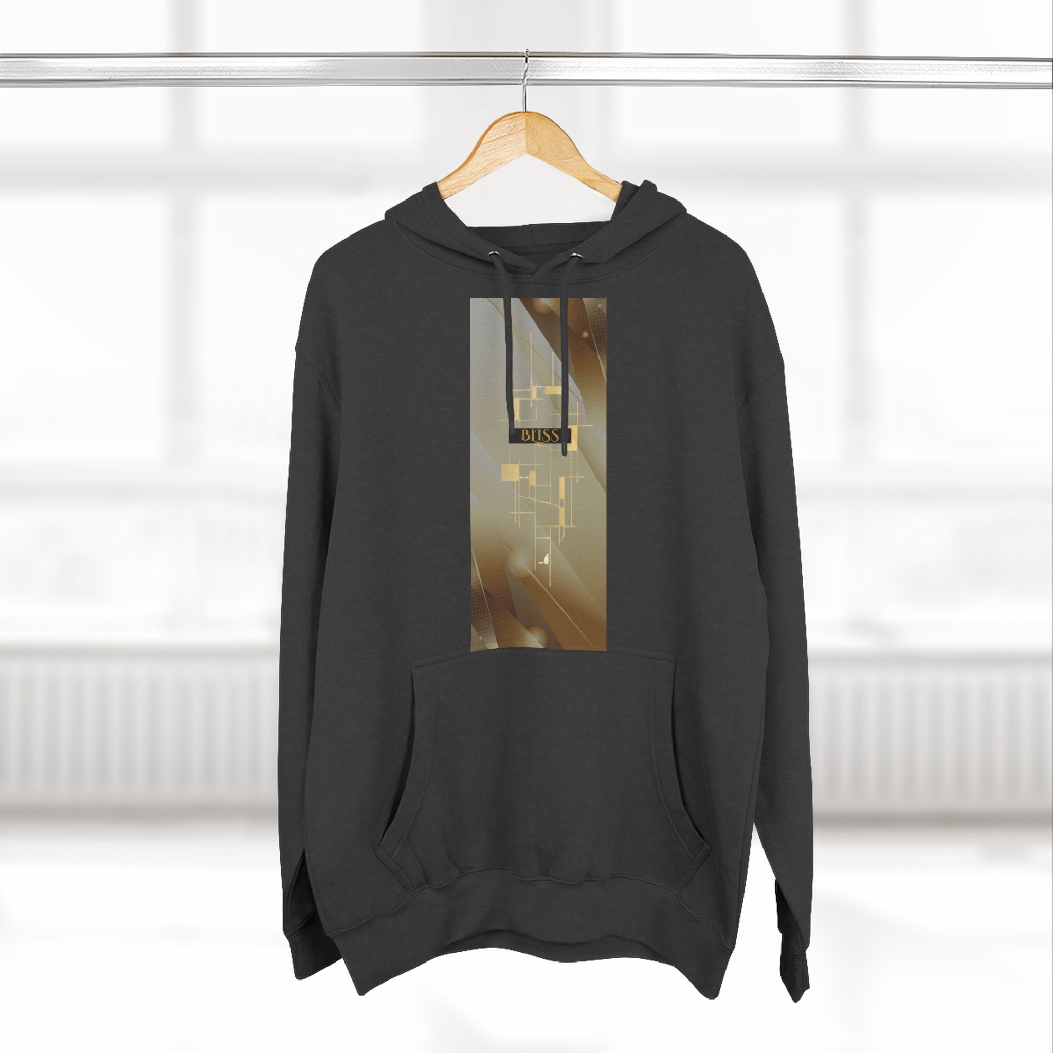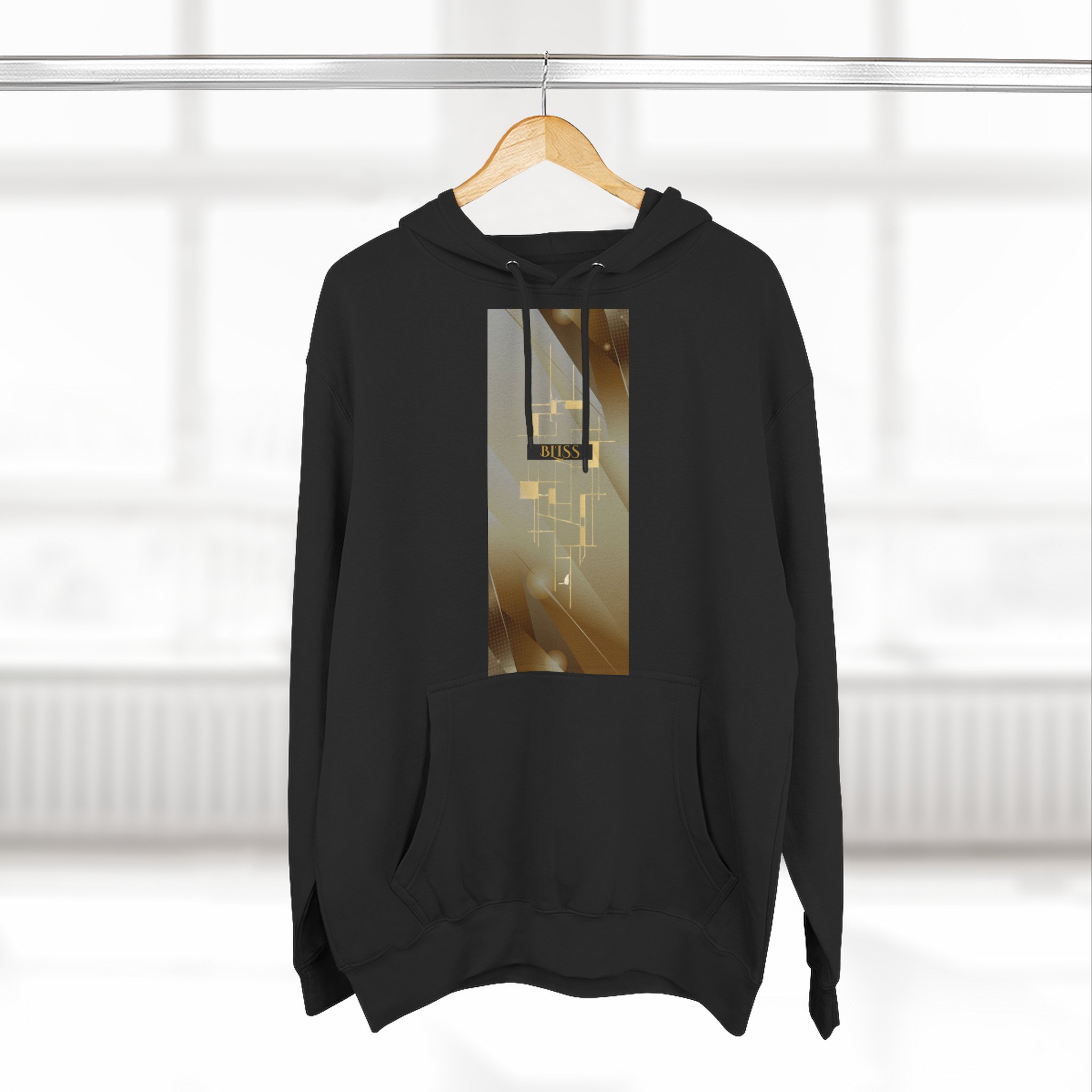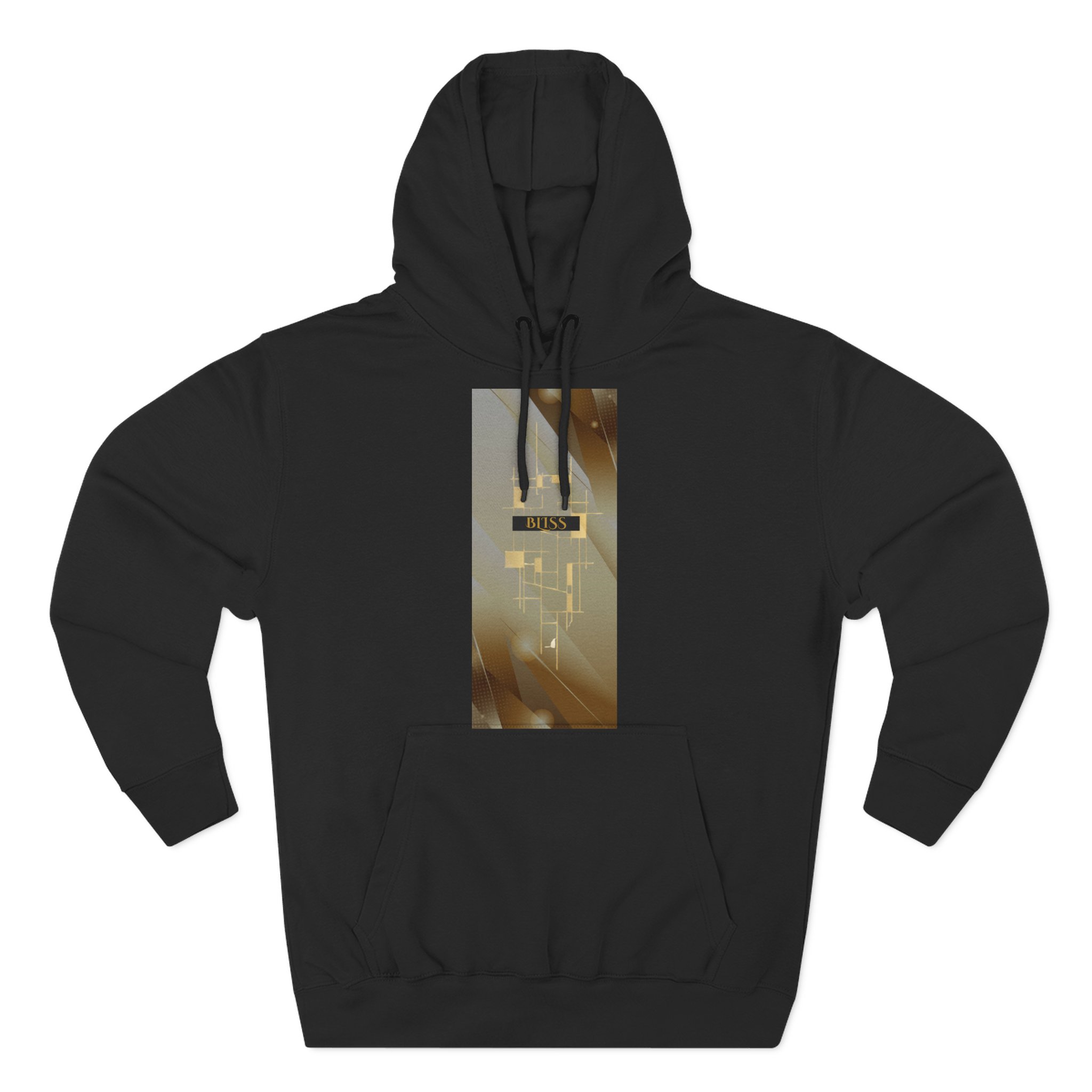 BLISS Limited Edition Hoodie – Abstract Gold Rectangle Graphic Premium limited design minimalist medium-weight fleece hoodie that feels like slipping into a quiet evening. The three-panel hood and adjustable drawstrings frame your face while the roomy kangaroo pocket warms your hands. The soft, brushed exterior and sturdy construction make this hoodie comfortable for long days and late-night walks. Subtle embroidery options at the left or center chest keep the look refined, while the vertical photographic panel design on the front adds a cinematic, moody vibe — like a streetlight halo through rain. It settles into everyday wear: layered over tees for city errands, pulled on after a studio session, or worn during slow mornings with coffee and a book.