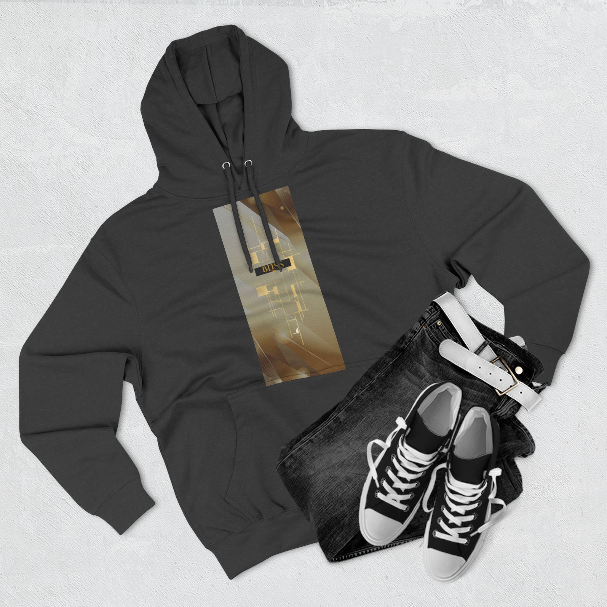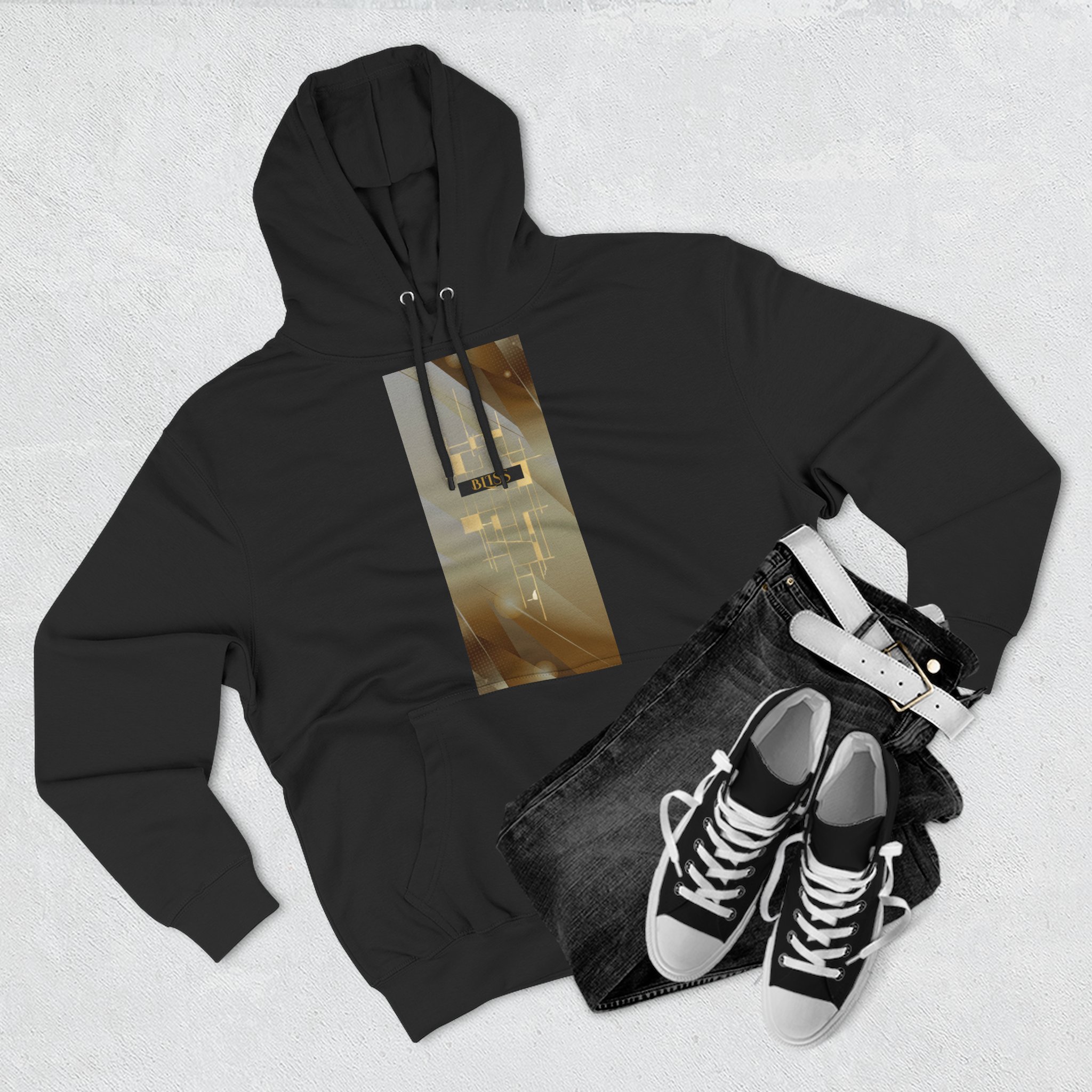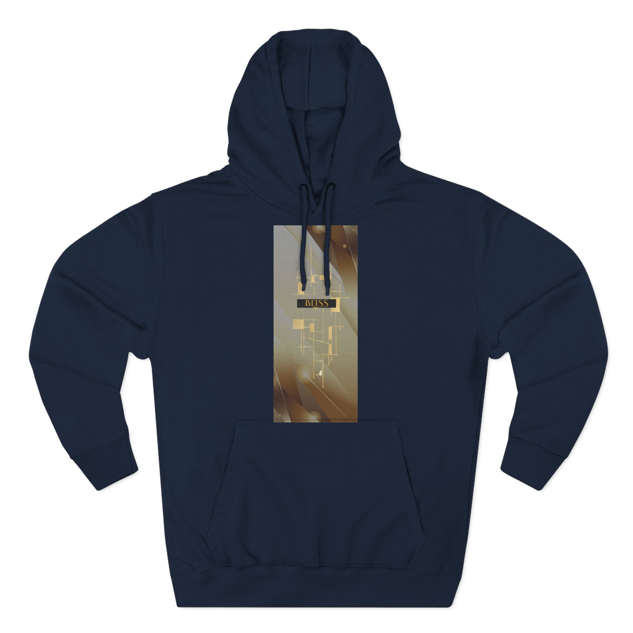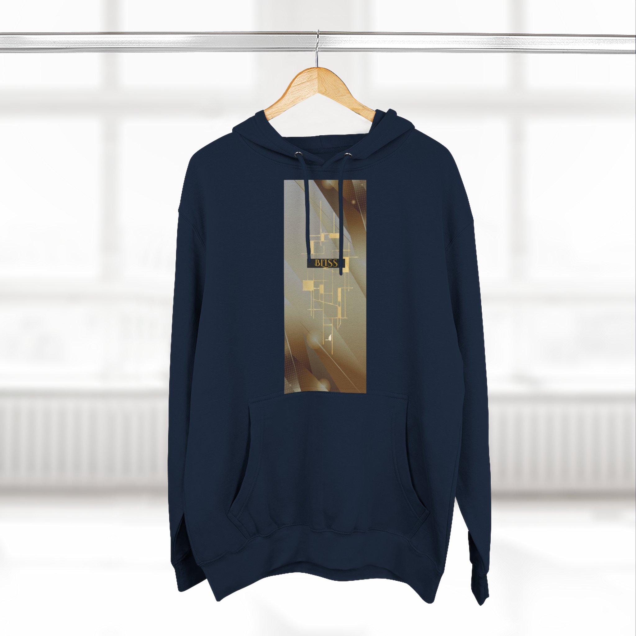 BLISS Limited Edition Hoodie – Abstract Gold Rectangle Graphic Premium limited design minimalist medium-weight fleece hoodie that feels like slipping into a quiet evening. The three-panel hood and adjustable drawstrings frame your face while the roomy kangaroo pocket warms your hands. The soft, brushed exterior and sturdy construction make this hoodie comfortable for long days and late-night walks. Subtle embroidery options at the left or center chest keep the look refined, while the vertical photographic panel design on the front adds a cinematic, moody vibe — like a streetlight halo through rain. It settles into everyday wear: layered over tees for city errands, pulled on after a studio session, or worn during slow mornings with coffee and a book.