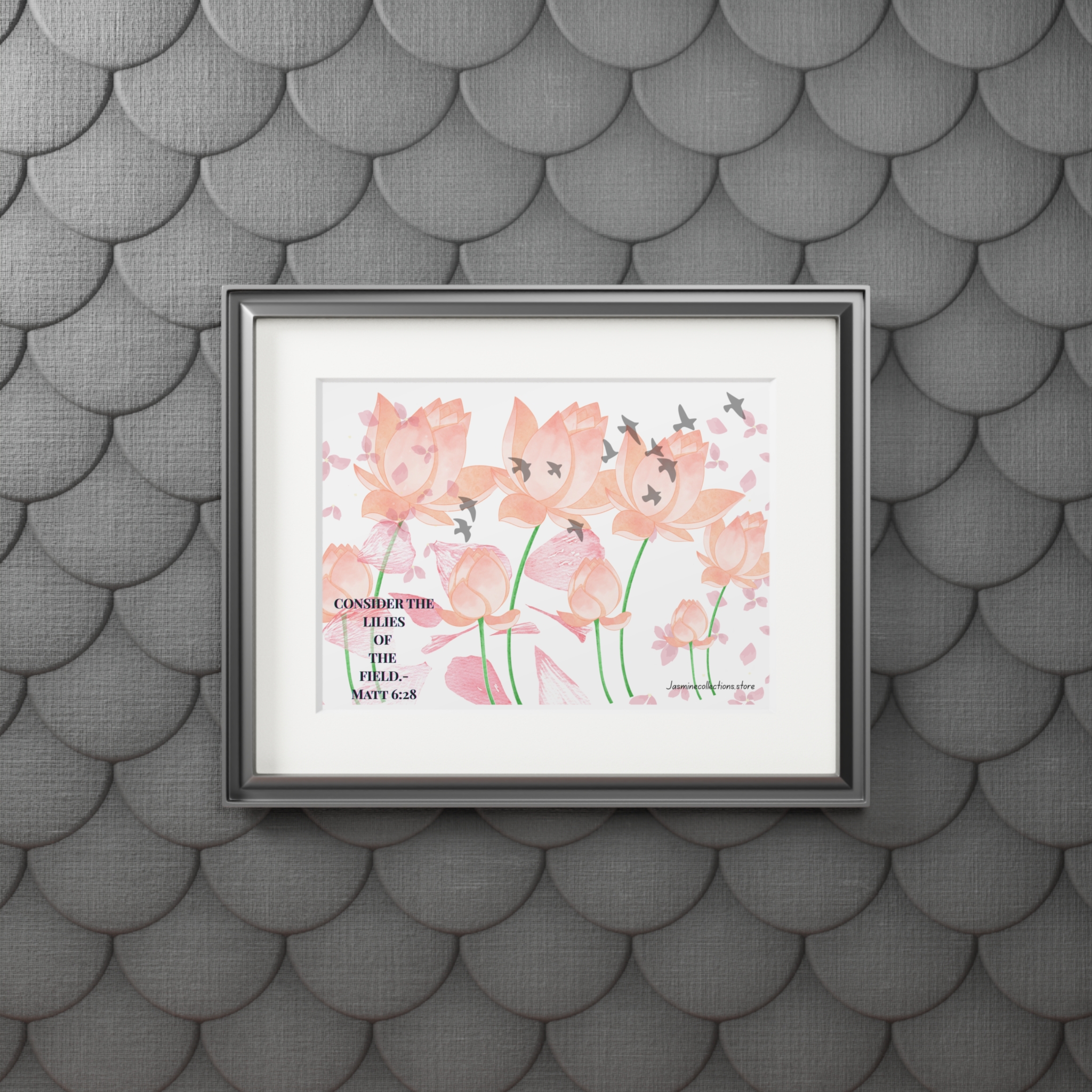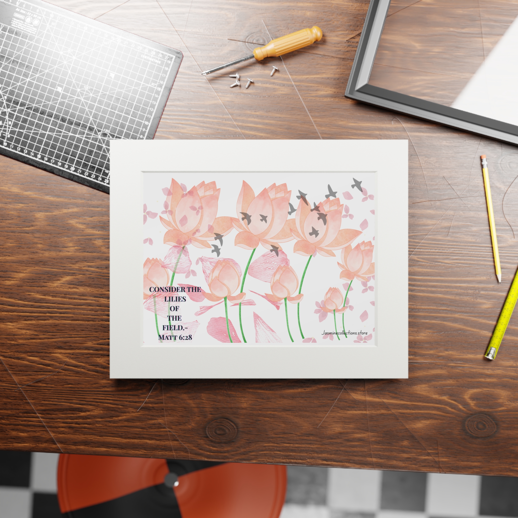 Be the first to review “Consider the Lilies Bible Fine Art Print — Pink Tulips with Birds & Bible Verse (Matthew 6:28) — Passepartout Frame”