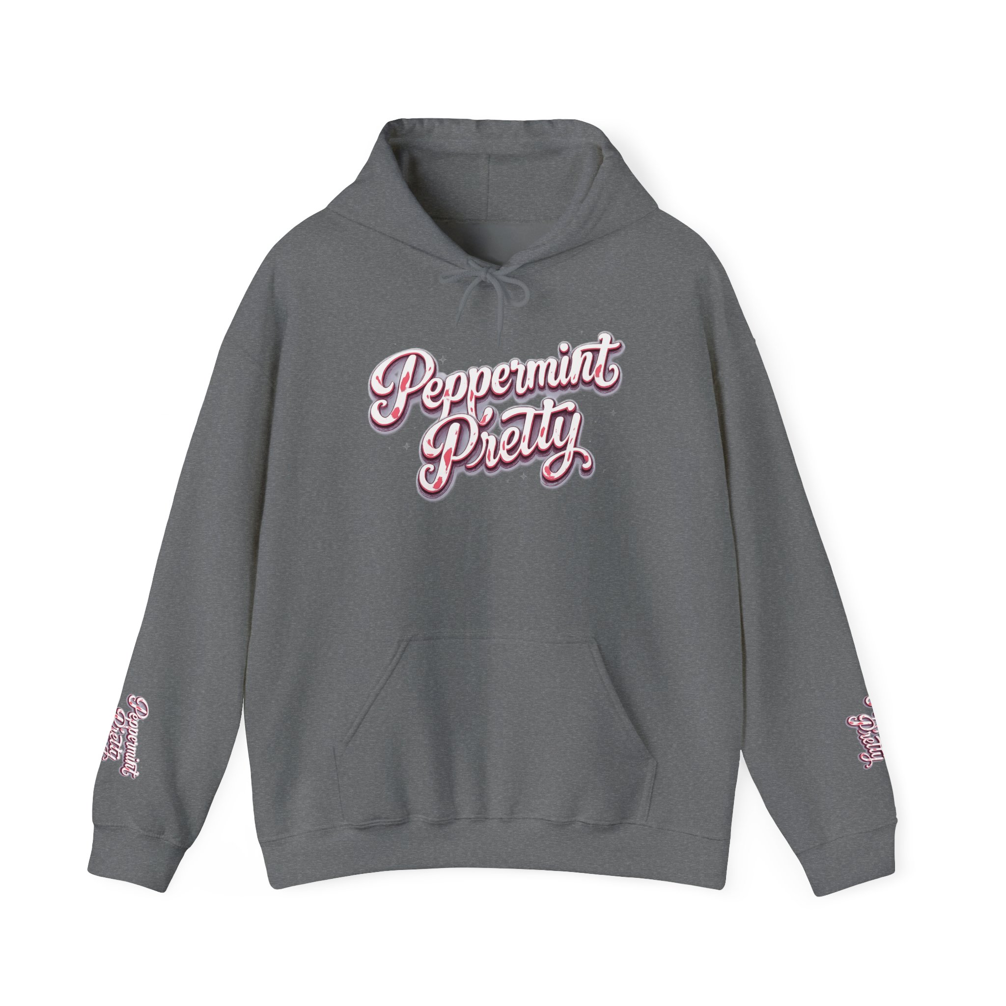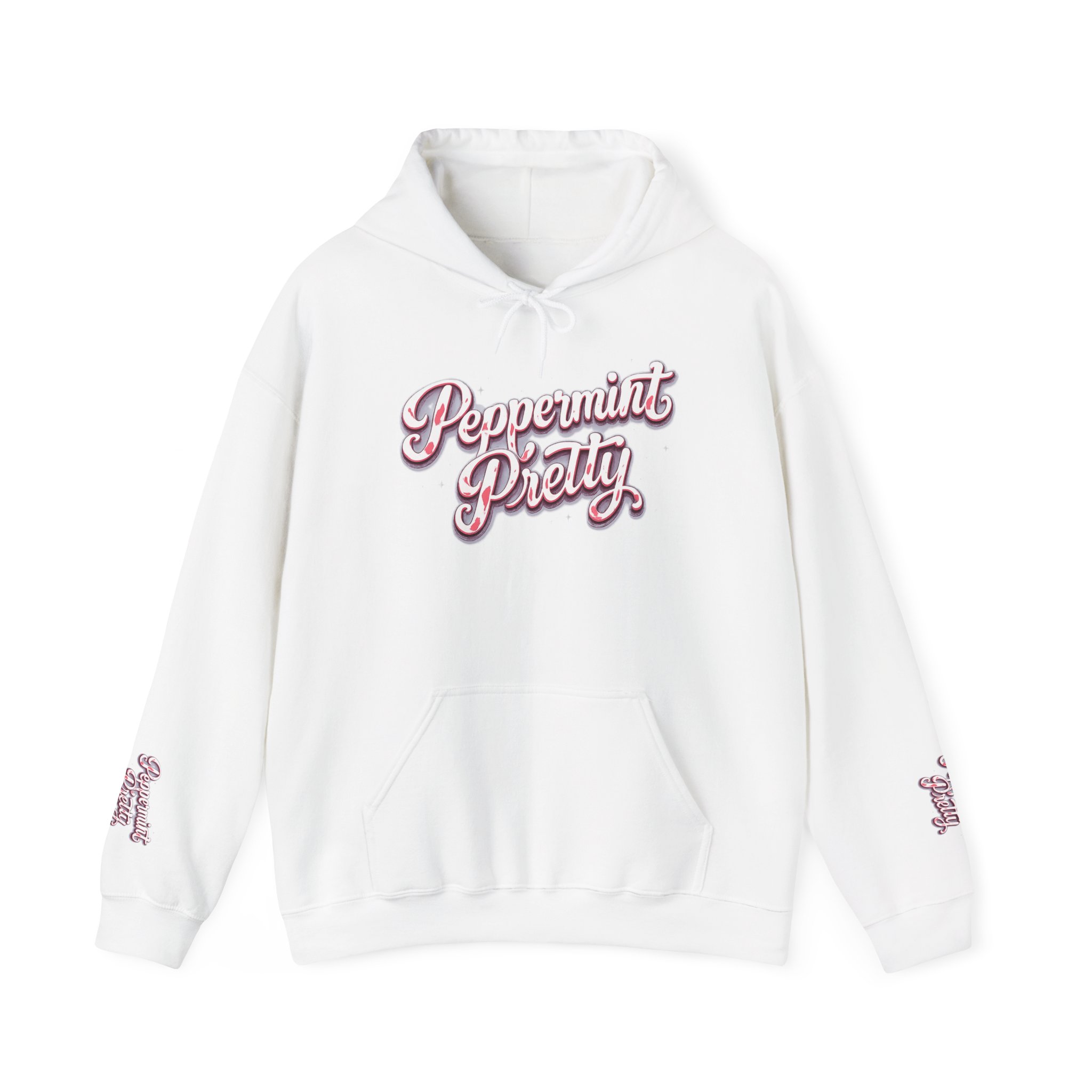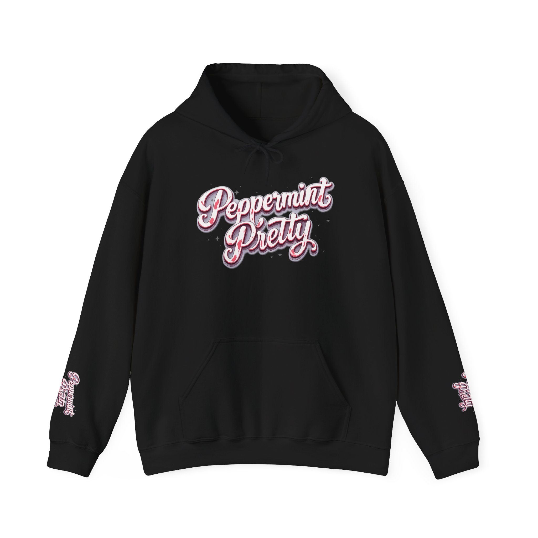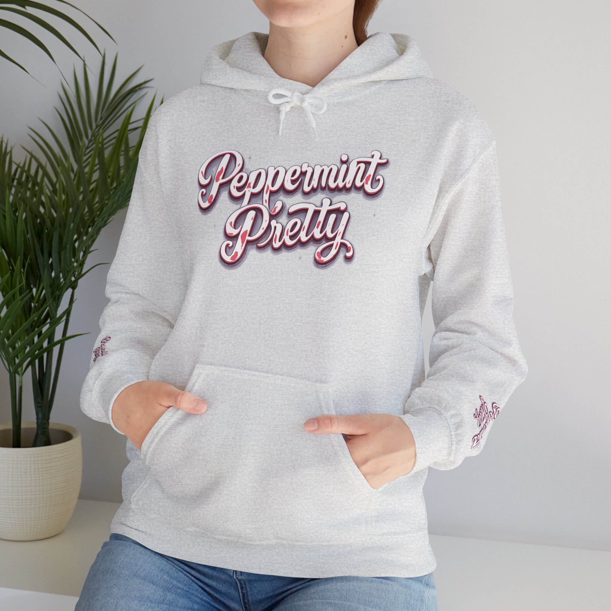 This cozy hooded sweatshirt wraps you in soft warmth while carrying a playful, retro-inspired vibe. A glossy, candy-striped script reading “Peppermint Pretty” sits centered on the chest in rosy pinks and subtle shadows, while matching mini graphics adorn each sleeve for a cohesive, styled look. The roomy kangaroo pocket and double-lined hood add everyday comfort, and the medium-heavy cotton/poly blend gives structure without stiffness. Wear it on crisp mornings, during late-night drives, or at holiday gatherings to bring a touch of sweet nostalgia to your outfit.