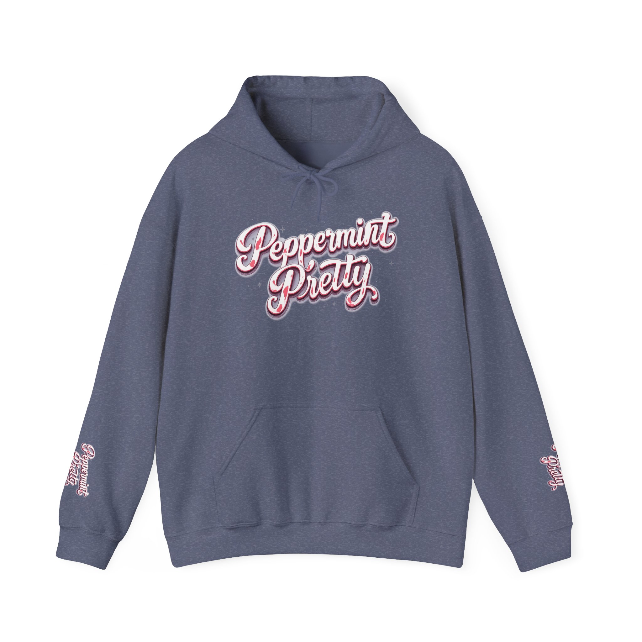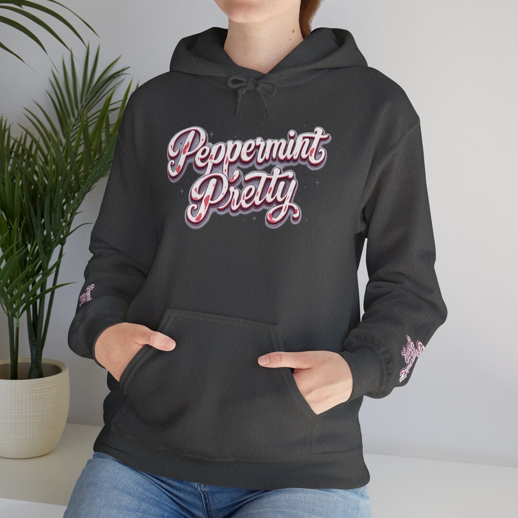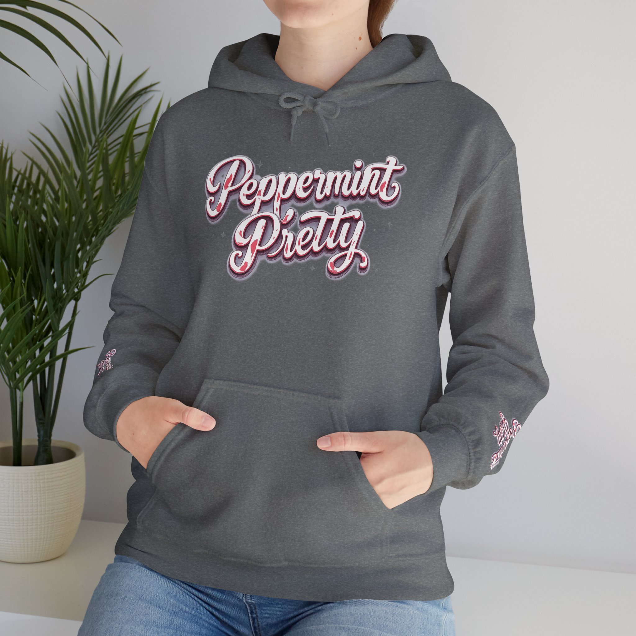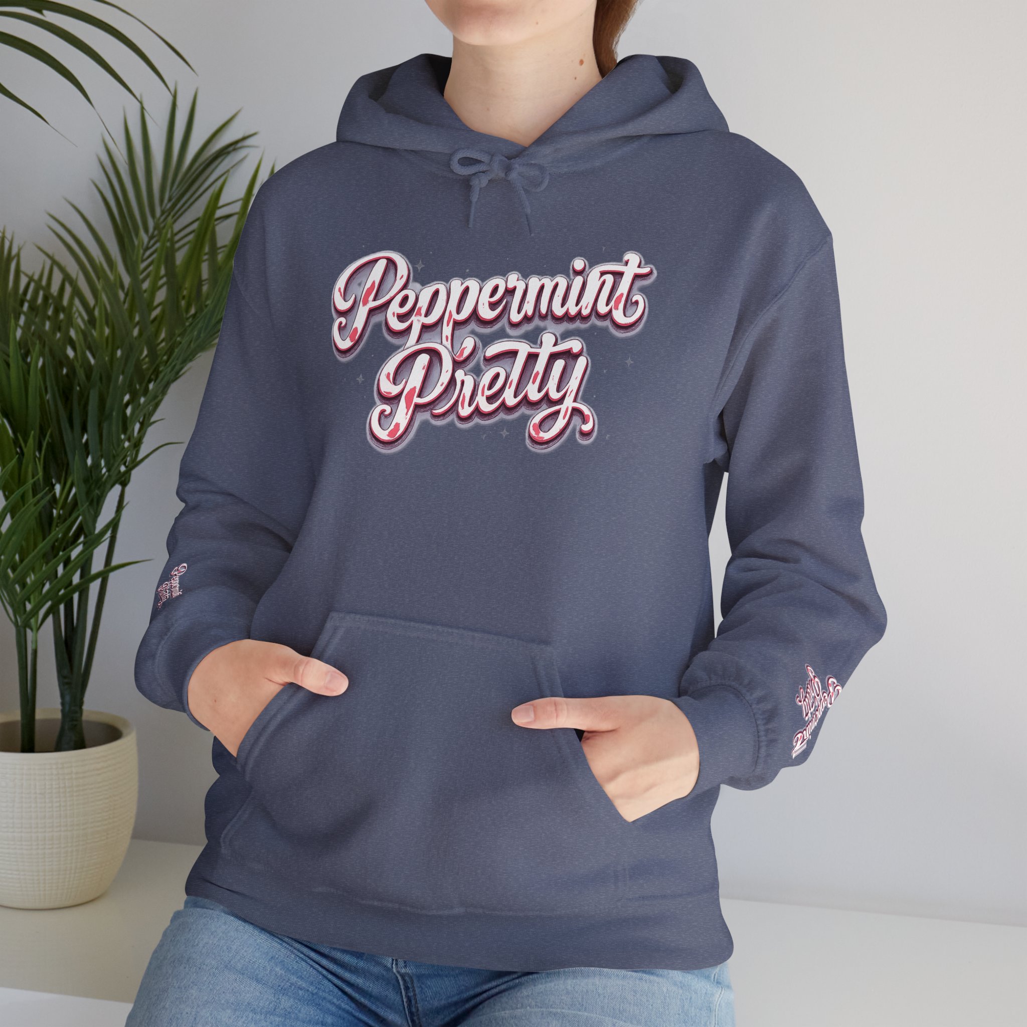 This cozy hooded sweatshirt wraps you in soft warmth while carrying a playful, retro-inspired vibe. A glossy, candy-striped script reading “Peppermint Pretty” sits centered on the chest in rosy pinks and subtle shadows, while matching mini graphics adorn each sleeve for a cohesive, styled look. The roomy kangaroo pocket and double-lined hood add everyday comfort, and the medium-heavy cotton/poly blend gives structure without stiffness. Wear it on crisp mornings, during late-night drives, or at holiday gatherings to bring a touch of sweet nostalgia to your outfit.