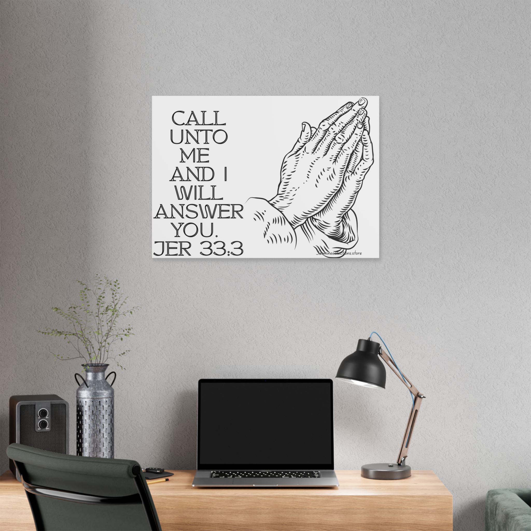 A prayerful stretched canvas that brings quiet assurance to your wall. This piece pairs a classic black-and-white illustration of folded hands with the comforting scripture line “Call unto me and I will answer you. Jer 33:3,” rendered in a clean, readable type. The muted palette and hand-drawn style create a calm, contemplative focal point — a visual pause for morning reflection, evening prayer, or a peaceful corner in a living room or entryway. Lightweight but sturdy, it hangs easily and wears well over time, becoming a gentle reminder of hope and presence in everyday moments.