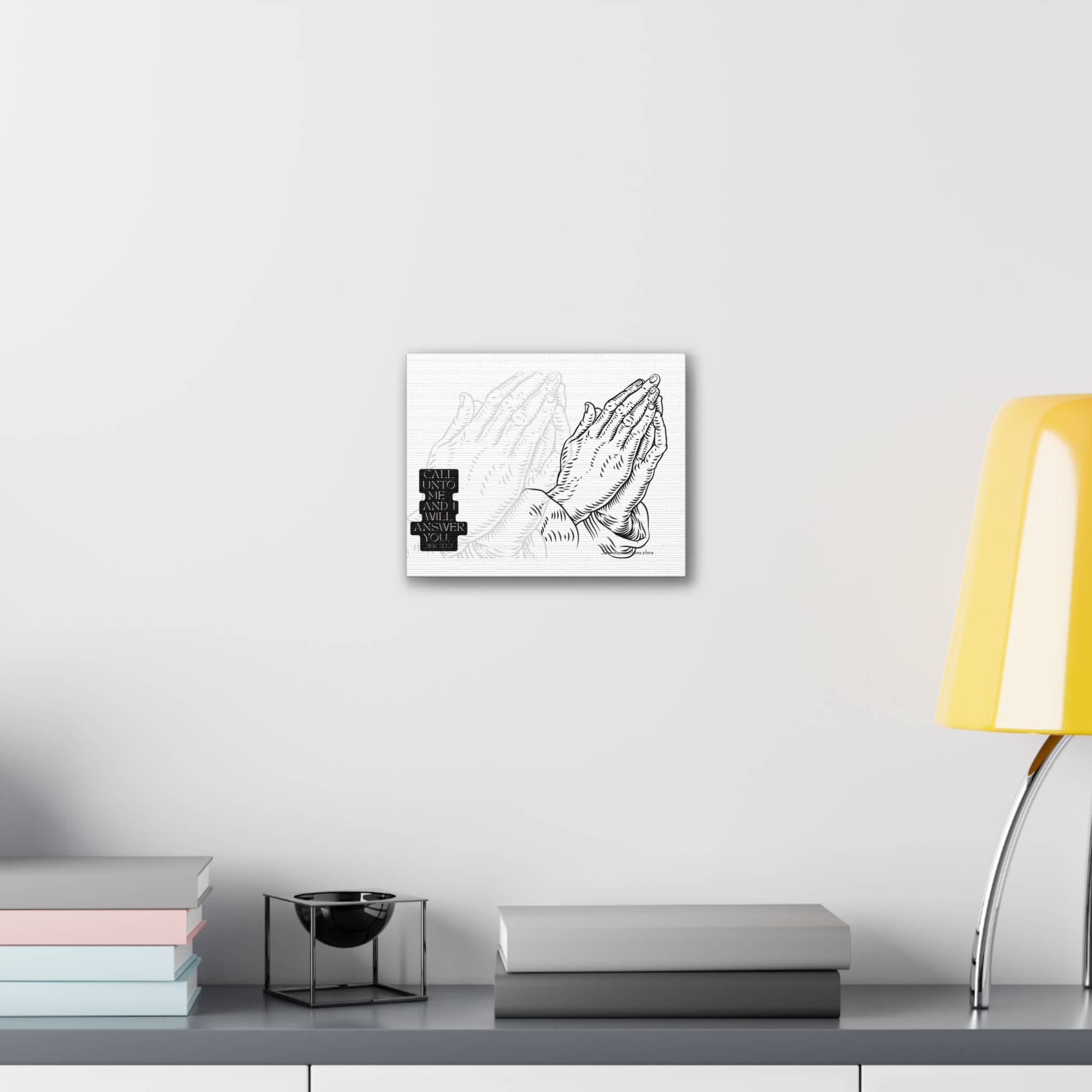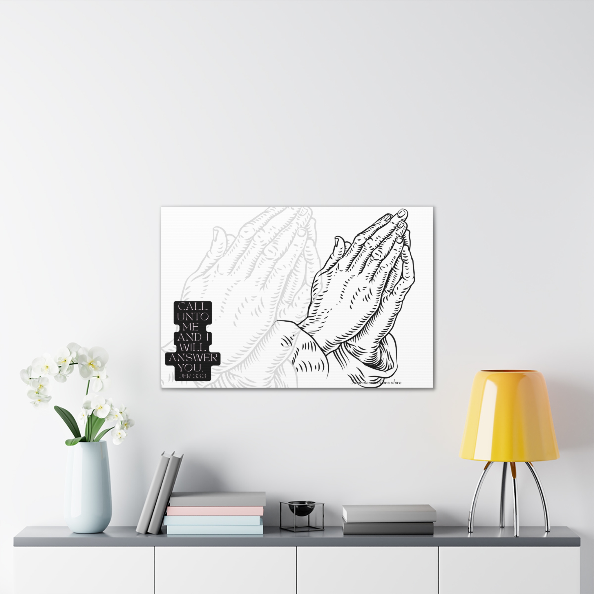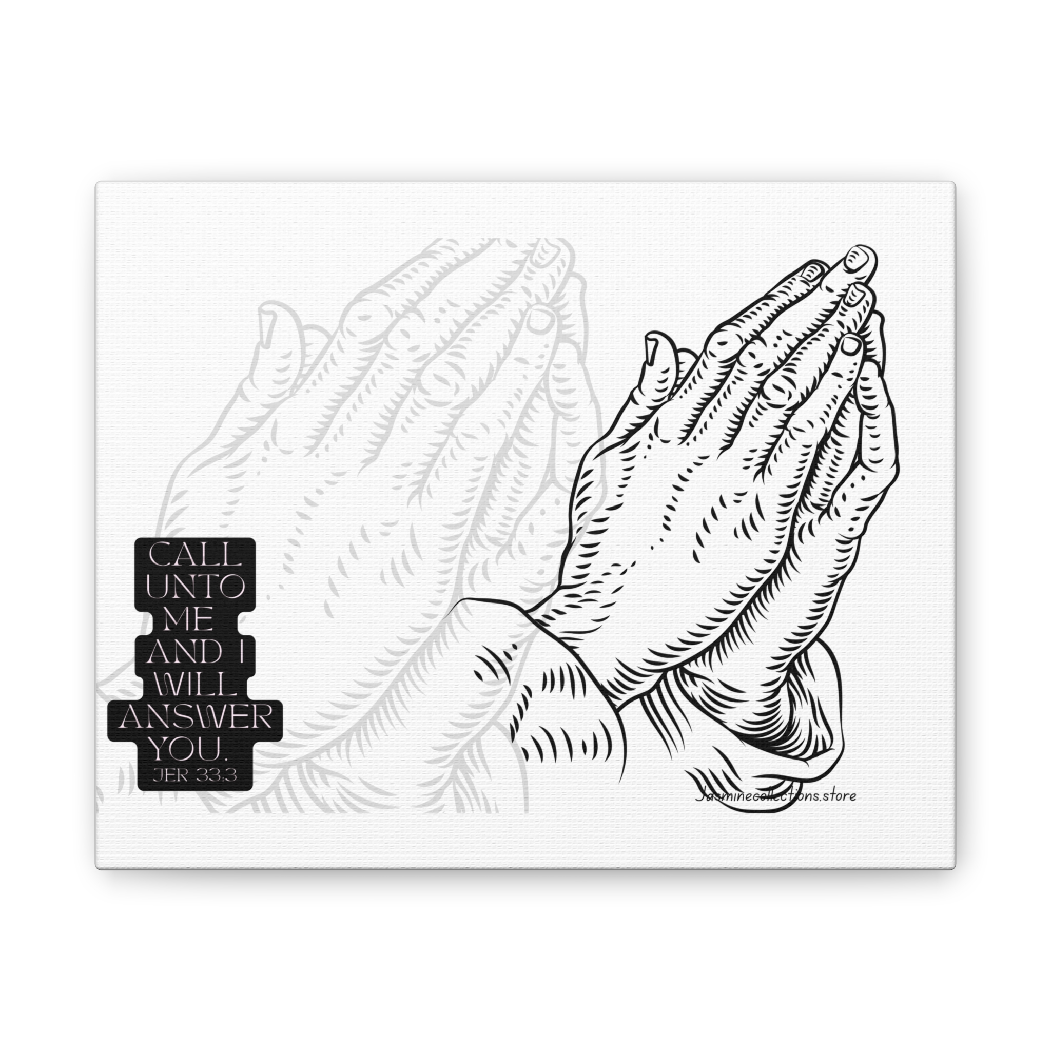 A framed stretched canvas that brings quiet strength to a wall. This 0.75″ pinewood-stretcher canvas features a hand-inked prayer-hands illustration and a small scripture block, printed in crisp black on bright white to read like a modern devotional sketch. The substantial polyester canvas and vivid printing keep every line sharp, while the slim pine frame gives a clean, gallery-ready profile. Hang it in a reading nook, over a mantel, or in a prayer corner to create a focused, calm spot for reflection or daily pause.