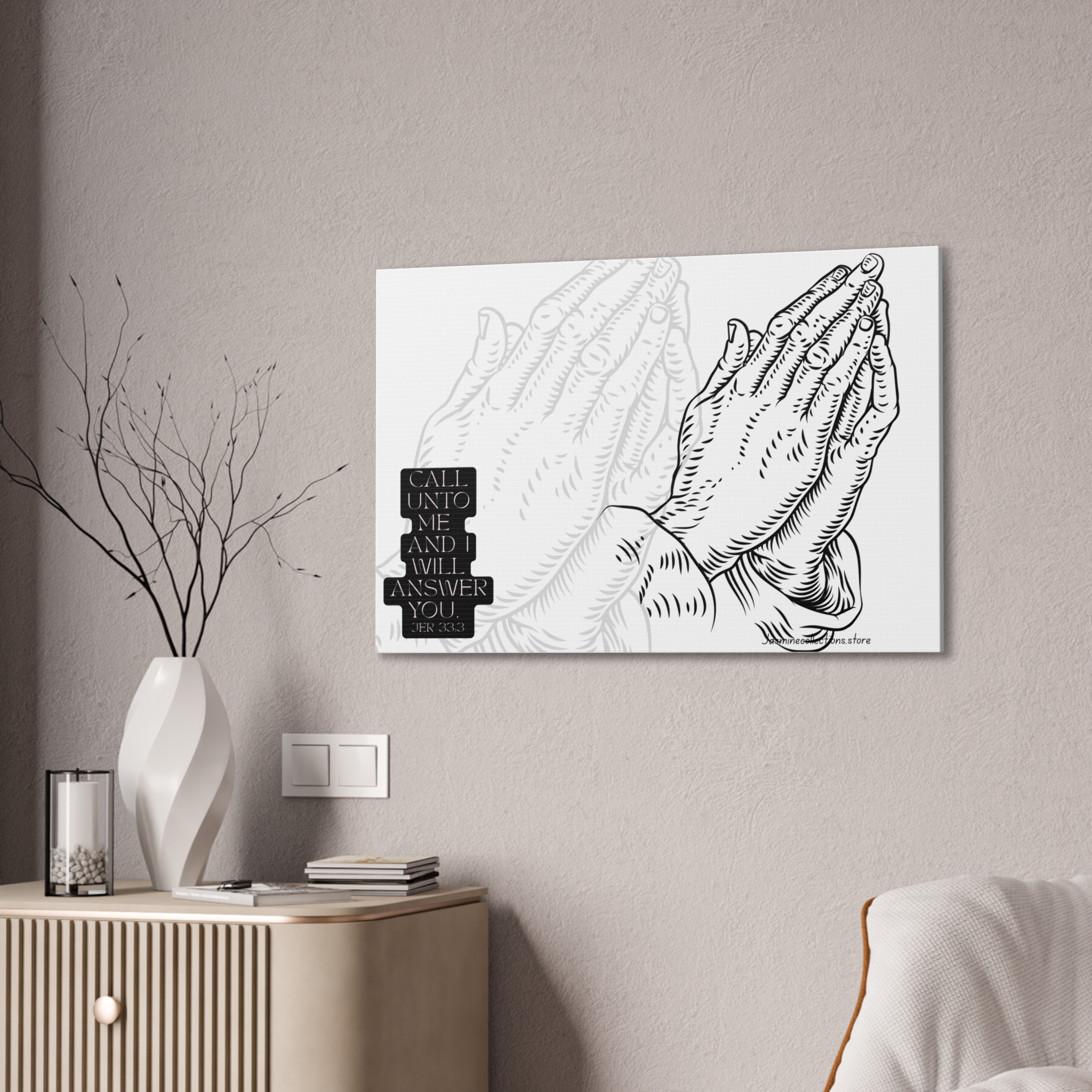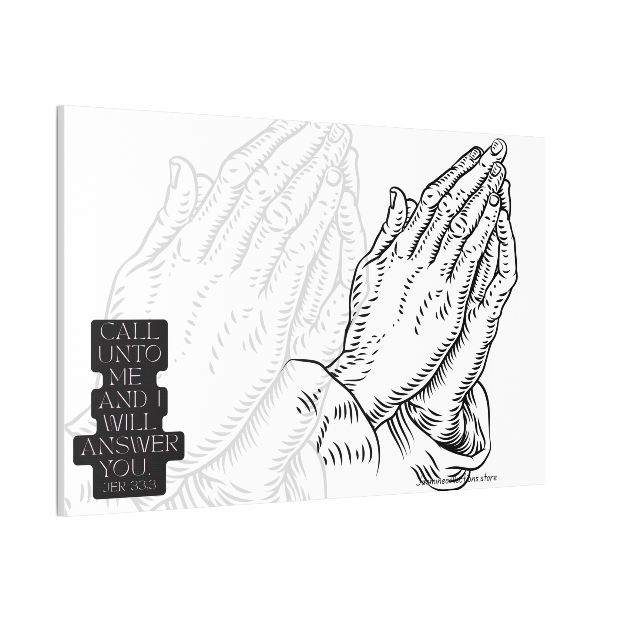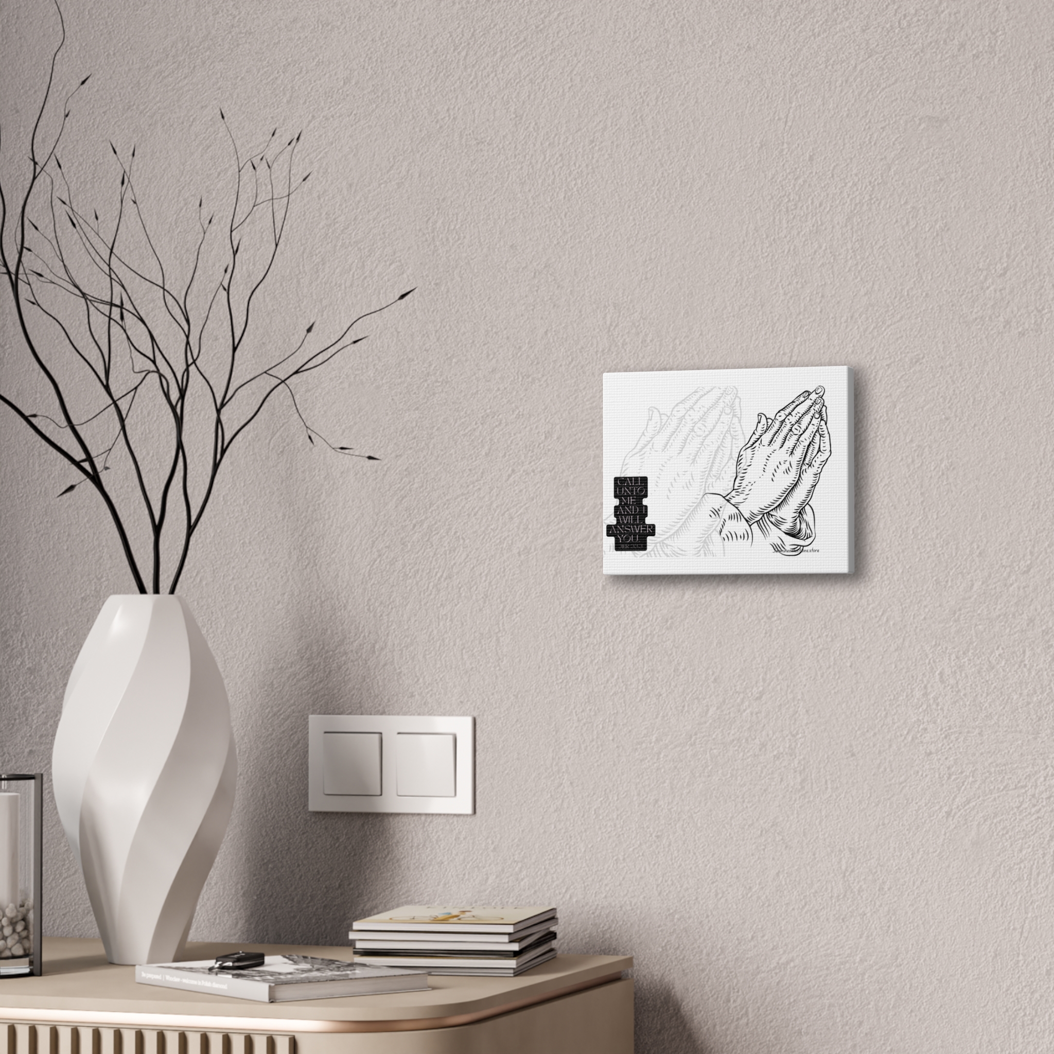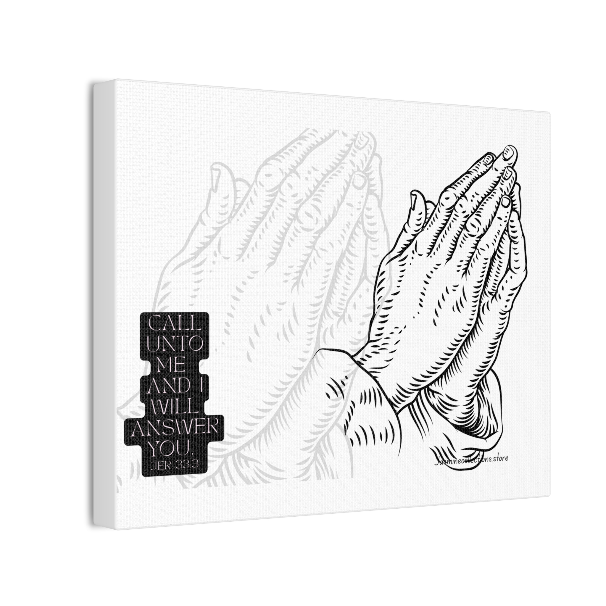 A framed stretched canvas that brings quiet strength to a wall. This 0.75″ pinewood-stretcher canvas features a hand-inked prayer-hands illustration and a small scripture block, printed in crisp black on bright white to read like a modern devotional sketch. The substantial polyester canvas and vivid printing keep every line sharp, while the slim pine frame gives a clean, gallery-ready profile. Hang it in a reading nook, over a mantel, or in a prayer corner to create a focused, calm spot for reflection or daily pause.