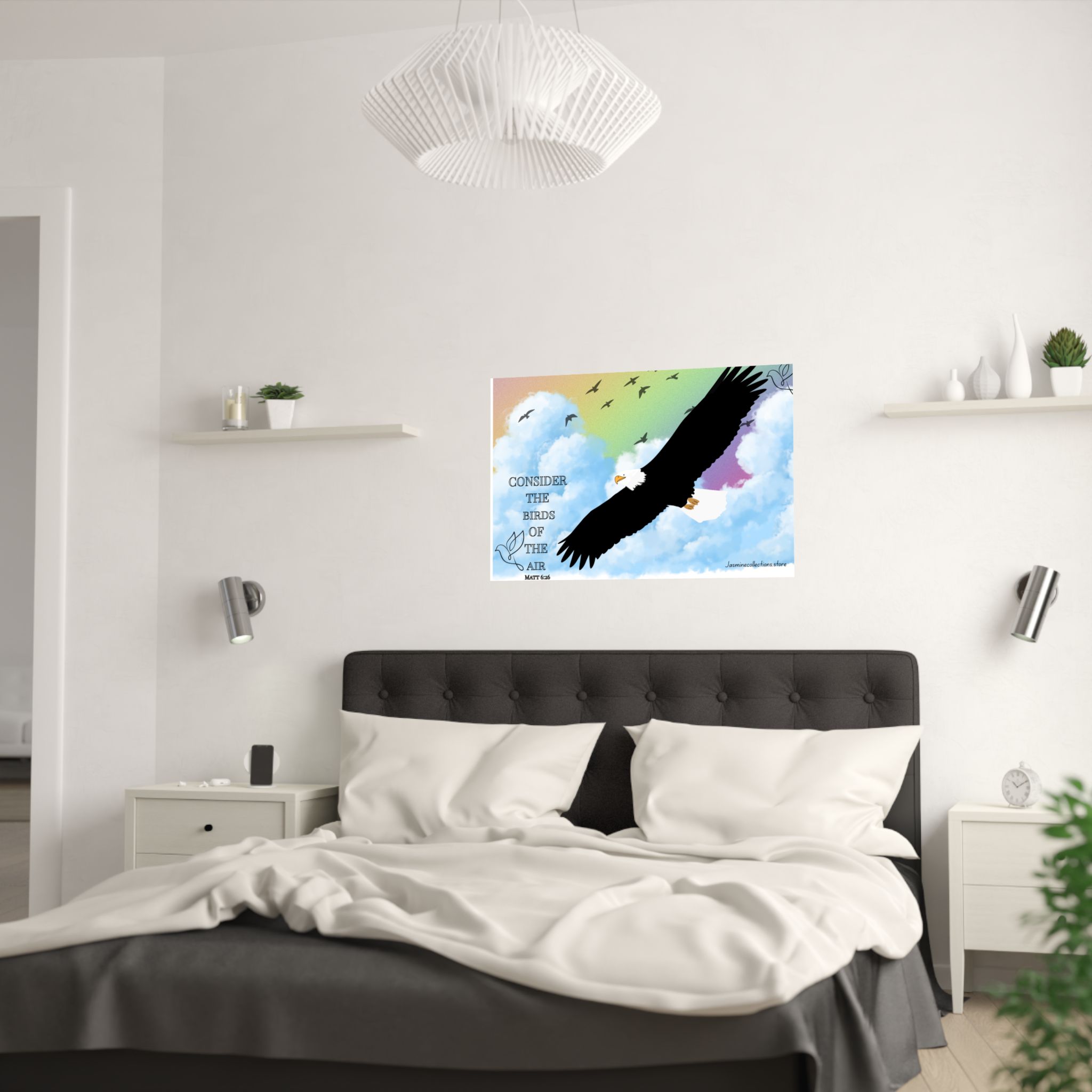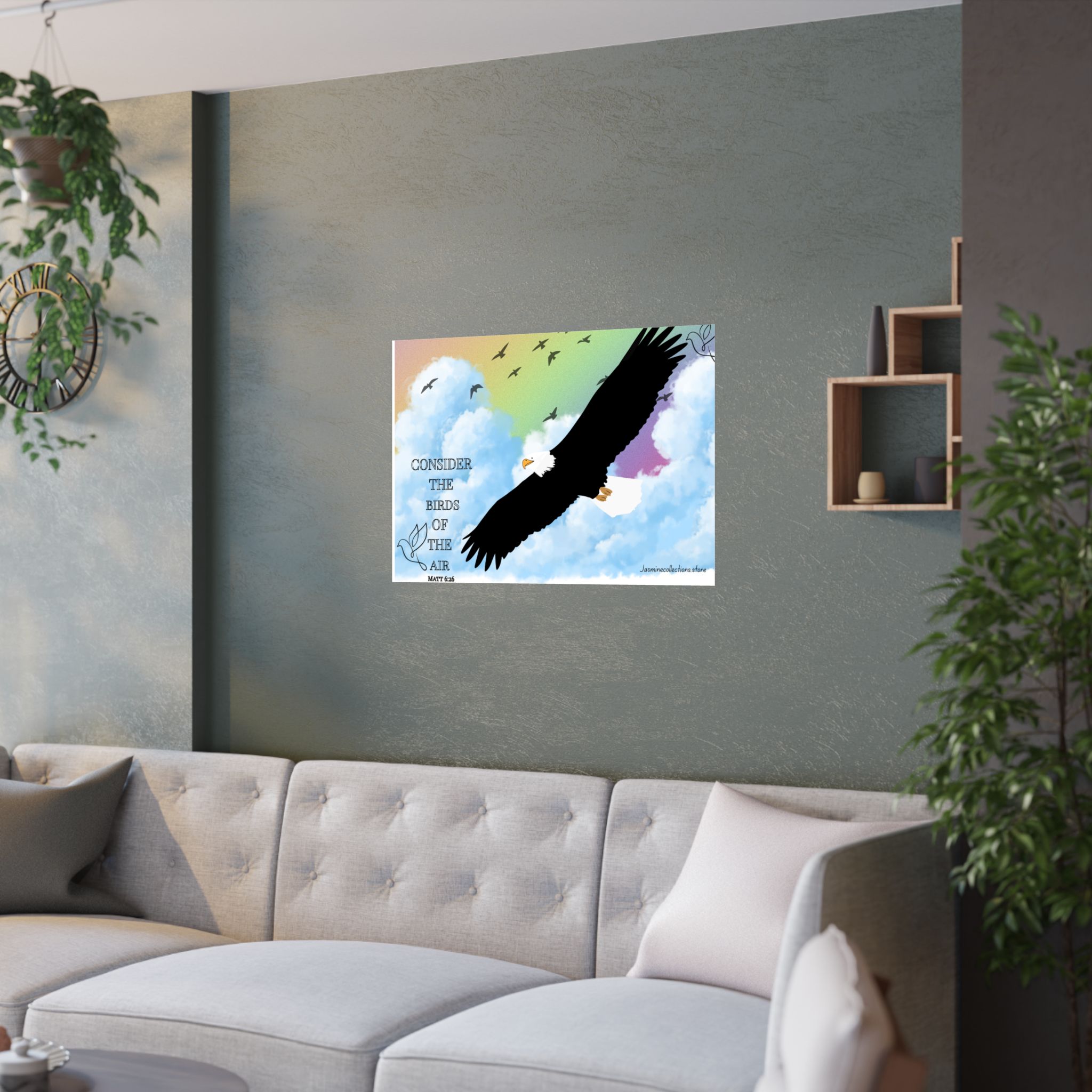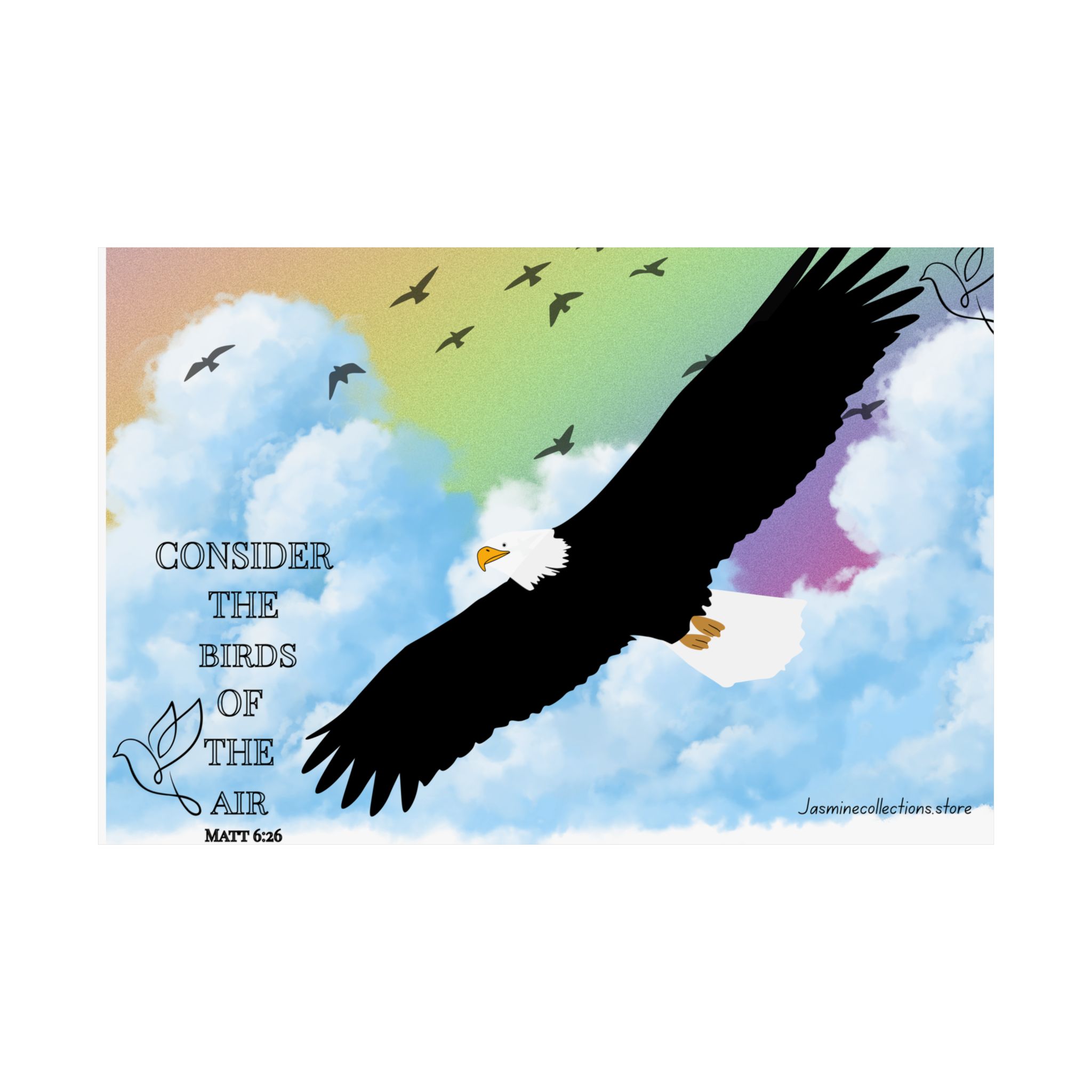 A vivid satin poster that brings a peaceful, uplifting moment into any room. A bold eagle soars across soft, painted clouds with a gentle rainbow wash behind it. The words “Consider the birds of the air” sit quietly to the side, giving the image a contemplative, hopeful tone. Printed on smooth, low-glare museum-grade paper, the image holds crisp detail and bright pigment — a calm focal point whether hung above a desk, in a reading nook, or near a window where morning light gathers. It reads like a small reminder to breathe, look up, and keep faith in the quiet rhythms of life.