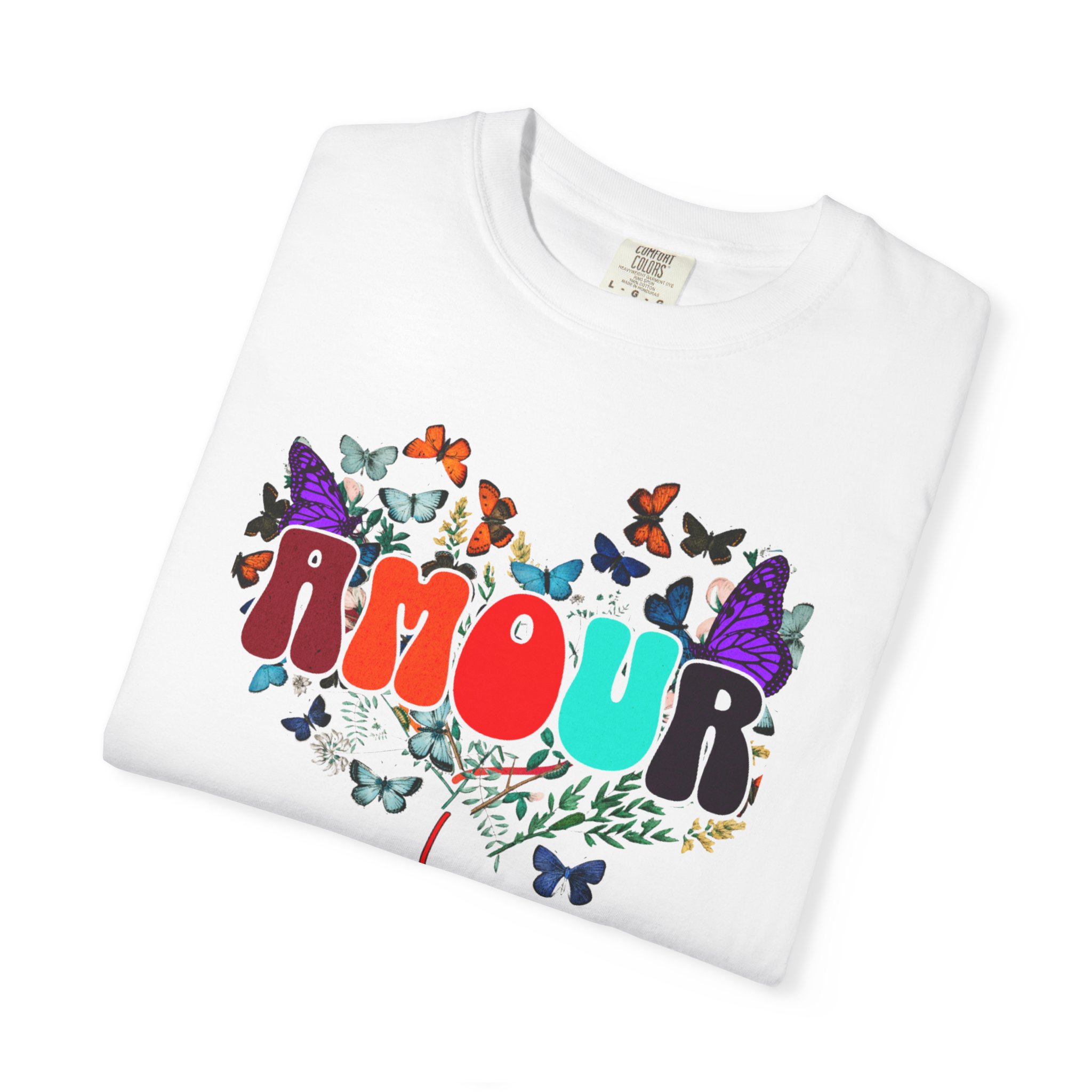 Soft, roomy, and intentionally worn-in — this garment-dyed tee carries a gentle, lived-in feel that matches the relaxed energy of slow afternoons and easy conversations. A collage of colorful butterflies and leafy textures frames the playful “AMOUR vibes” lettering, giving the shirt a slightly vintage, hand-crafted look. It sits loose across the shoulders and drapes comfortably over the body, the heavyweight cotton lending structure while still feeling broken-in thanks to the post-construction dye. Wear it on coffee runs, gallery strolls, or long drives with the windows down; it reads like a quiet statement of warmth and gentle optimism.
