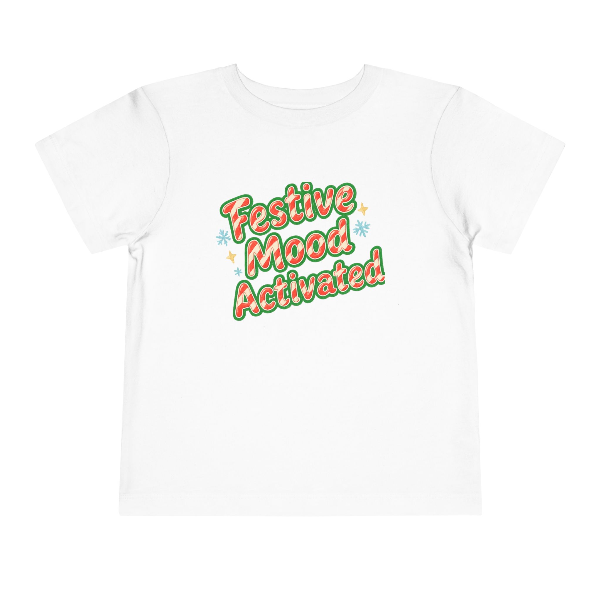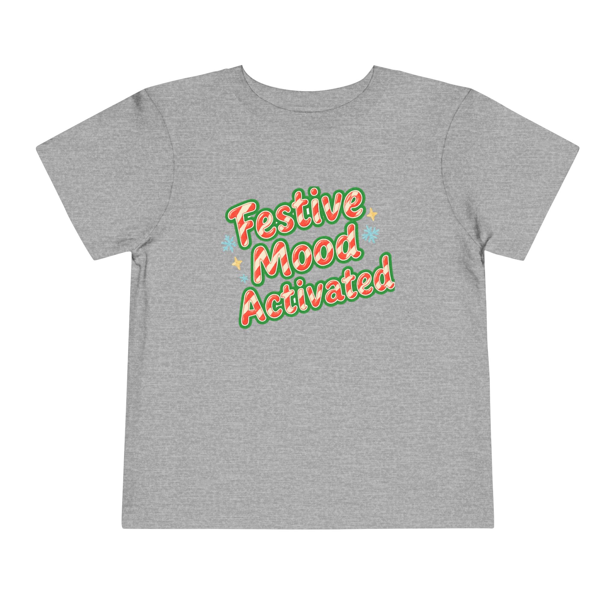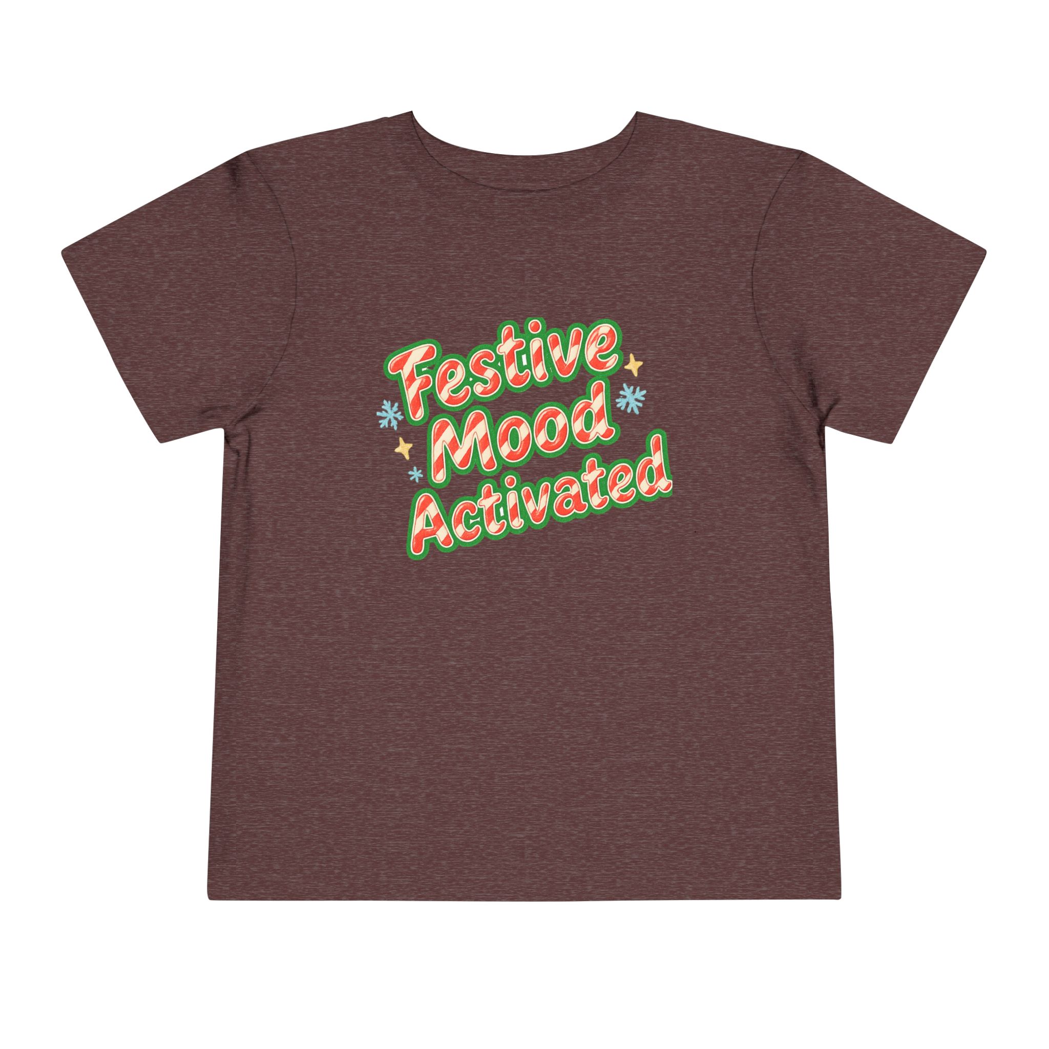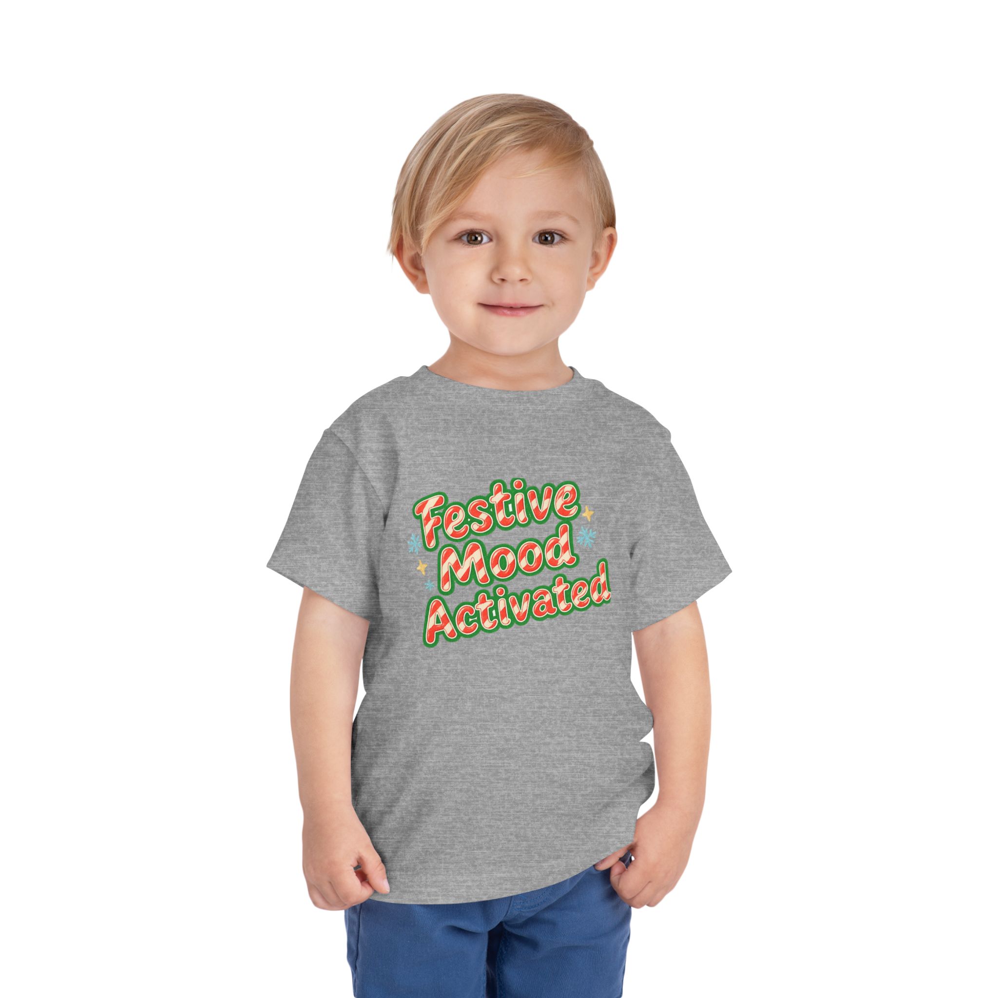 Little holiday mischief, ready to wear. This toddler tee reads “Festive Mood Activated” in candy-cane swirls and warm green shadowing that catches the light with a playful pop. It feels light and airy against tiny skin, moves with the wiggles, and keeps the focus on cookie crumbs and carols — not itchy tags or stiff fabric. Slip it on for tree-trimming, neighborhood strolls to see lights, or laid-back family mornings with cocoa steam and giggles. The vintage-inspired script and subtle sparkle of printed stars bring a cozy, cheerful energy that matches a child’s wide-eyed excitement for seasonal fun.