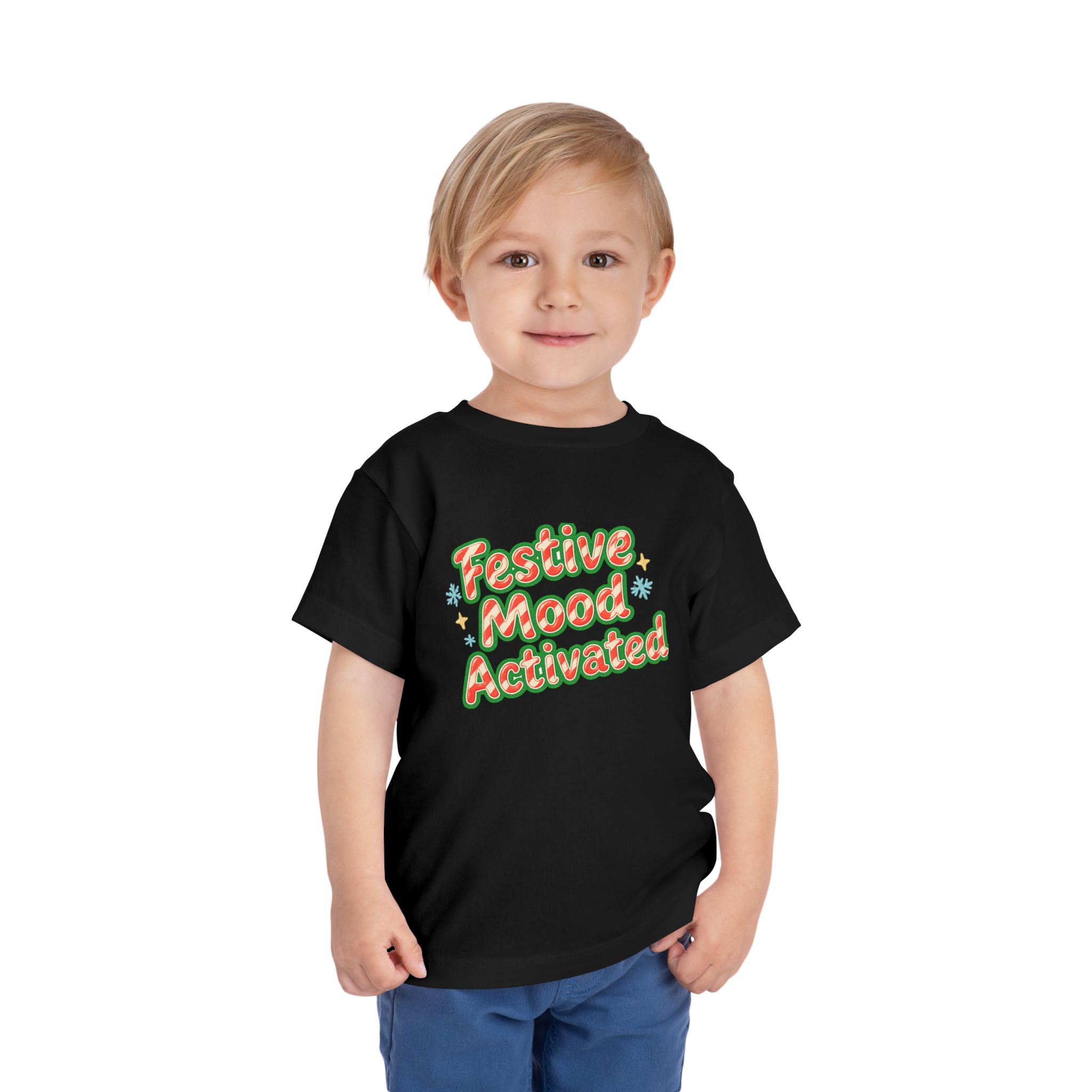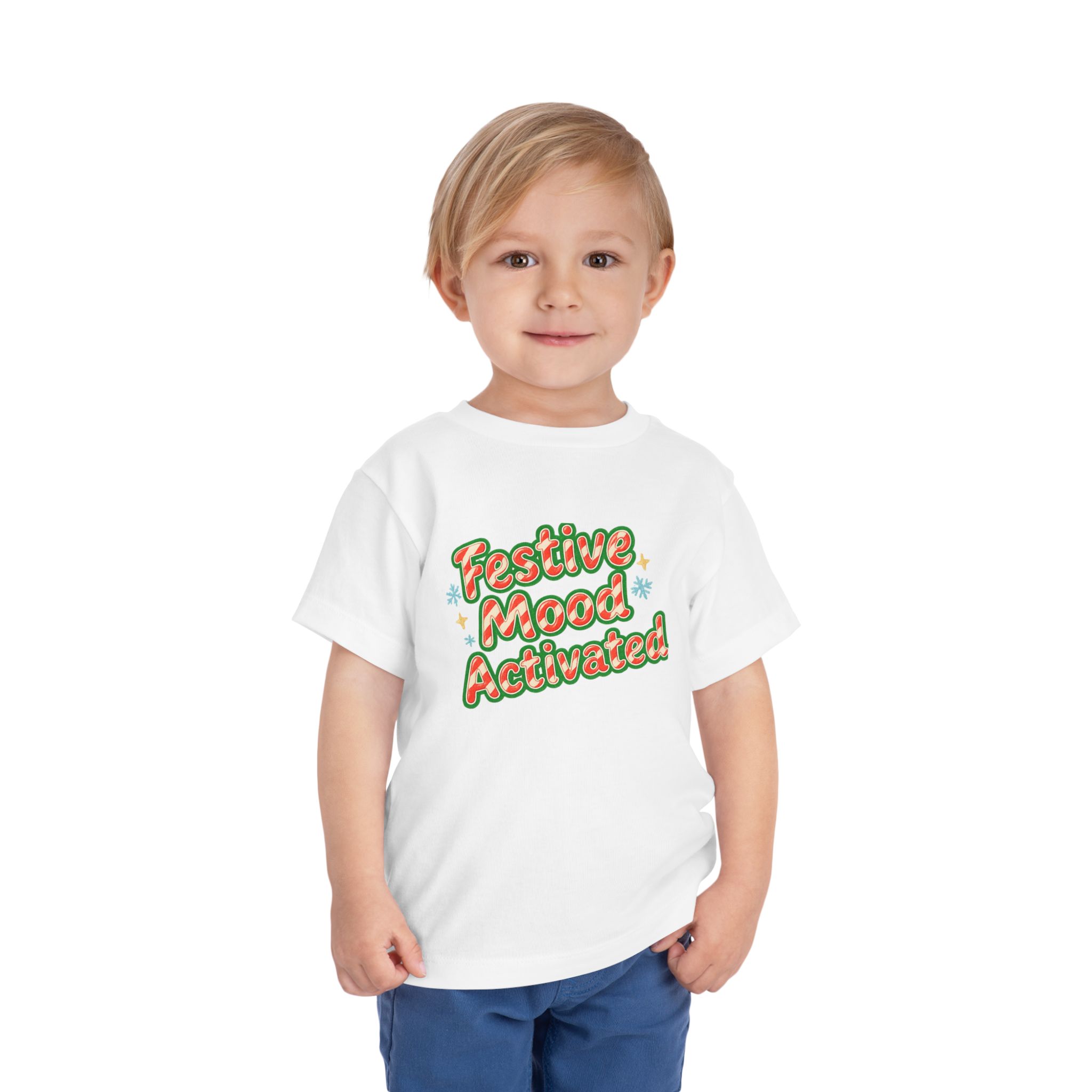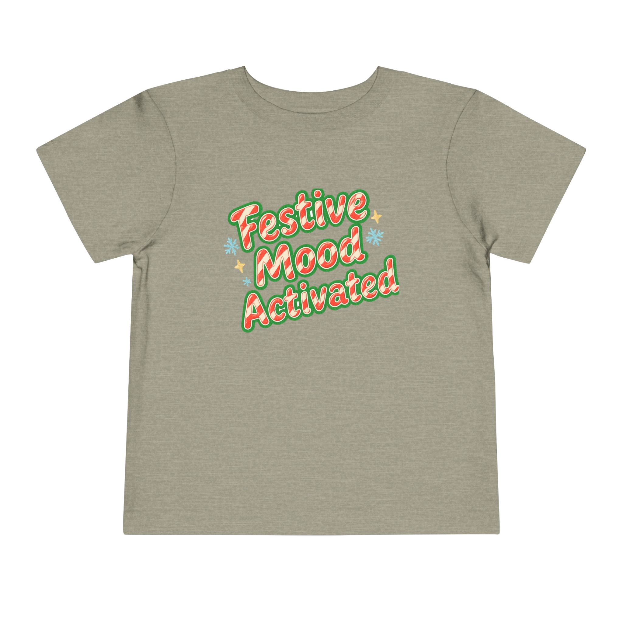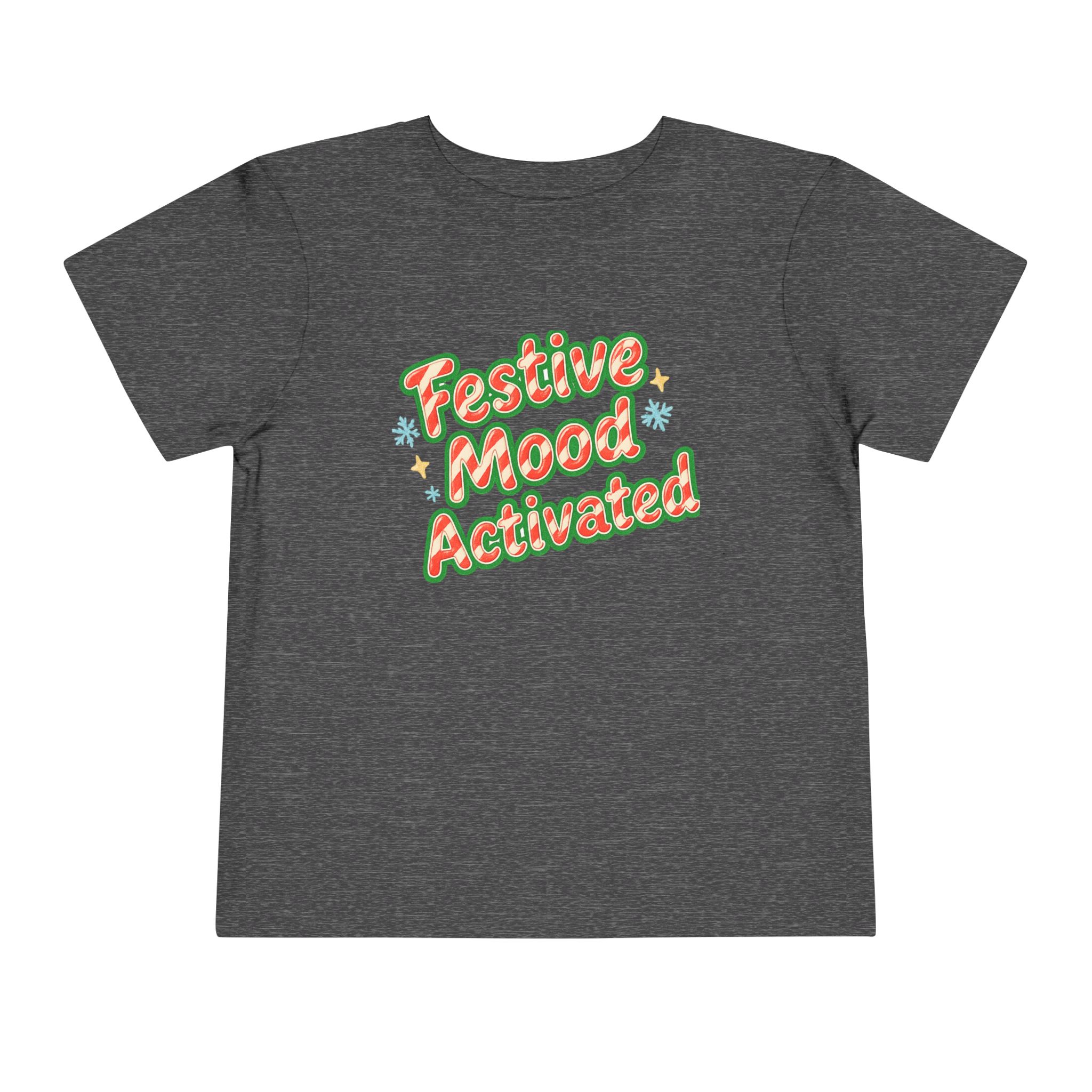 Little holiday mischief, ready to wear. This toddler tee reads “Festive Mood Activated” in candy-cane swirls and warm green shadowing that catches the light with a playful pop. It feels light and airy against tiny skin, moves with the wiggles, and keeps the focus on cookie crumbs and carols — not itchy tags or stiff fabric. Slip it on for tree-trimming, neighborhood strolls to see lights, or laid-back family mornings with cocoa steam and giggles. The vintage-inspired script and subtle sparkle of printed stars bring a cozy, cheerful energy that matches a child’s wide-eyed excitement for seasonal fun.